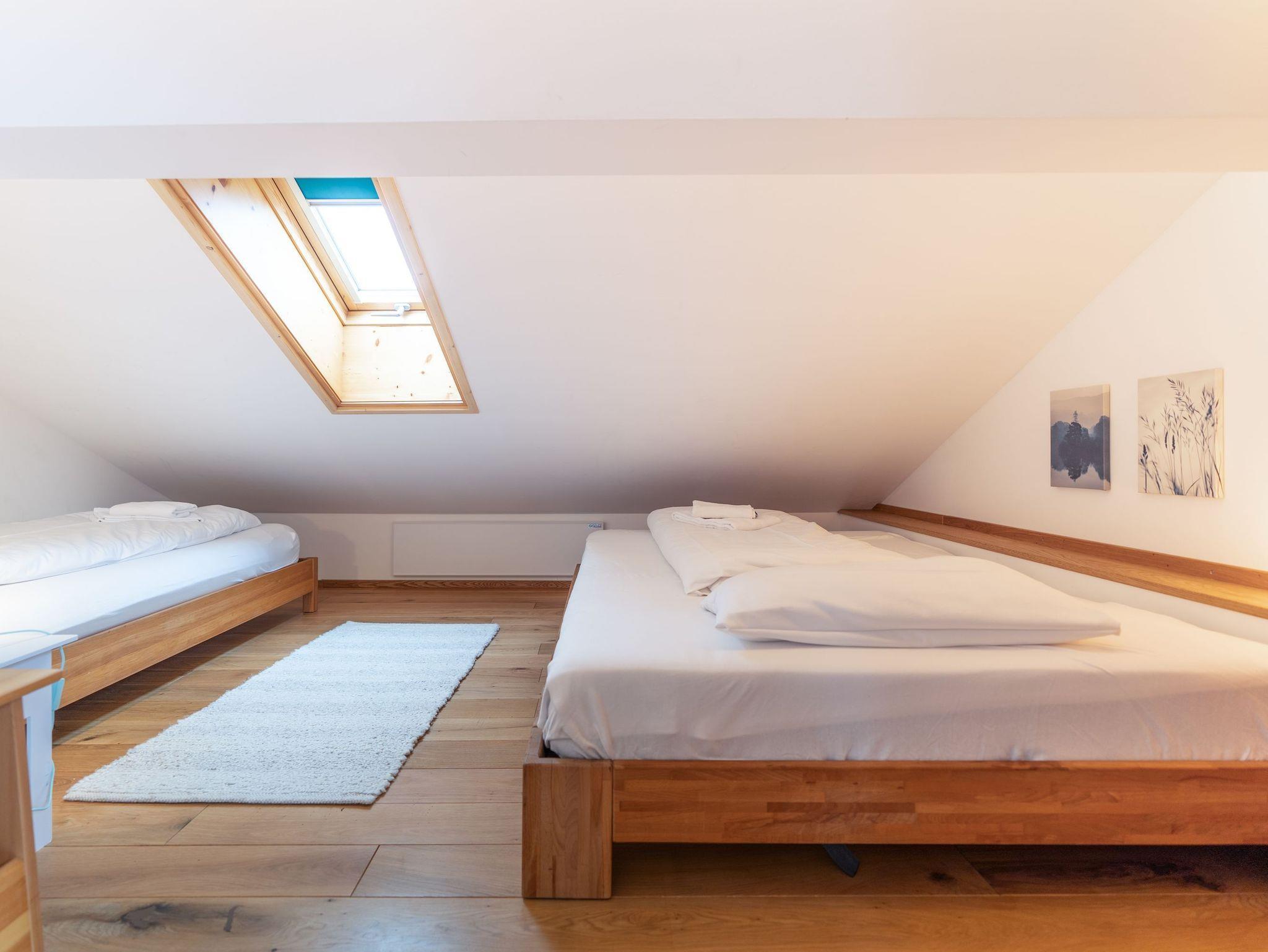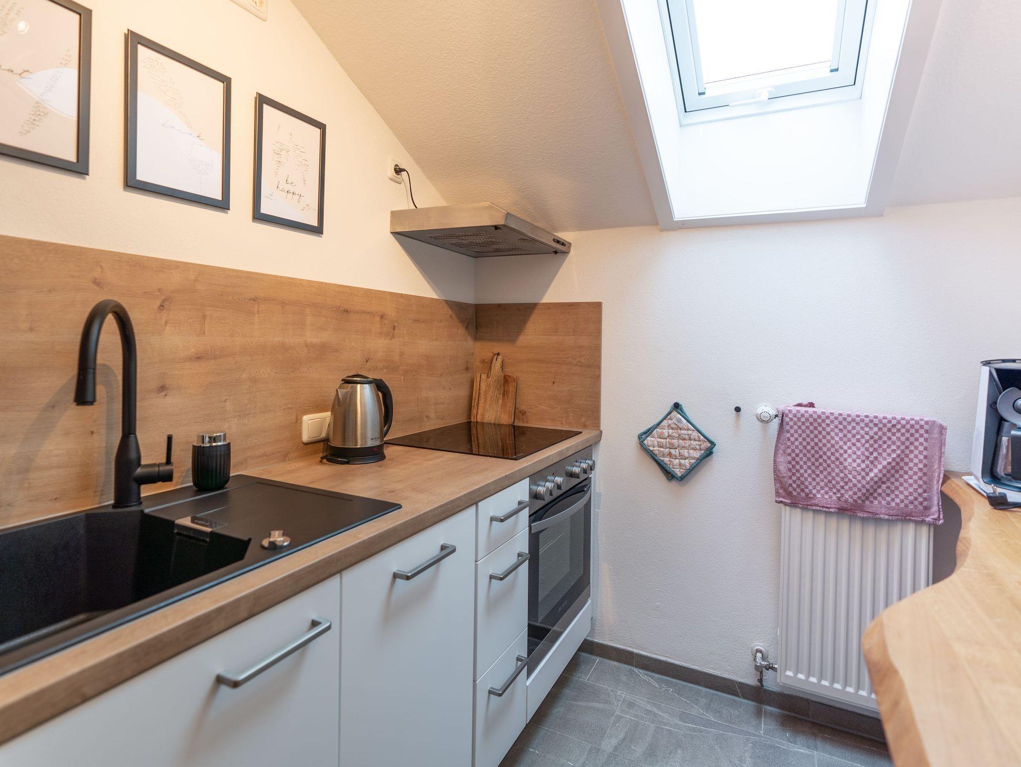 Die neue, helle und gut ausgestattete Ku?che ist modern zum Wohnraum hin geo?ffnet, und schließt direkt an den Essbereich an. Das moderne Badezimmer ist mit Dusche, WC, Föhn und Handtuchheizung ausgestattet. Das in der Dachschräge befindliche Schlafzimmer verfügt über ein französisches- und ein zusätzliches Einzelbett, die Raumhöhe beträgt hier unter 1,50 m. Ein PKW-Stellplatz und eine Abstellmöglichkeit für Ihre Skier runden das Paket ab. WLAN kann kostenfrei genutzt werden.