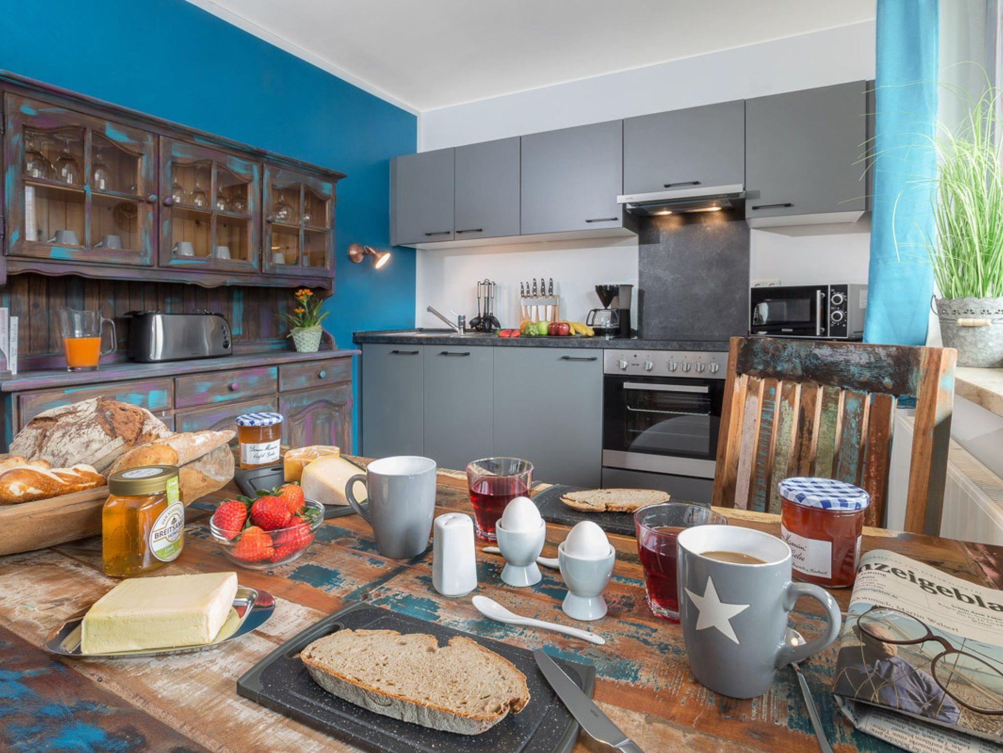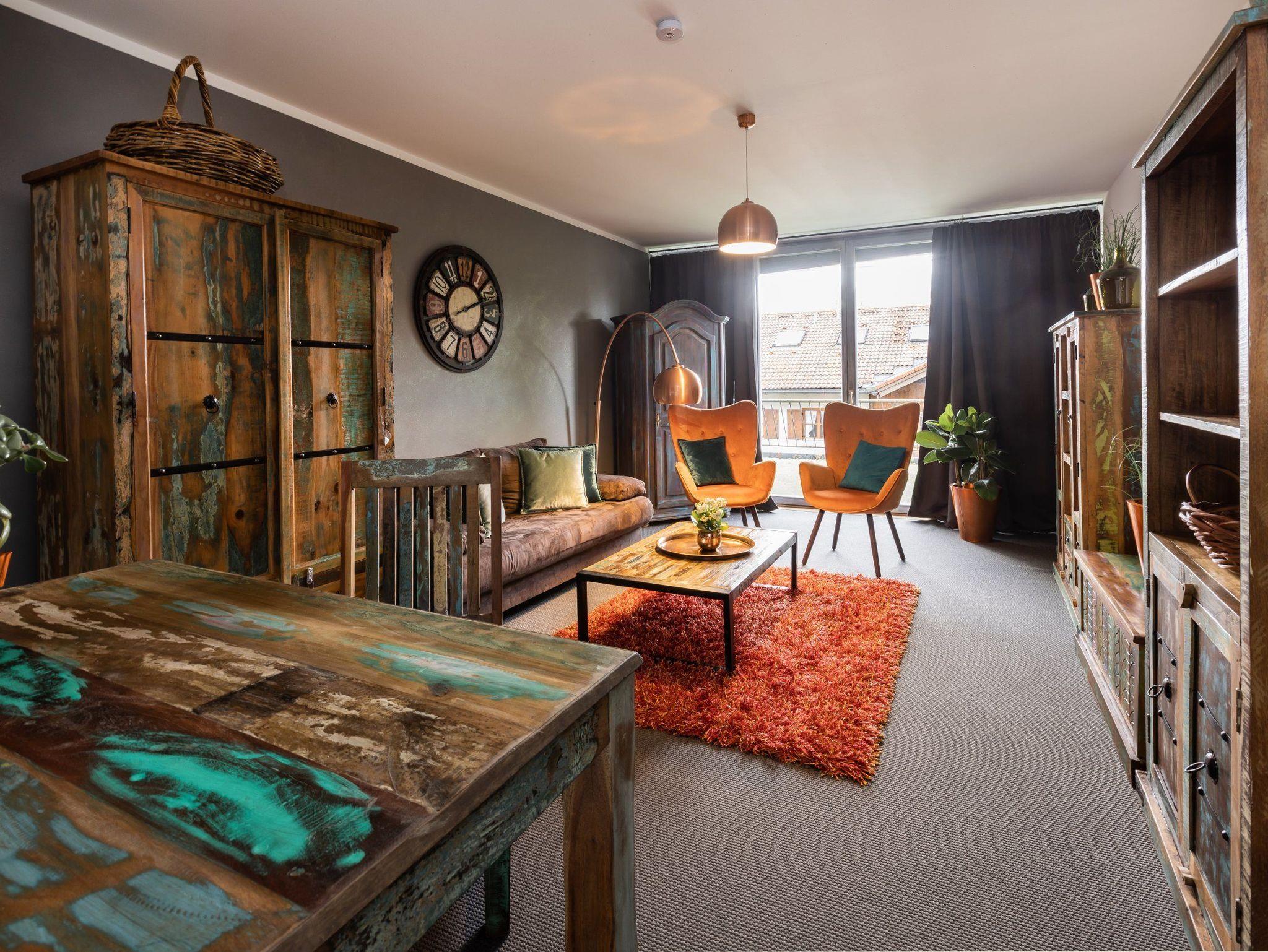 Die Ferienwohnung präsentiert sich im modernen Vintage-Stil mit ausgefallenen Deko-Elementen.