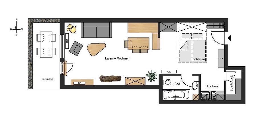 In unserer 53 qm großen Studio Wohnung stehen Ihnen ein Wohn-/Schlafraum mit Küchenzeile, eine gemütliche Essecke und ein Badezimmer zur Verfügung.