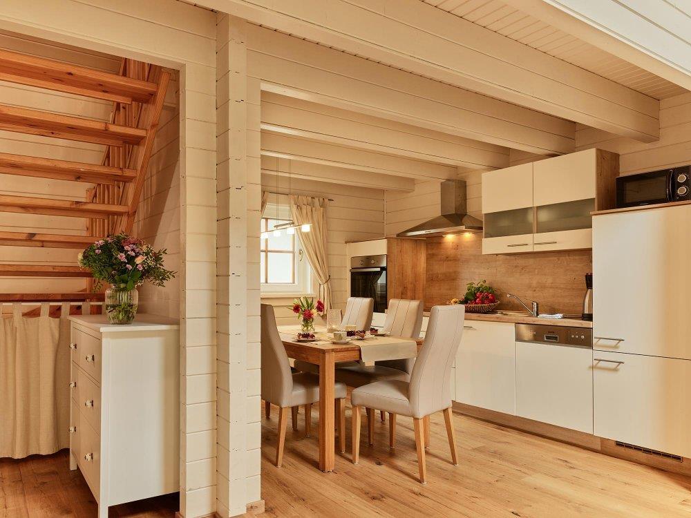 Das Holzhaus Kuhstall ist Teil eines Doppelhauses und steht in einem sehr ruhigen Teil der Ferienanlage in der Nähe des SPA-Bereiches. Das liebevoll gestaltete Haus hat zwei Etagen, die viel Platz für die ganze Familie bieten. Im Erdgeschoss befindet sich ein einladender Wohnraum mit offener Küche, Elternschlafzimmer mit Boxspringbett und Babybett, Badezimmer und separatem WC. In der oberen Etage befindet sich ein Kinderzimmer mit drei Einzelbetten und einer angrenzenden Galerie, die zum Spielen einlädt. Der Treppenaufgang ist oben und unten durch Treppengitter gesichert.Es hat außerdem eine schöne, große Terrasse mit Gartenmöbeln, die zum Entspannen einlädt.Vierbeiner sind herzlich willkommen.Waschmaschine und Trockner befinden sich im separaten Waschhaus.