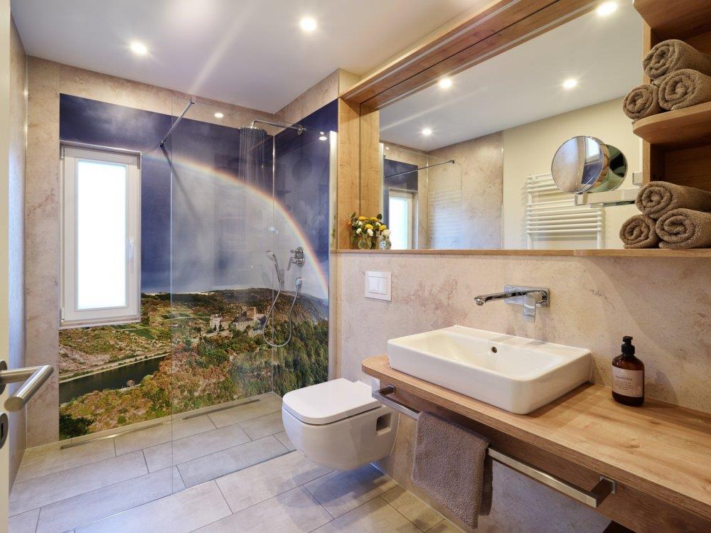 Badezimmer mit Fenster, Dusche, Waschbecken, WC, WC und Dusche