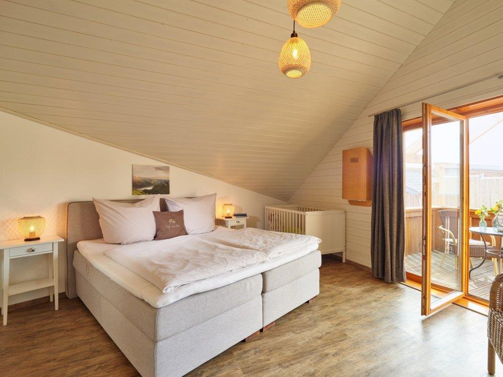 Die schicke Ferienwohnung Pfalzgrafenstein befindet sich sehr zentral im Innenhof der Anlage unweit von den Stallungen und des Frühstücksraumes.Im unteren Wohnbereich der zweistöckigen Wohnung, befindet sich ein gemütlicher Wohnraum mit offener Küche und einem Badezimmer mit Zugang zur eigenen Familiensauna. In der ersten Etage befinden sich das Kinderzimmer mit zwei Etagenbetten und das Elternschlafzimmer mit Boxspringbett und Babybett, sowie dem angrenzenden Balkon. Der Treppenaufgang ist oben und unten durch Treppengitter gesichert.Die Wohnung hat eine schöne, große Terrasse, die zum Entspannen einlädt.Haustierfreie Unterkunft.Waschmaschine und Trockner befinden sich im separaten Waschhaus.