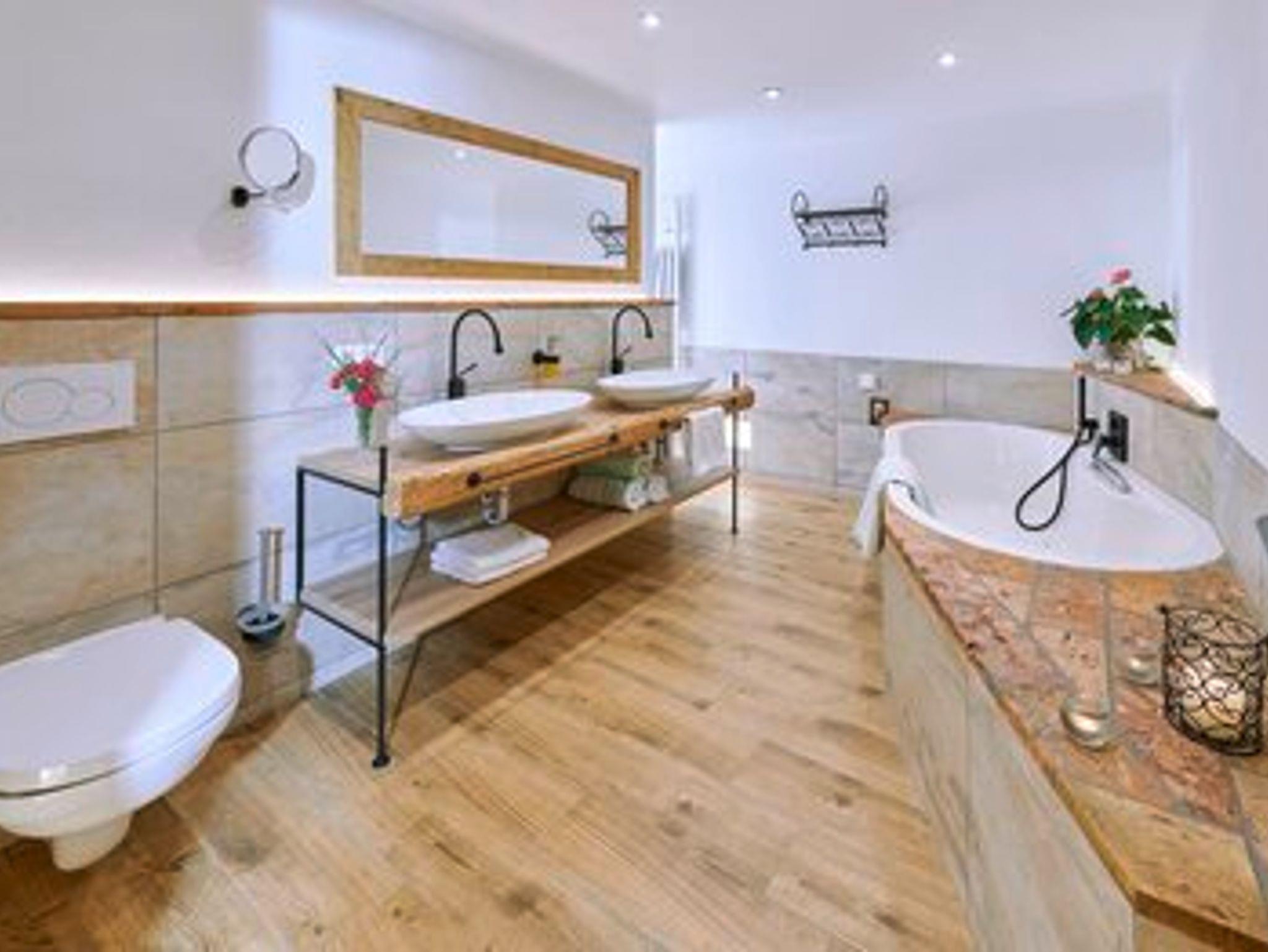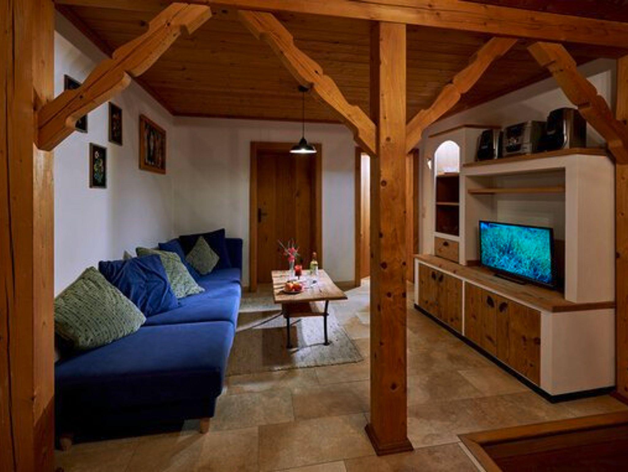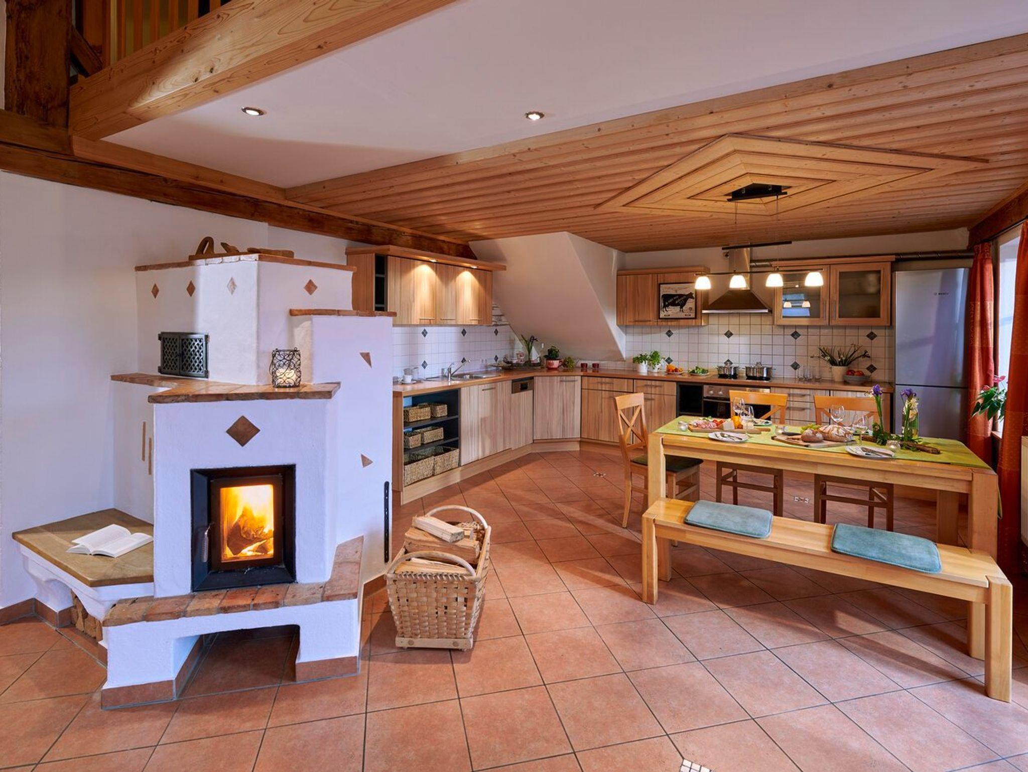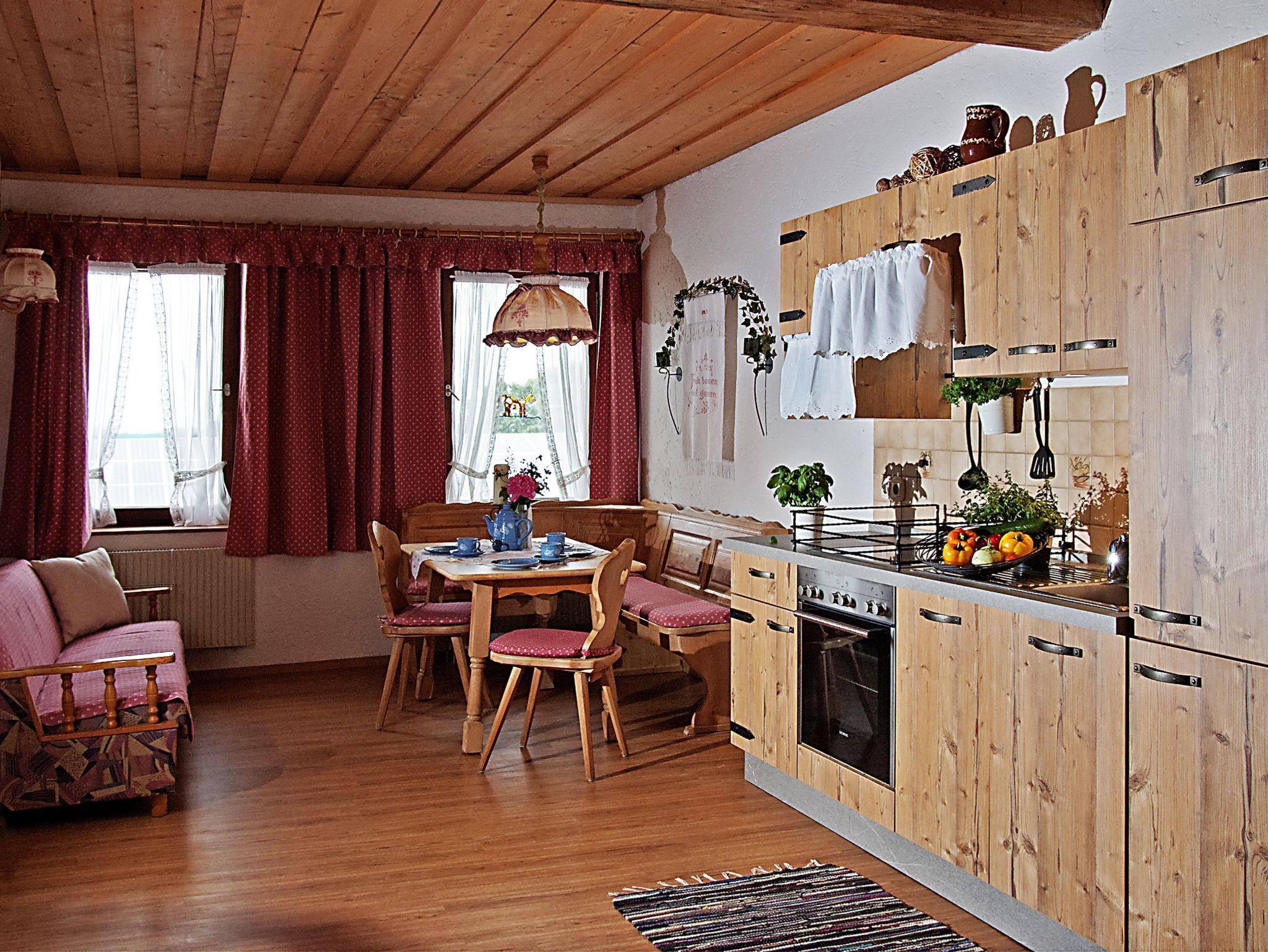 Die geräumige 4-Sterne-Ferienwohnung Schöne Aussicht befindet sich im 1. Obergeschoss des Bauernhauses. Die Nichtraucherwohnung punktet mit zwei Schlafzimmern und ist über einen separaten Eingang erreichbar. Handgeschmiedete Beschläge, die Echtholzdecke, das 100 Jahre alte Leinen und die rustikale Küchenzeile verleihen der Essküche einen besonders heimeligen Charme. Dazu tragen auch das bequeme Bauernsofa und die stilvolle Essecke bei. Vom Balkon aus bietet sich eine traumhafte Aussicht mitten ins Grüne.