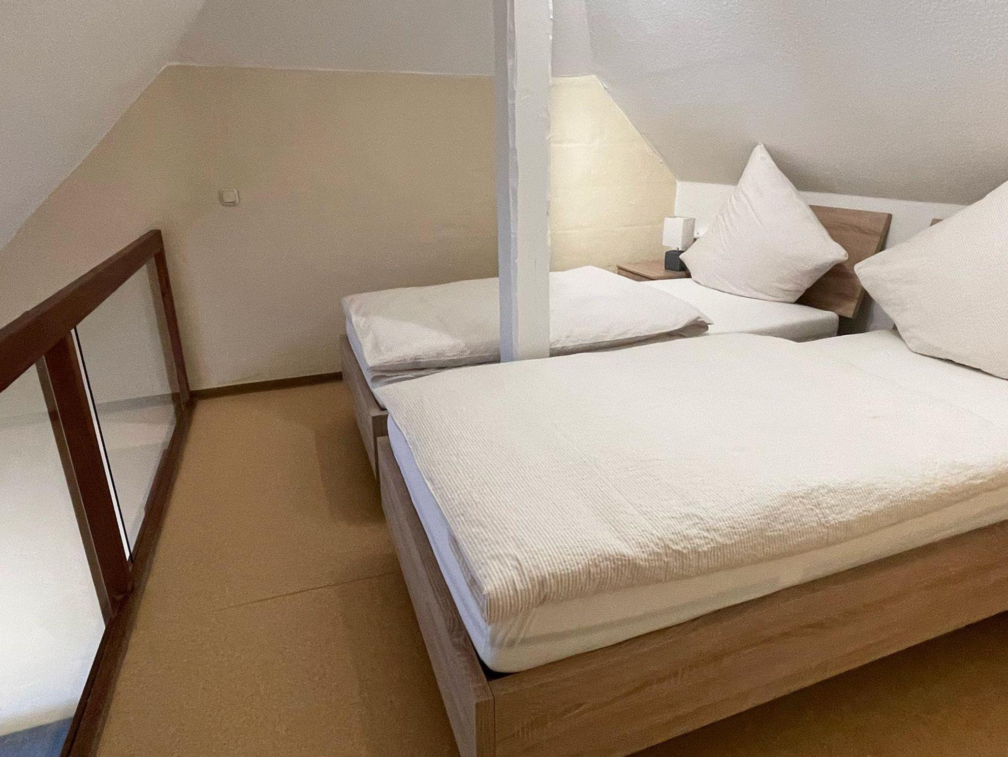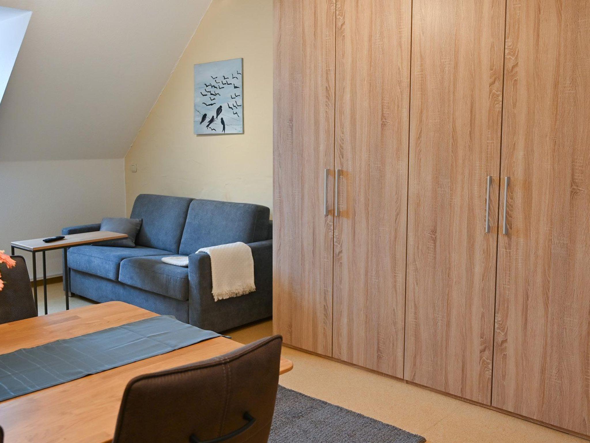 Das Appartement Krähennest verfügt über eine Klimaanlage und befindet sich im 2. Obergeschoss. Auf ca. 39 qm befinden sich 1 Flur, 1 Bad mit WC und Dusche, 1 Wohn-/Esszimmer mit Küche und eine Empore, auf der sich das Schlafzimmer mit 2 Einzelbetten befindet. Dieses ist über eine Treppe, die vom Wohn-/Esszimmer nach oben führt, erreichbar.