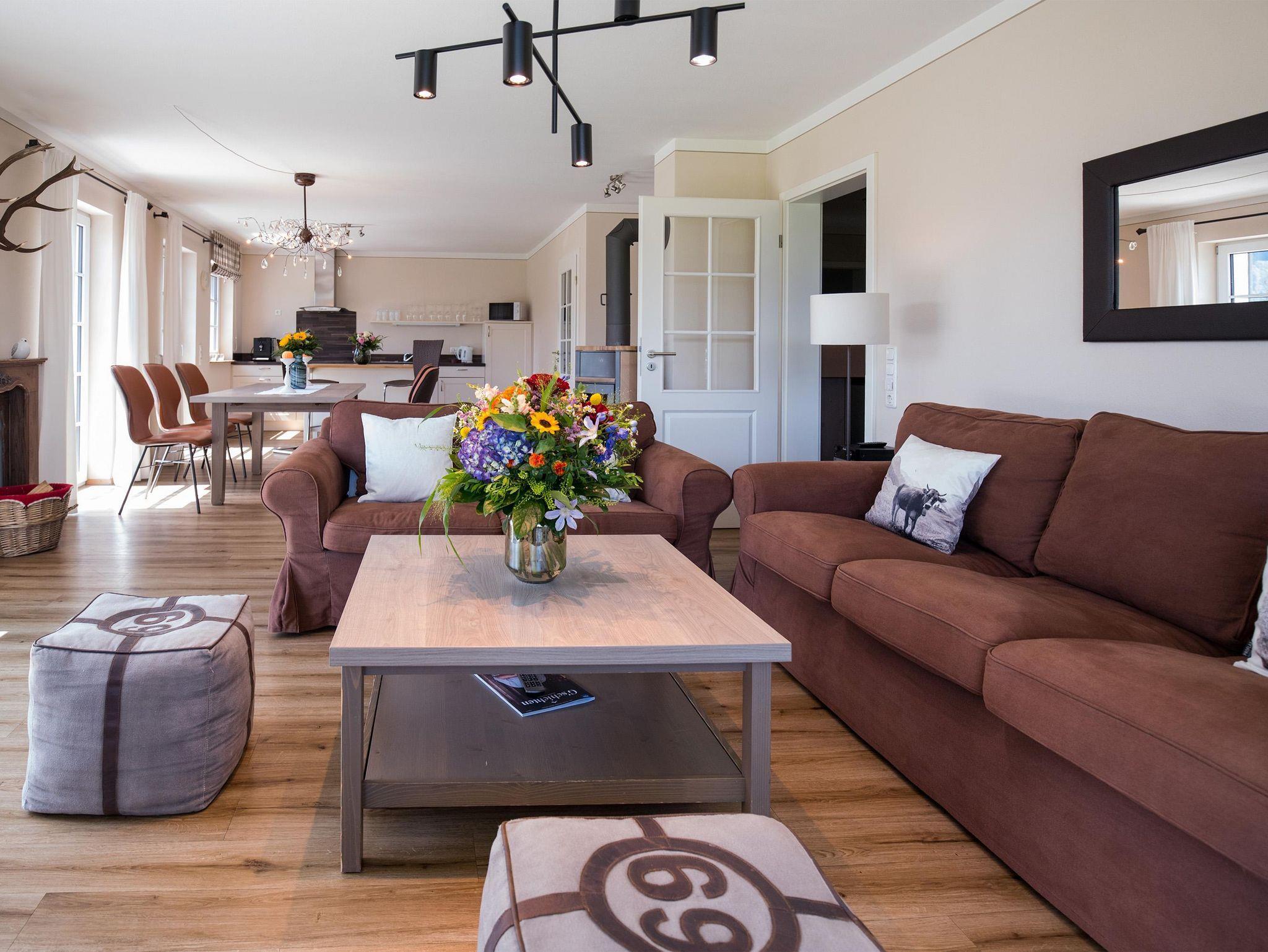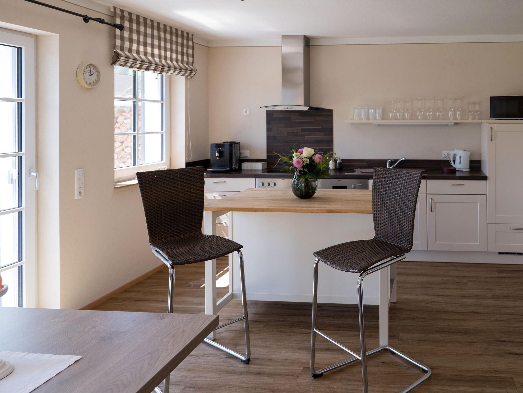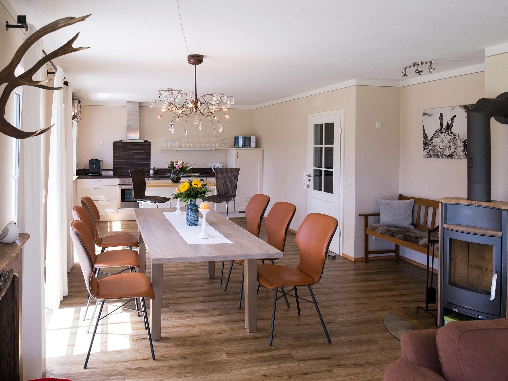 Die Erdgeschoßwohnung von Alpenlodge Allgäu heißt AlpenGlück und ist in Brauntönen gehalten. Eine stylische Küchenzeile mit Kücheninsel lädt auch im Urlaub zum Kochen ein. Der ansprechende Wohn/Essbereich, zur Küche hin offen, damit die Familie sich weiterunterhalten kann. Ein Kaminofen spendet kuschelige Wärme und bringt alpine Gemütlichkeit ins Spiel.