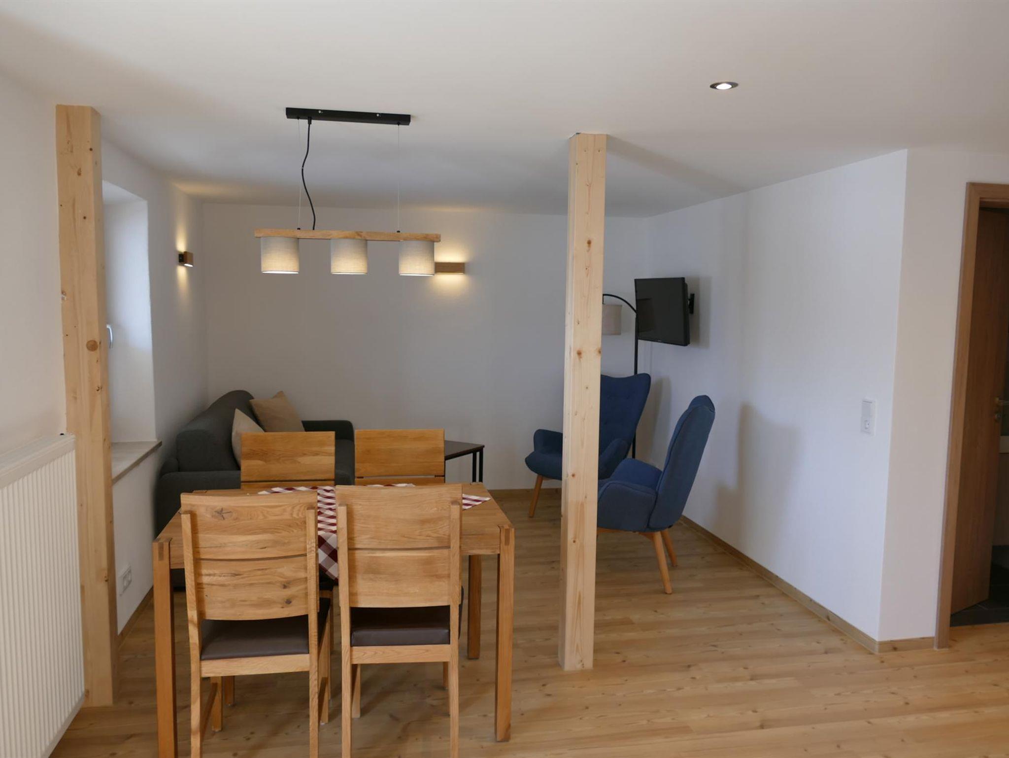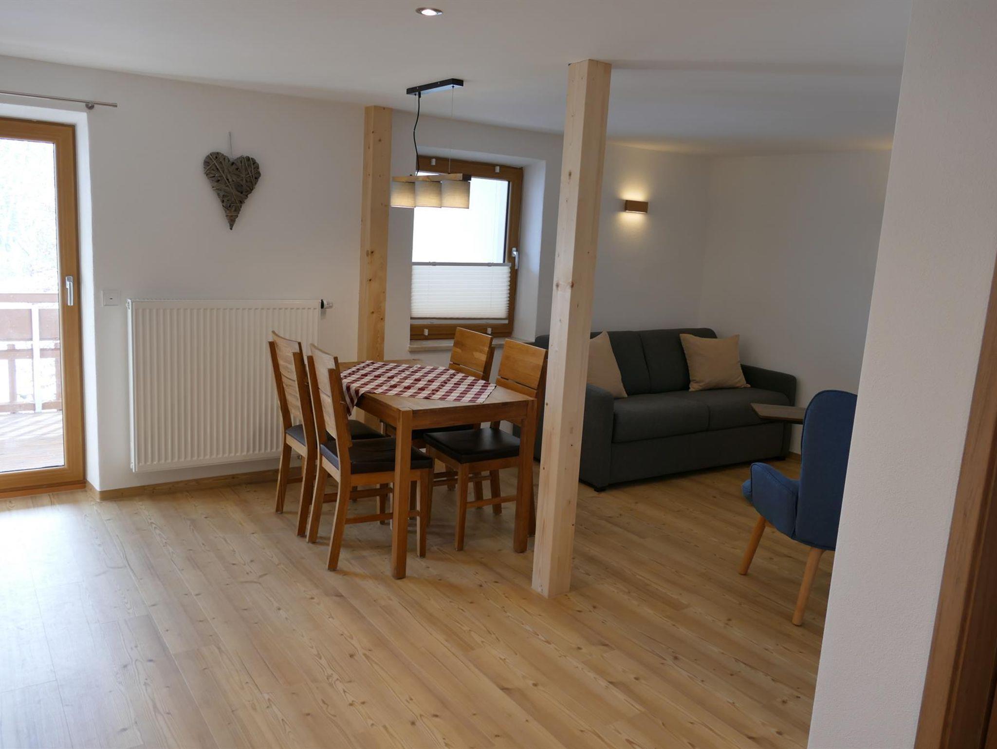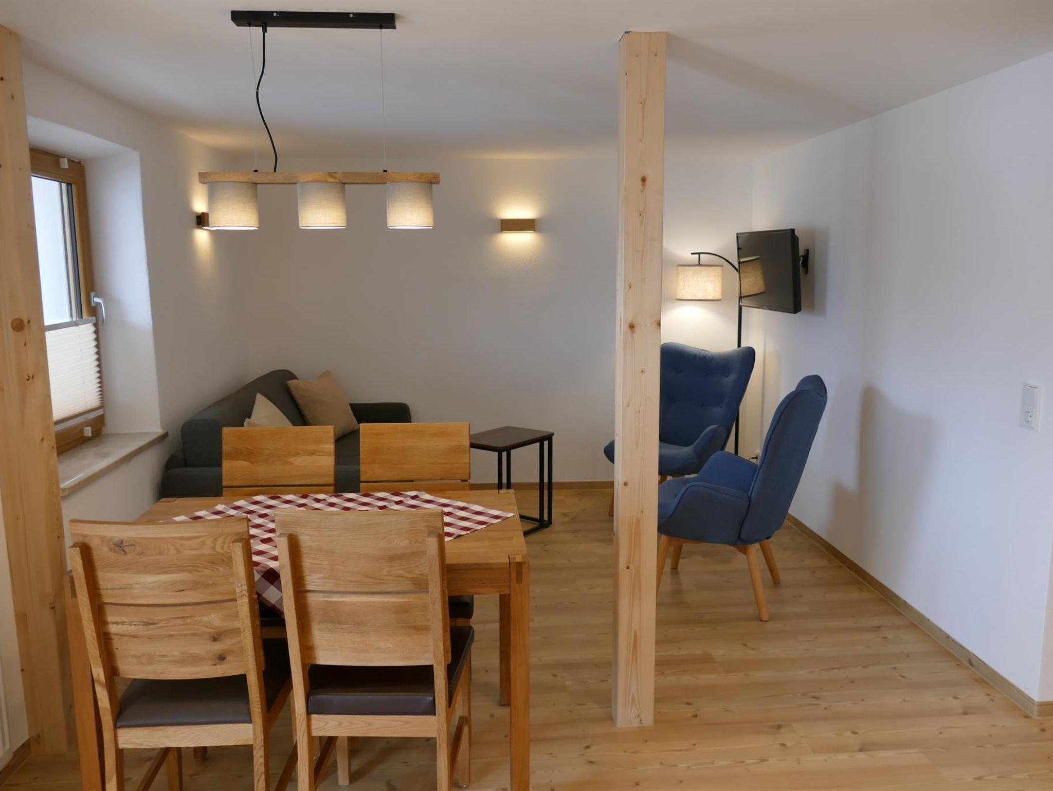 Sie betreten die neue erbaute Ferienwohnung und befinden sich direkt in einer großen Wohnküche mit Essplatz. Alles hier ist in Eiche Optik sehr geschmackvoll eingerichtet. Hier gibt es ebenfalls einen Zugang zum Südbalkon.