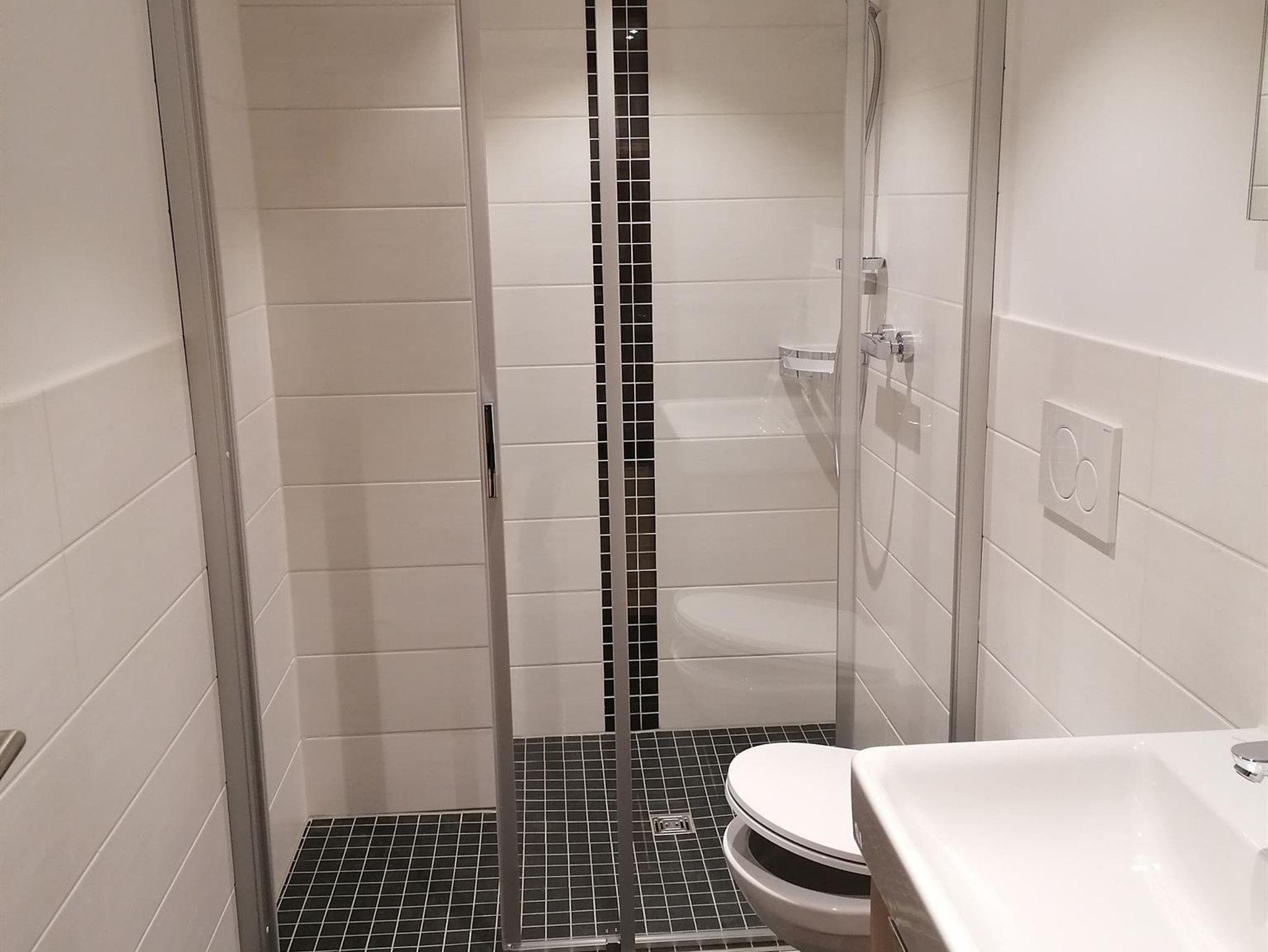 Im Badezimmer befindet sich eine große begehbare Dusche.