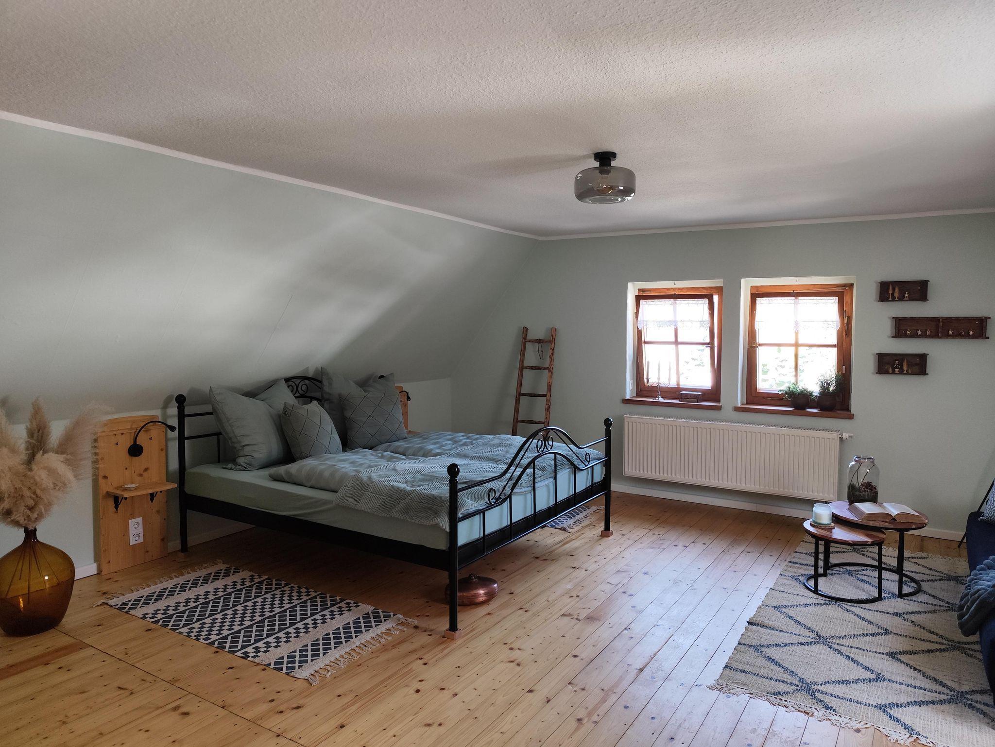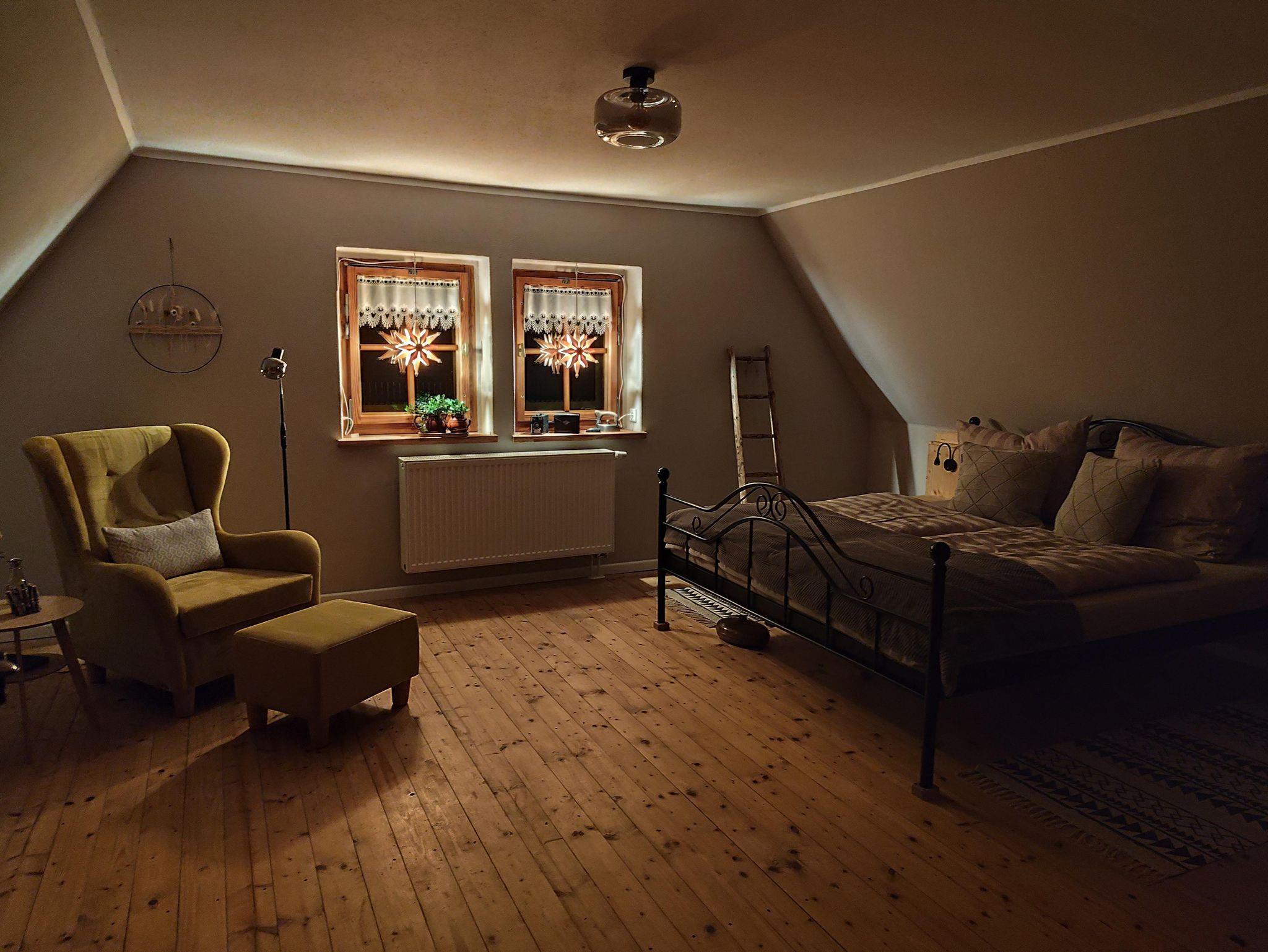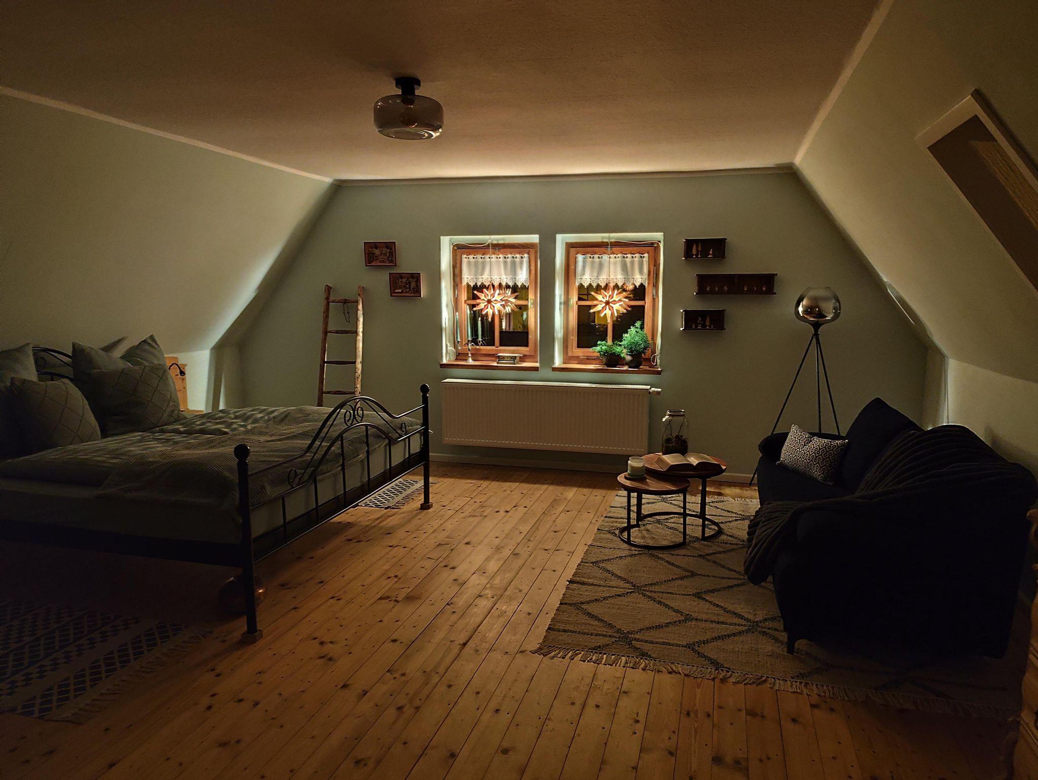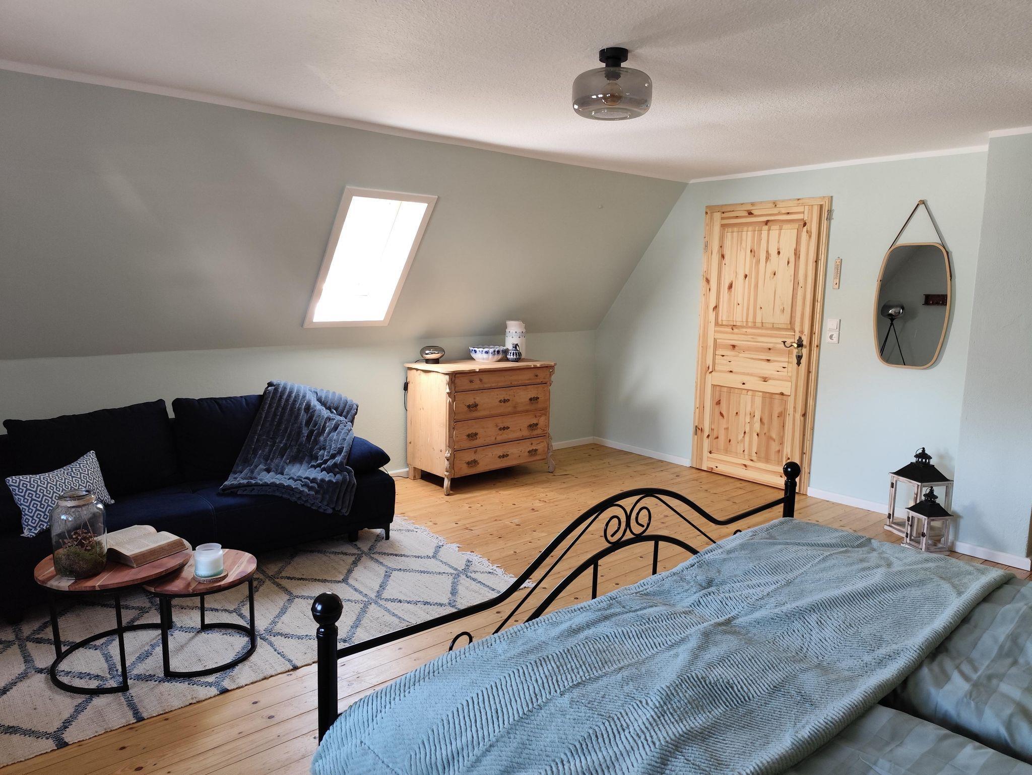 In der oberen Etage, die Sie über eine etwas steilere Holztreppe erreichen, befinden sich die beiden Schlafzimmer. Eines ausgestattet mit einem Doppelbett und das Zweite mit Doppelbett und der Möglichkeit der Aufbettung (Schlafsofa) für eine weitere Person (max. 4 Erwachsene). Falls gewünscht, stellen wir Ihnen auch gern ein Kinderreisebett, einen Kinderhochstuhl sowie ein Kindertöpfchen oder eine Toilettenverkleinerung zur Verfügung, selbstverständlich kostenfrei. Eine gemütliche Lese- bzw. Spielecke sowie ein Büroplatz mit Schreibtisch befinden sich ebenfalls in der oberen Etage.