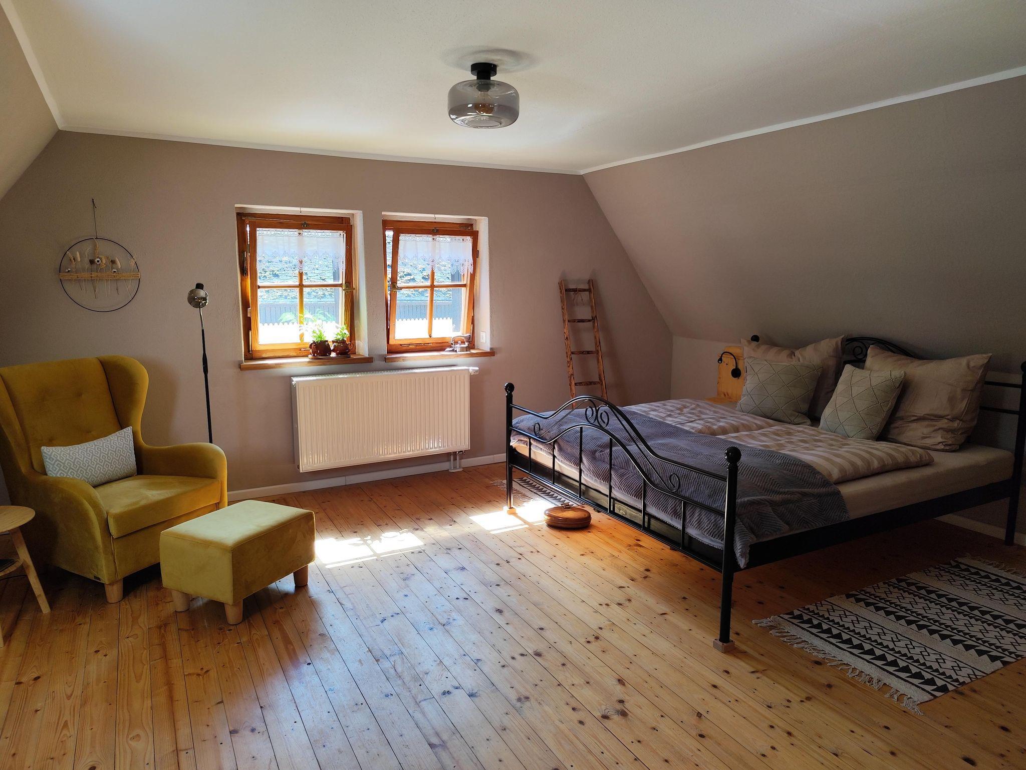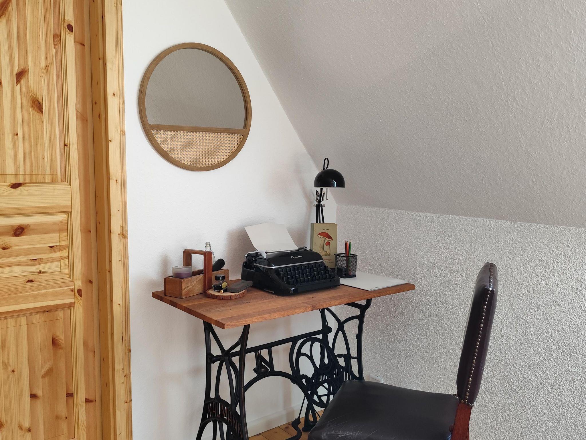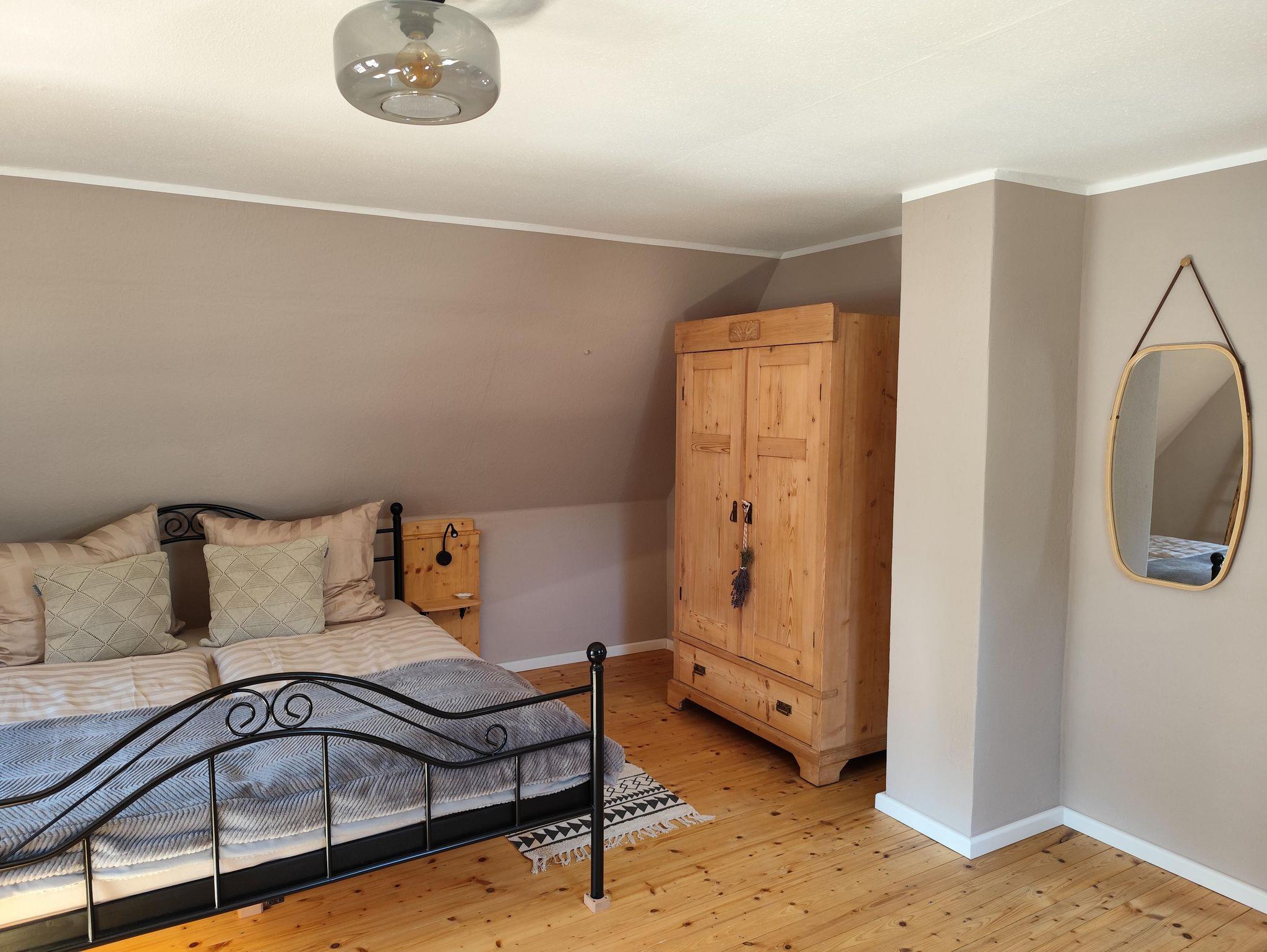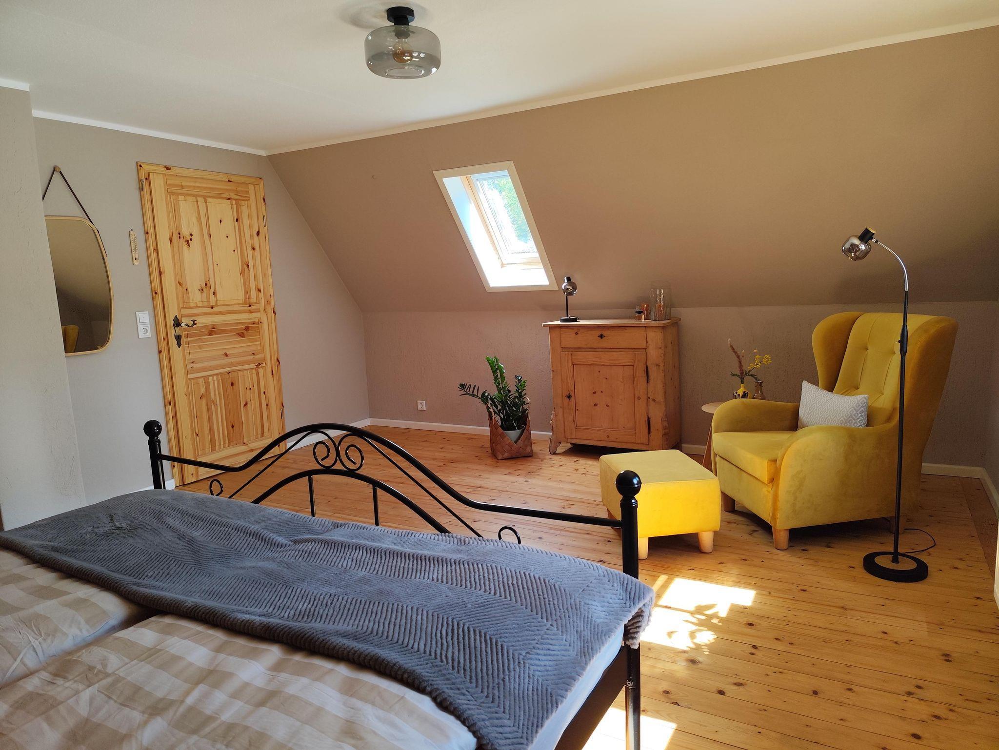 In der oberen Etage, die Sie über eine etwas steilere Holztreppe erreichen, befinden sich die beiden Schlafzimmer. Eines ausgestattet mit einem Doppelbett und das Zweite mit Doppelbett und der Möglichkeit der Aufbettung (Schlafsofa) für eine weitere Person (max. 4 Erwachsene). Falls gewünscht, stellen wir Ihnen auch gern ein Kinderreisebett, einen Kinderhochstuhl sowie ein Kindertöpfchen oder eine Toilettenverkleinerung zur Verfügung, selbstverständlich kostenfrei. Eine gemütliche Lese- bzw. Spielecke sowie ein Büroplatz mit Schreibtisch befinden sich ebenfalls in der oberen Etage.
