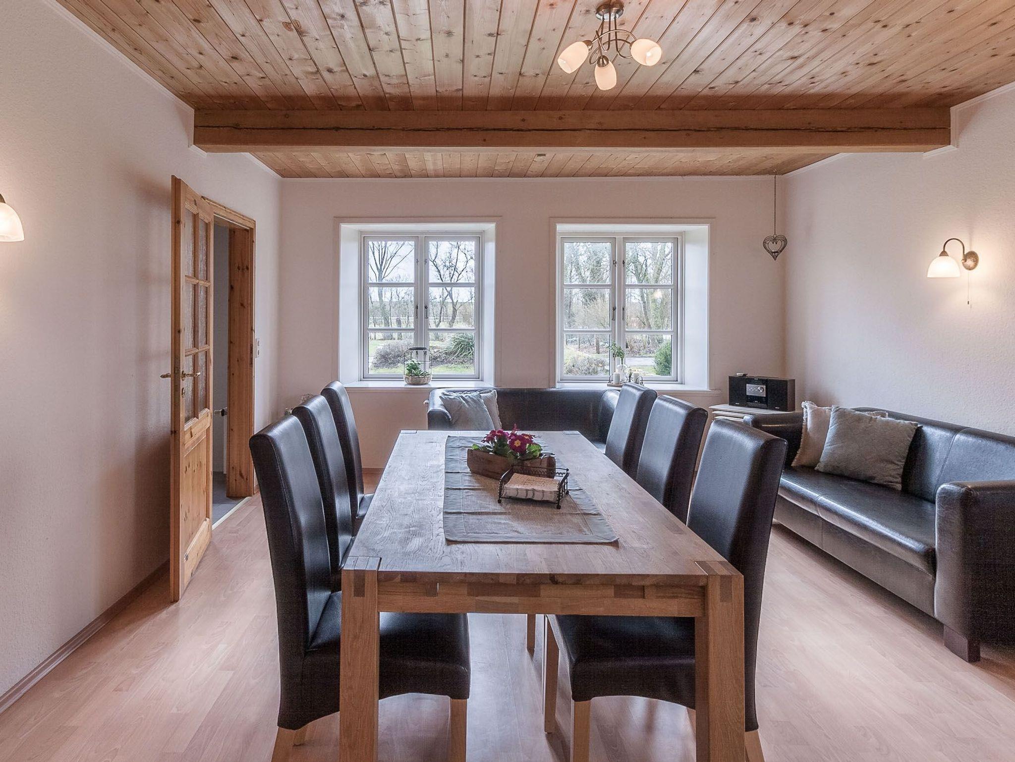 Das behagliche Wohnzimmer ist mit einem Flachbildfernseher und einer Stereoanlage ausgestattet. Im geräumigen Esszimmer gibt es einen großen Esstisch, der Platz für 8 Personen bietet, sowie zwei komfortable Sofas, ein Radio und den Zugang zur voll ausgestatteten Landhausküche. Die Küche lässt keine Wünsche offen und ist mit einem Ceranfeld, Backofen, Mikrowelle und Geschirrspüler ausgestattet. Waschmaschine und Trockner sind gegen Gebühr verfügbar.