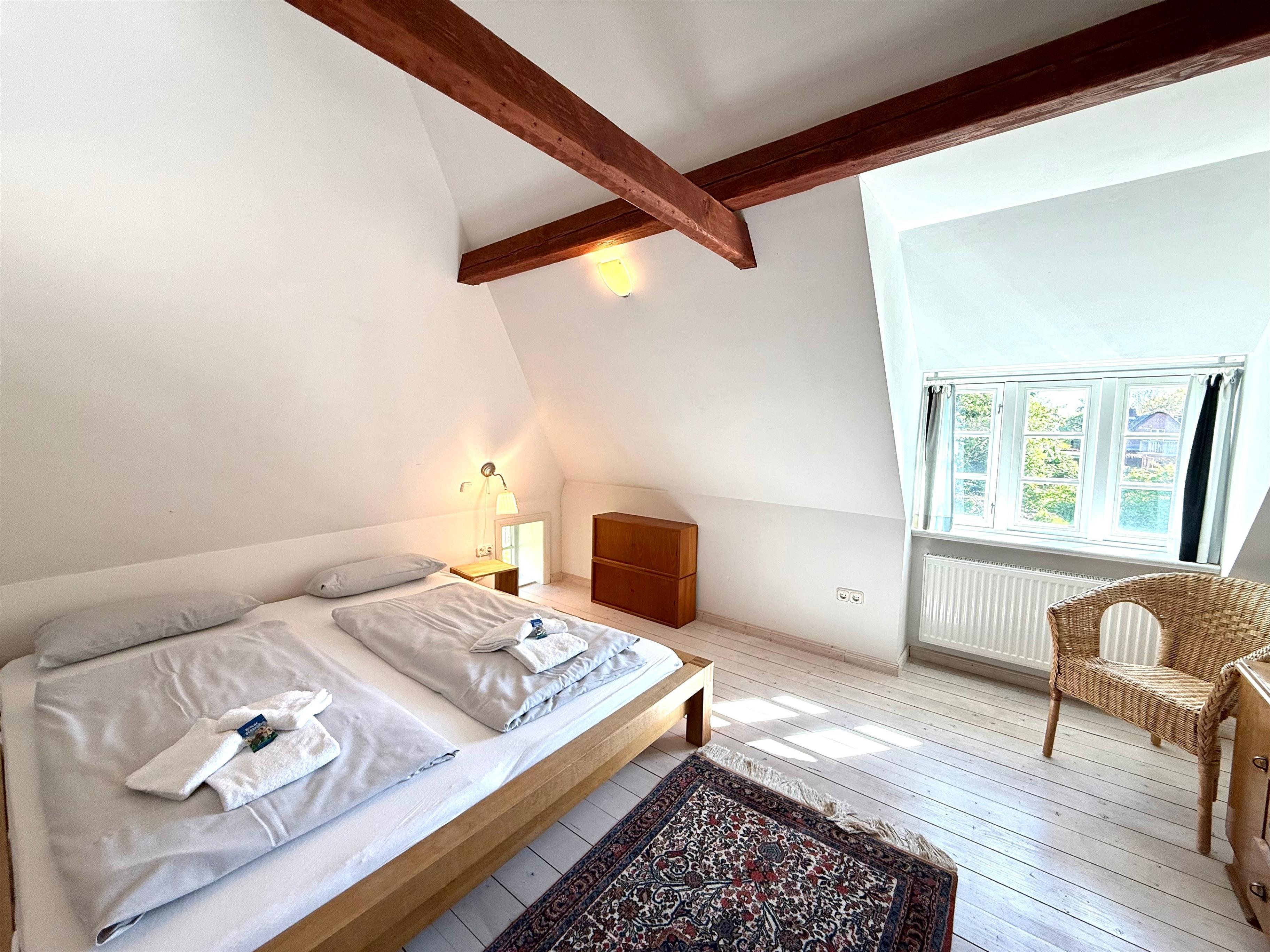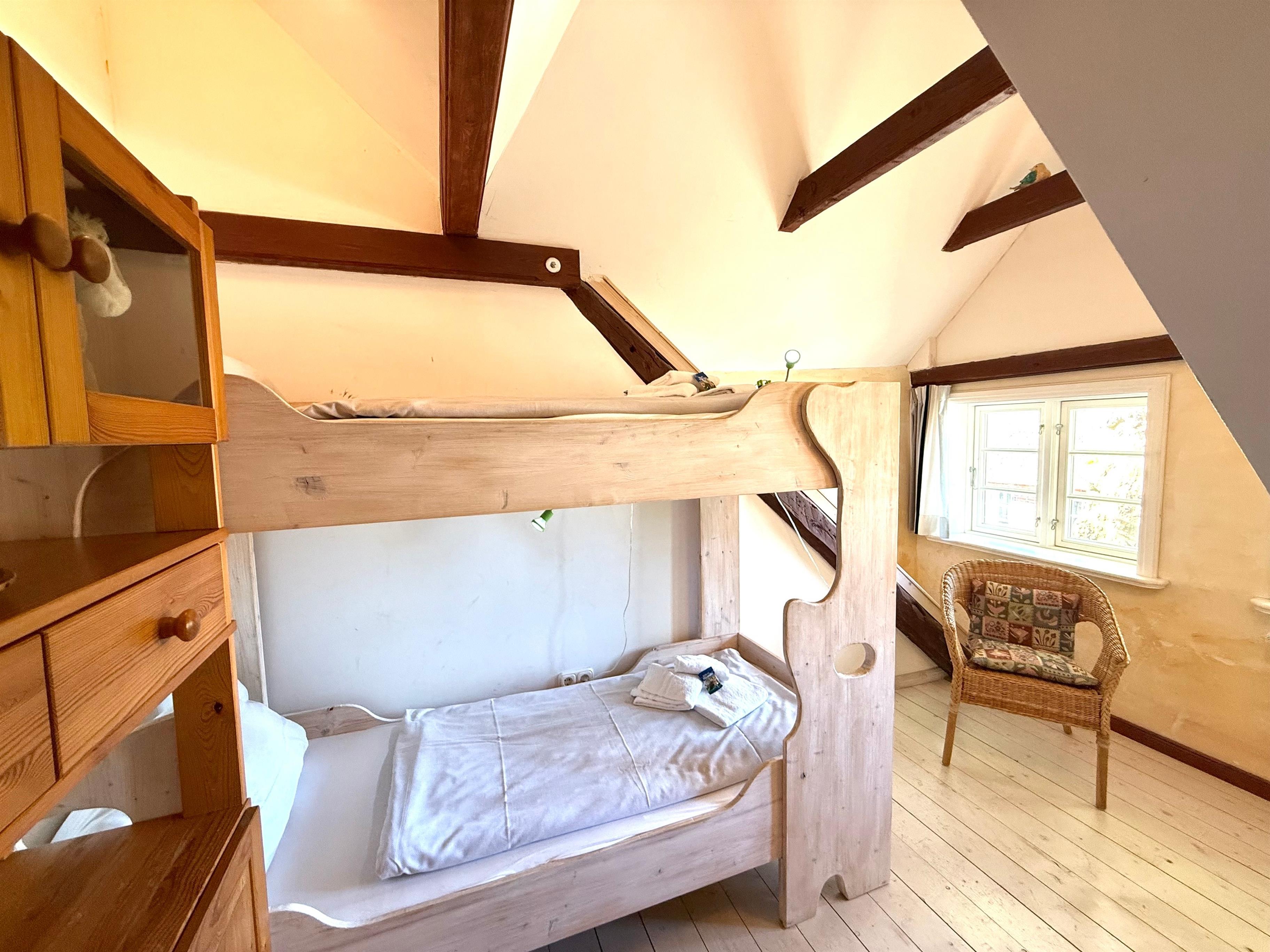 Diese Wohnung für 6 Personen und ist stilvoll und gemütlich eingerichtet. Im Wohnzimmer finden Sie einen Fernseher mit SAT-Anschluss, Musikanlage mit DVD und einen Kaminofen. Die Wohnküche hat noch den alten Fliesenboden und eine Einbauküche mit Spülmaschine. Ebenfalls im Erdgeschoss sind ein Schlafzimmer, ein Duschbad mit seniorengerechter, bodengleicher Dusche und angrenzender Sauna. Im Dachgeschoss sind das Elternschlafzimmer, ein Kinderzimmer mit Etagenbett und ein Wannenbad.