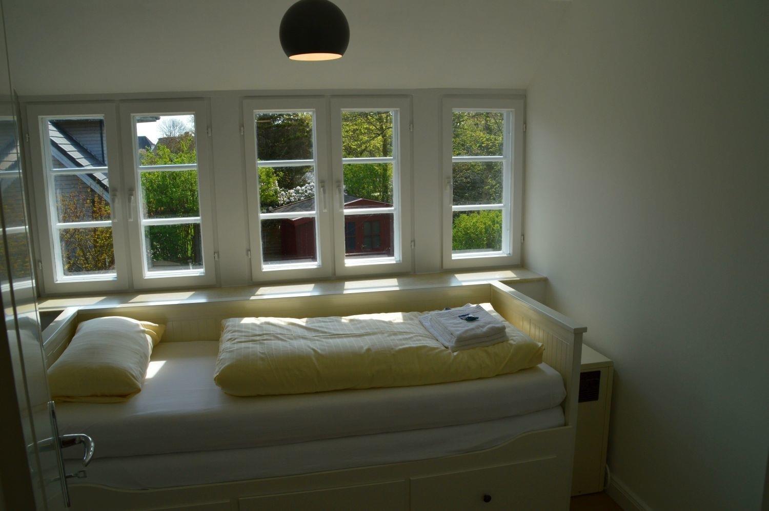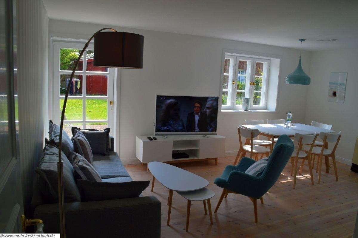 Die romantische Ferienwohnung "Linn" liegt im idyllischen Oldsum, zu Beginn einer ruhigen kleinen Seitenstraße, am Rande der Marsch. Die ca. 93 qm große Wohlfühloase erstreckt sich über zwei Etagen für 6 Personen und ein Baby und ist gerade sehr aufwendig saniert und modernisiert worden. Es besticht durch seine hochwertige, komfortable Ausstattung sowie die helle und freundliche Farbgebung, die sich in allen Räumen wiederfindet. Neben dem Wohnbereich befindet sich eine kleine Einbauküche, die mit modernen Geräten ausgestattet ist. Sie beinhaltet, Geschirrspüler, Cerankochfeld, Umluftbackofen, Kühlschrank mit Gefrierfach. Die Grundausstattung wie Toaster, Kaffeemaschine, Wasserkocher, Geschirr, Besteck und alles, was man zum Kochen und Backen braucht, ist ebenfalls neu und in ausreichender Menge vorhanden.