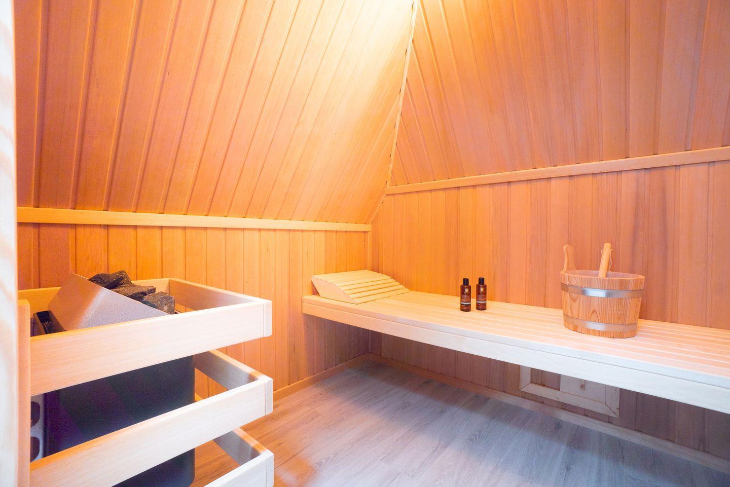 Im Spitzboden befindet sich eine Sauna mit kuscheliger Ruhezone mit Alkoventagesbett.