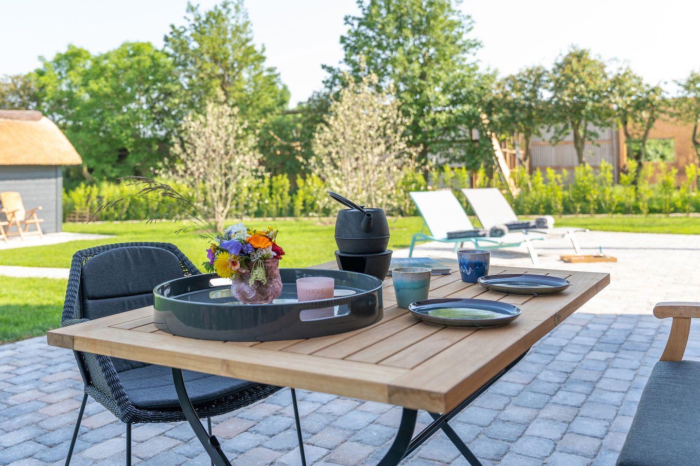 Hochwertig ausgestattete Doppelhaushälfte unter Reet mit Sauna, Kachelofen und Garten mit drei Terrassen.