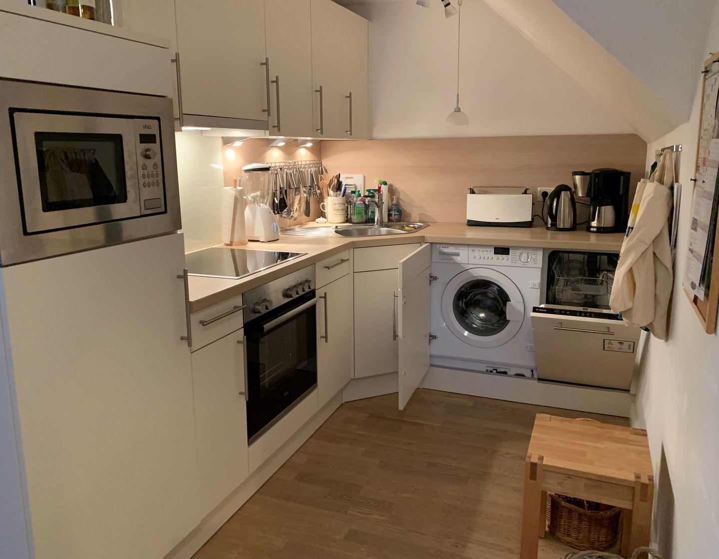 Der offene Wohn-Ess-Küchenbereich ist der perfekte Ort, um gemeinsam zu kochen, zu essen und die Urlaubszeit miteinander zu genießen. Die voll ausgestattete Küche bietet alle Annehmlichkeiten, die Sie benötigen, um Ihre Lieblingsmahlzeiten zuzubereiten. Morgens können Sie an der gemütlichen Essecke mit Blick auf die Umgebung in den Tag starten.
