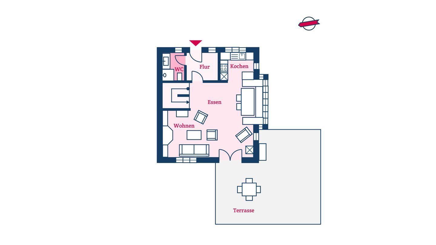 Im Erdgeschoss befinden sich der großzügige Wohn- ung Essbereich mit offener Küche und eines der beiden Duschbäder. Über den Essbereich gelangen Sie direkt auf die eigene Terrasse und in den Garten. Der Kaminofen im Wohnbereich sorgt auch an kühleren Tagen für eine angenehme Atmosphäre.