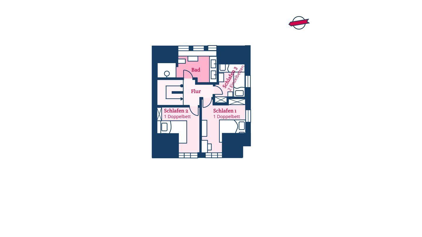 Im Obergeschoss sind die drei Schlafzimmer sowie das zweite Duschbad gelegen. Zwei der Schlafzimmer sind jeweils mit einem Doppelbett und einem Smart-TV ausgestattet, das dritte Schlafzimmer mit zwei Einzelbetten. Relaxen Sie in der hauseigenen Sauna im Dachgeschoss samt Ruheraum.