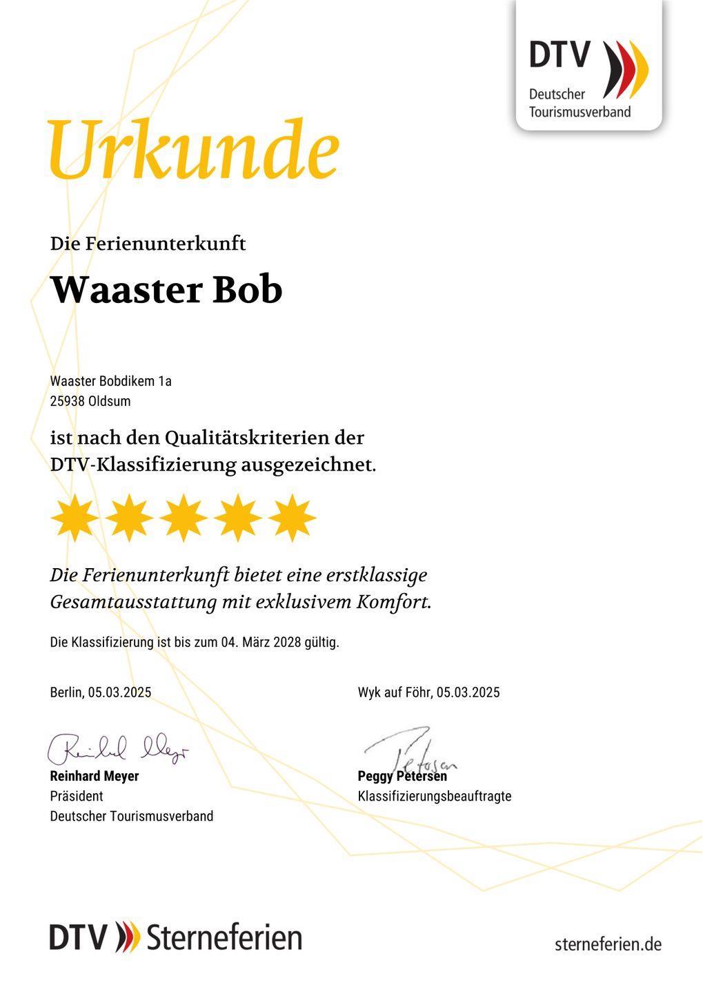 Die reetgedeckte Doppelhaushälfte Waaster Bob, welche vom Deutschen Tourismusverband mit 5 von 5 Sternen ausgezeichnet wurde, verfügt über 3 Schlafzimmer und 2 Bäder und bietet somit komfortabel Platz für bis zu 6 Personen zuzüglich einer Kleinkinderaufbettung.