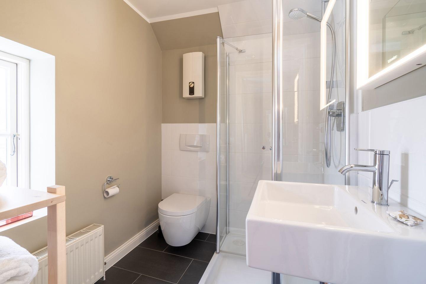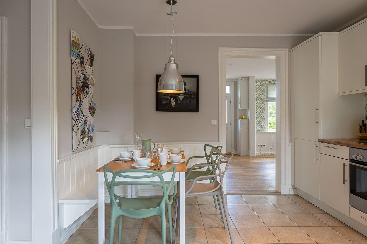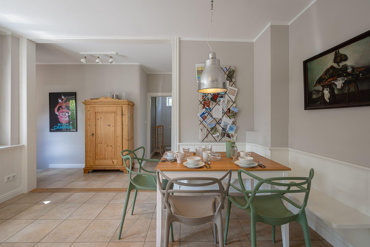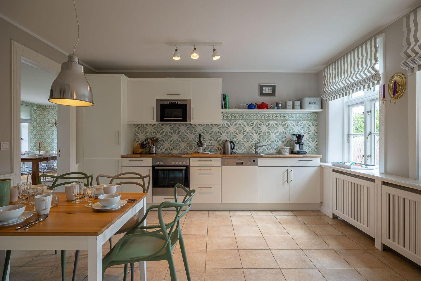 Durch die großen Fenster fällt viel Tageslicht in den kombinierten Wohn-/Essbereich. Im Erdgeschoss befindet sich ein Schlafzimmer mit zwei Einzelbetten sowie ein großzügiges Badezimmer mit bodengleicher Dusche. Die modernen Elemente der Küche vereinen sich hier mit traditionellen Wandfliesen, welche bewusst bei der Renovierung in 2018 erhalten worden sind. Die Terrasse ist durch den Eingangsbereich zu betreten, welcher ebenfalls an die Küche angrenzt - so können frühe Sonnenstrahlen bereits beim Frühstücken getankt werden. Der kombinierte Wohn- und Essbereich überzeugt mit dem historischen Ofen, der auch an kalten Tagen des Jahres für eine wohlig angenehme Raumatmosphäre sorgt.