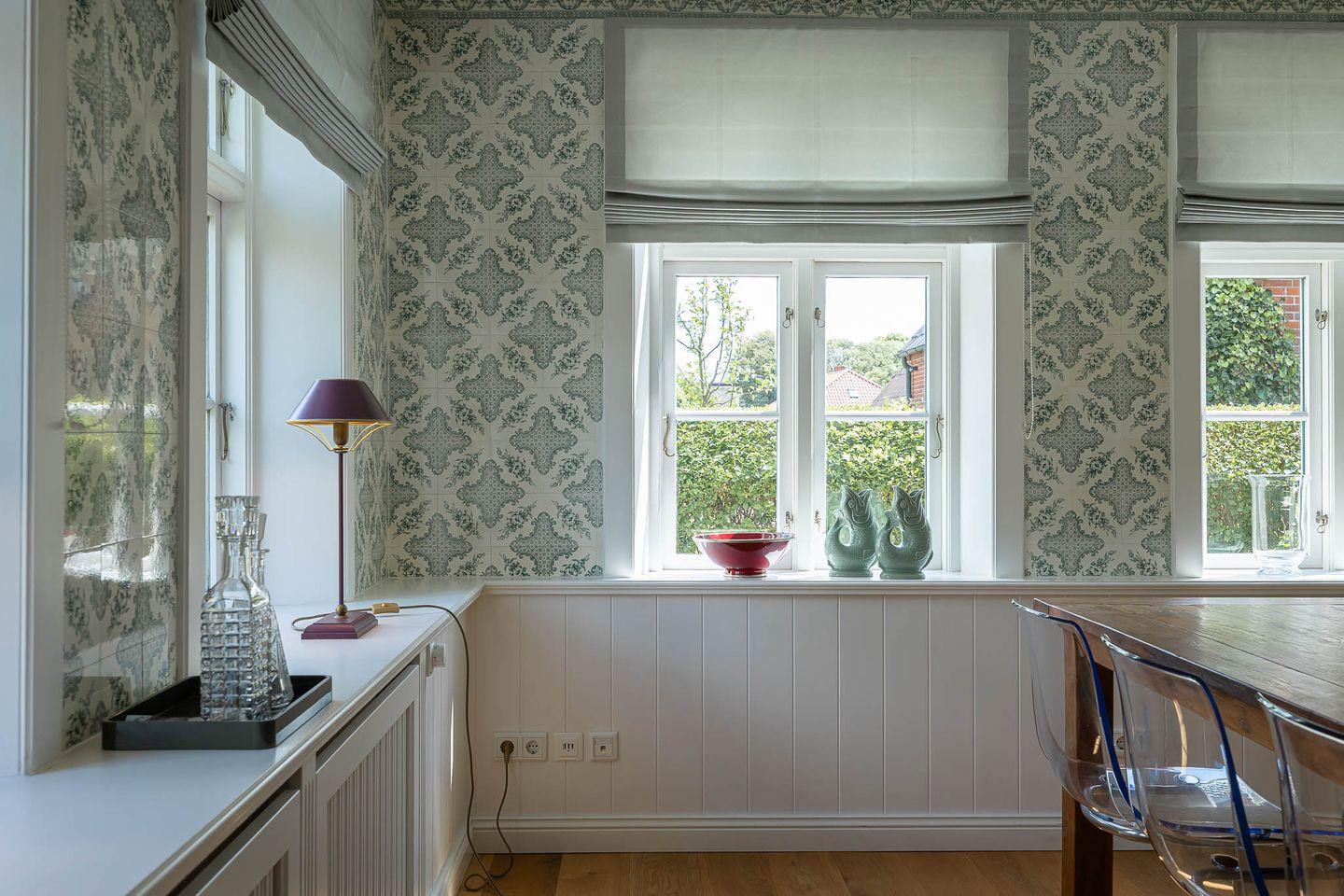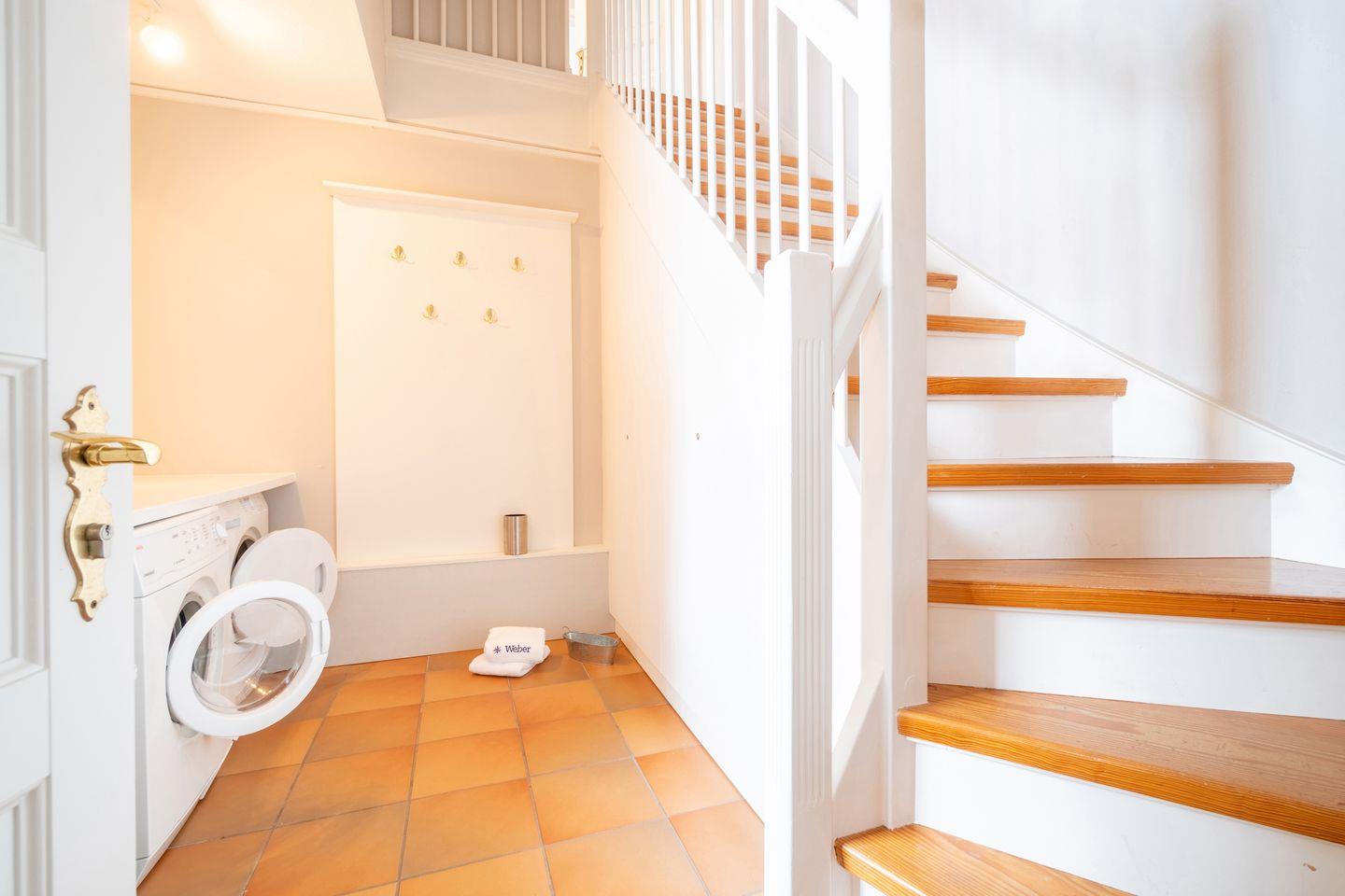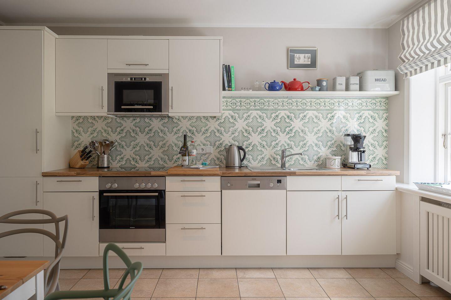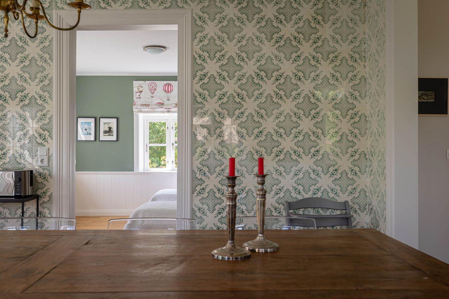 Durch die großen Fenster fällt viel Tageslicht in den kombinierten Wohn-/Essbereich. Im Erdgeschoss befindet sich ein Schlafzimmer mit zwei Einzelbetten sowie ein großzügiges Badezimmer mit bodengleicher Dusche. Die modernen Elemente der Küche vereinen sich hier mit traditionellen Wandfliesen, welche bewusst bei der Renovierung in 2018 erhalten worden sind. Die Terrasse ist durch den Eingangsbereich zu betreten, welcher ebenfalls an die Küche angrenzt - so können frühe Sonnenstrahlen bereits beim Frühstücken getankt werden. Der kombinierte Wohn- und Essbereich überzeugt mit dem historischen Ofen, der auch an kalten Tagen des Jahres für eine wohlig angenehme Raumatmosphäre sorgt.