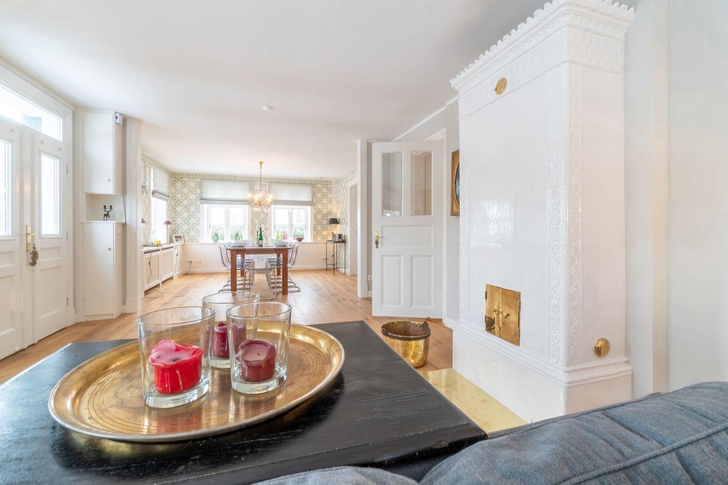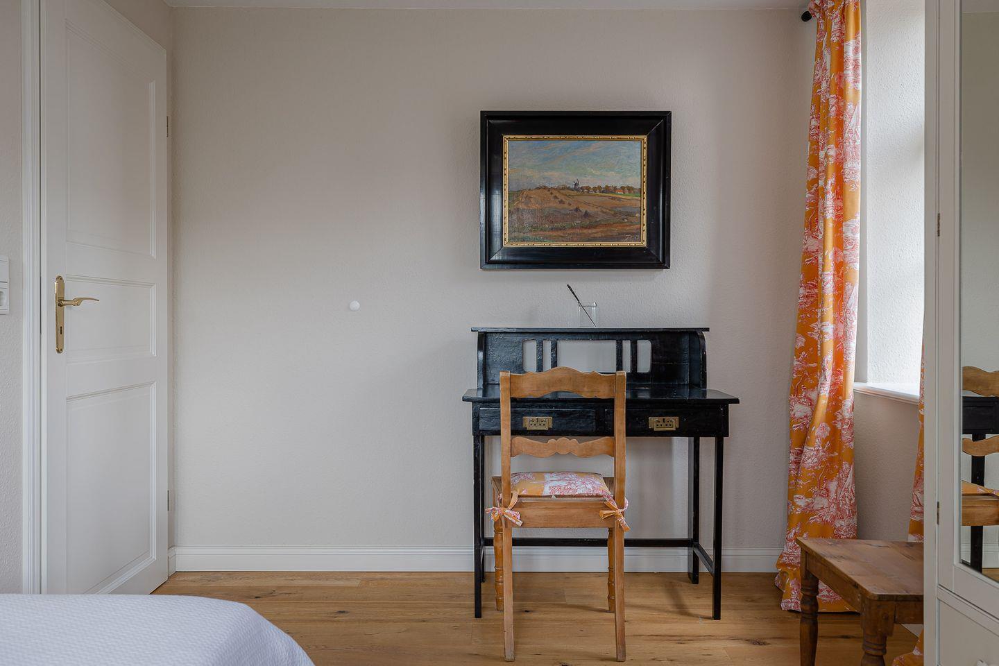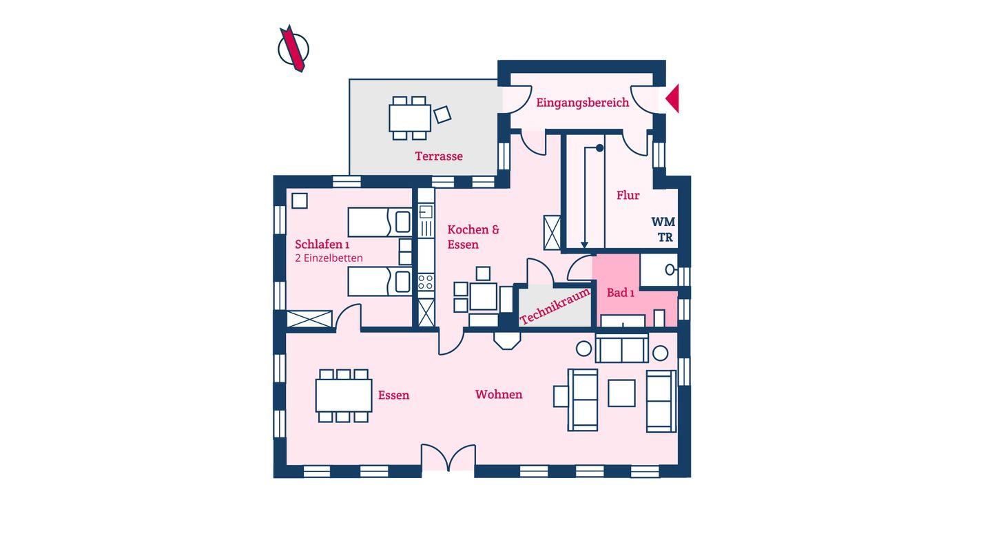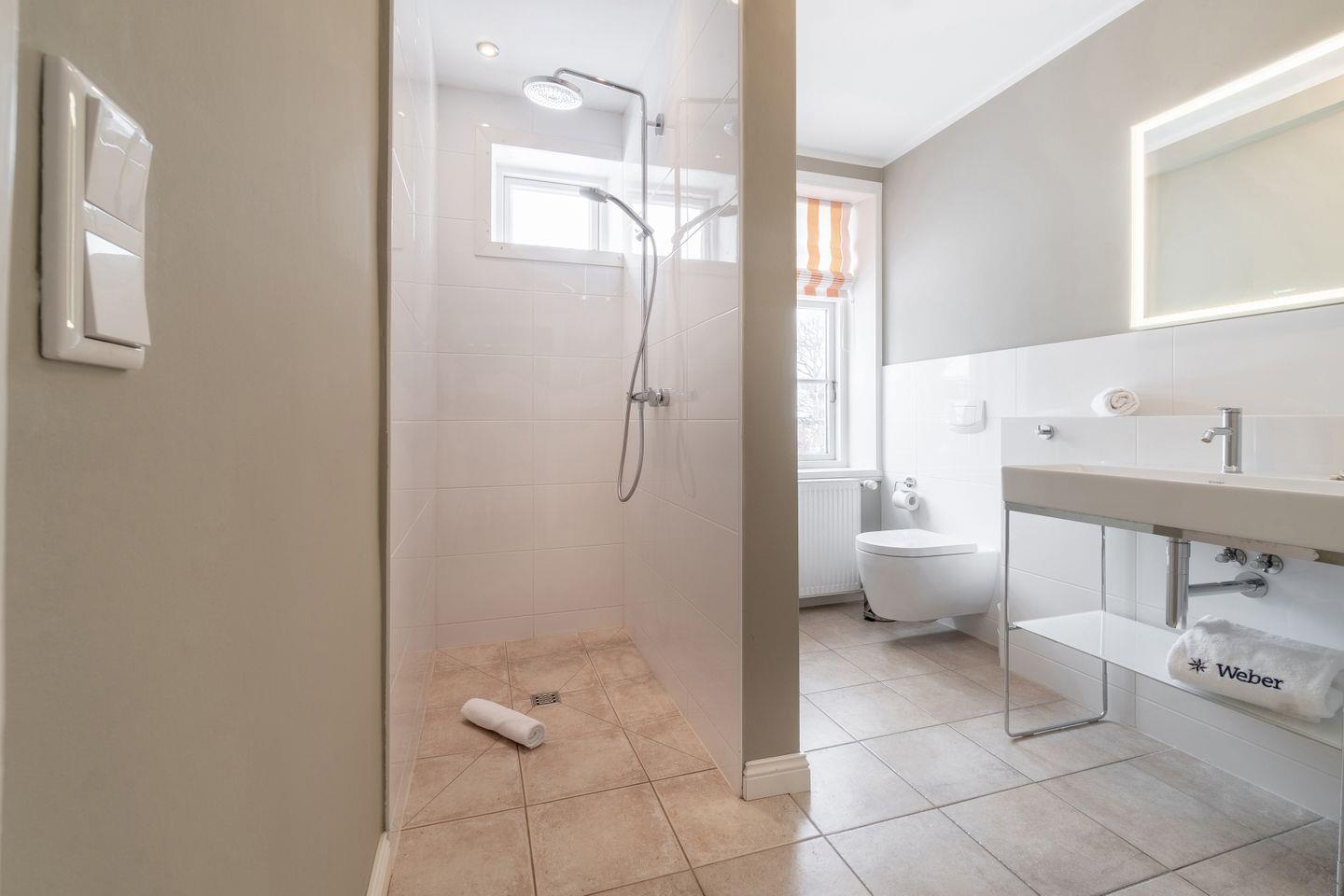 Durch die großen Fenster fällt viel Tageslicht in den kombinierten Wohn-/Essbereich. Im Erdgeschoss befindet sich ein Schlafzimmer mit zwei Einzelbetten sowie ein großzügiges Badezimmer mit bodengleicher Dusche. Die modernen Elemente der Küche vereinen sich hier mit traditionellen Wandfliesen, welche bewusst bei der Renovierung in 2018 erhalten worden sind. Die Terrasse ist durch den Eingangsbereich zu betreten, welcher ebenfalls an die Küche angrenzt - so können frühe Sonnenstrahlen bereits beim Frühstücken getankt werden. Der kombinierte Wohn- und Essbereich überzeugt mit dem historischen Ofen, der auch an kalten Tagen des Jahres für eine wohlig angenehme Raumatmosphäre sorgt.