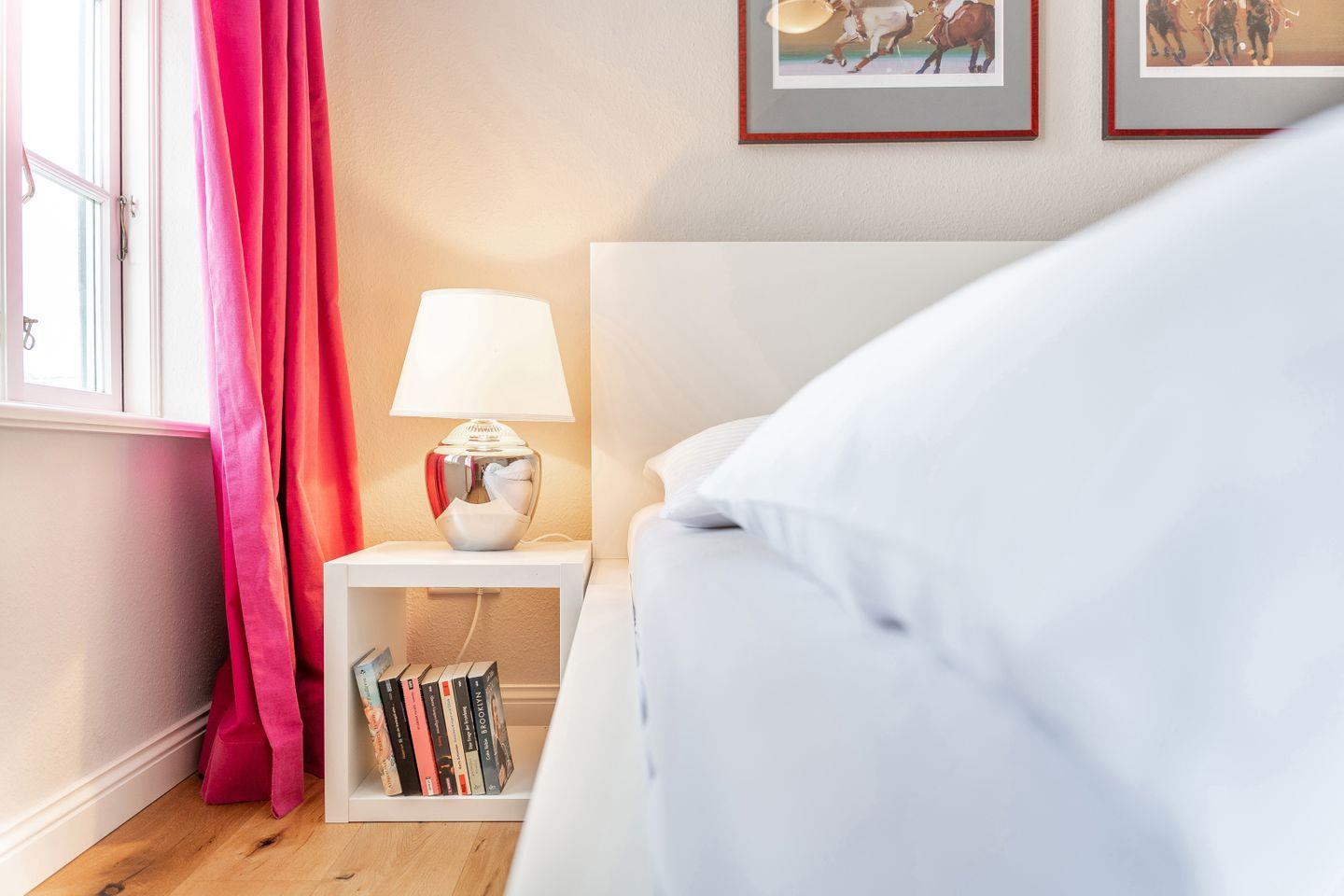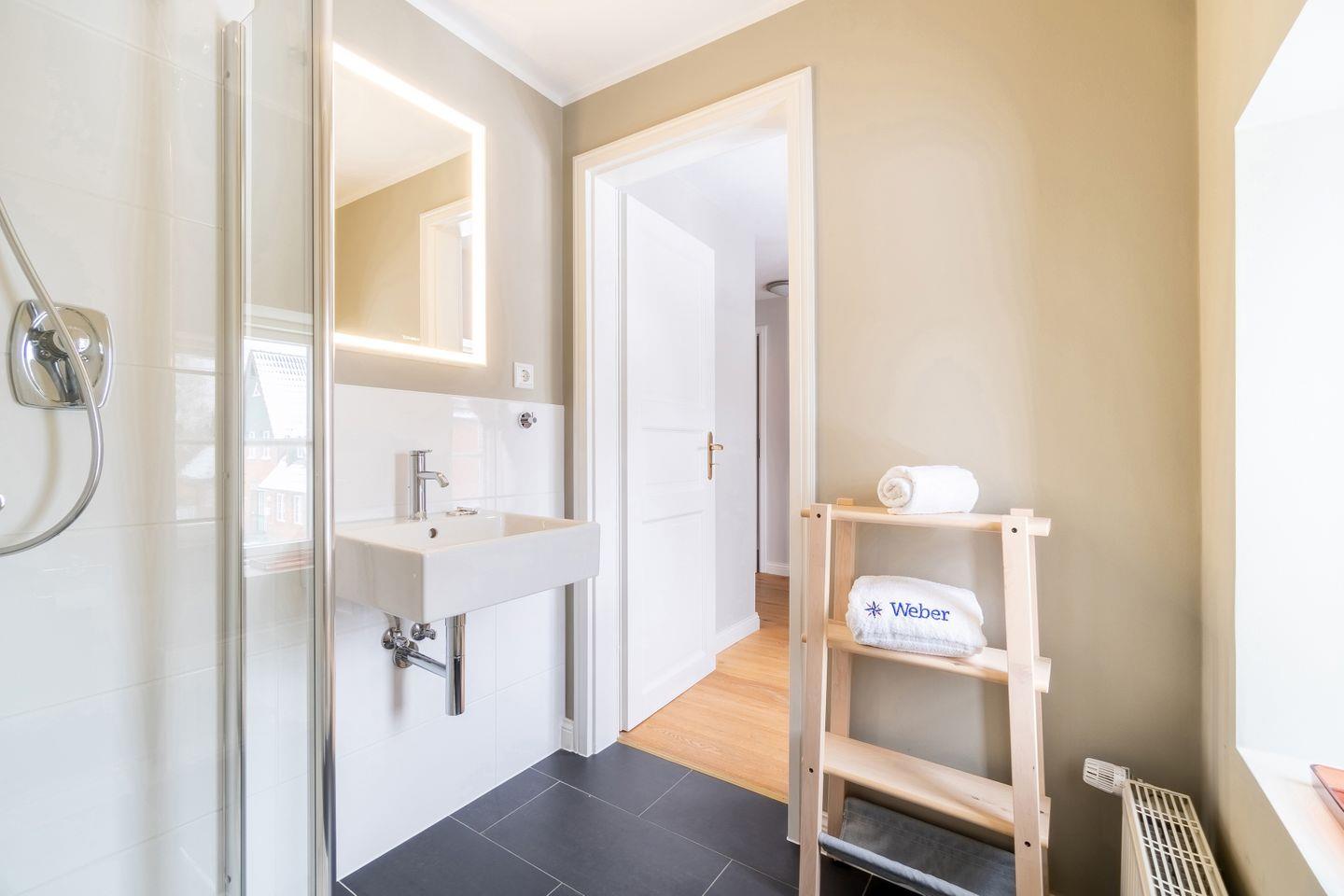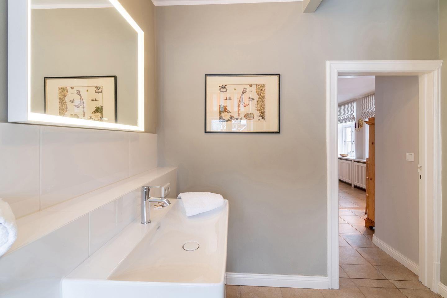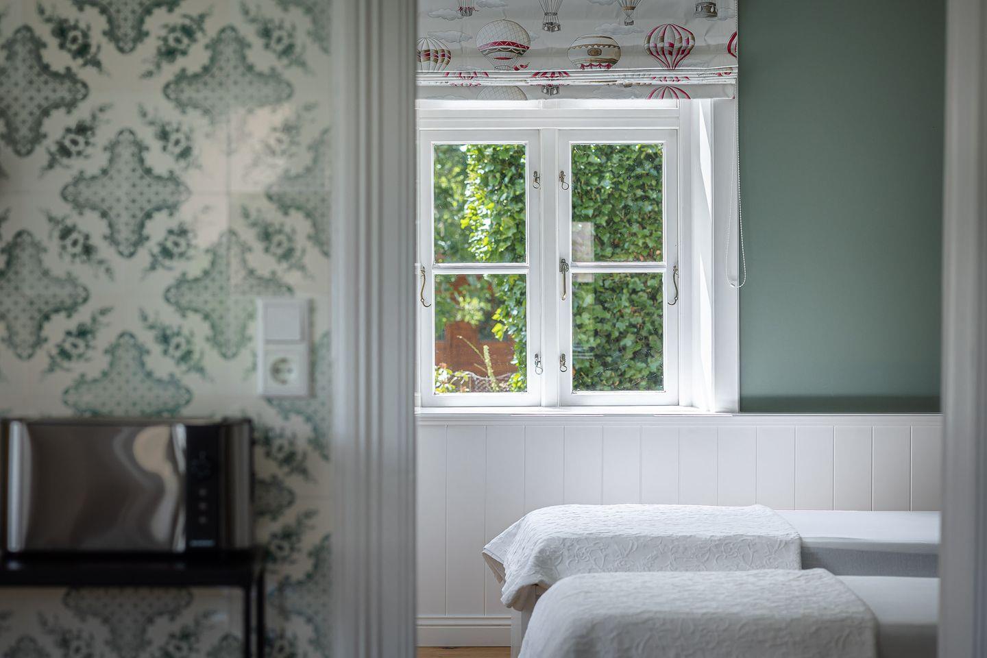 Durch die großen Fenster fällt viel Tageslicht in den kombinierten Wohn-/Essbereich. Im Erdgeschoss befindet sich ein Schlafzimmer mit zwei Einzelbetten sowie ein großzügiges Badezimmer mit bodengleicher Dusche. Die modernen Elemente der Küche vereinen sich hier mit traditionellen Wandfliesen, welche bewusst bei der Renovierung in 2018 erhalten worden sind. Die Terrasse ist durch den Eingangsbereich zu betreten, welcher ebenfalls an die Küche angrenzt - so können frühe Sonnenstrahlen bereits beim Frühstücken getankt werden. Der kombinierte Wohn- und Essbereich überzeugt mit dem historischen Ofen, der auch an kalten Tagen des Jahres für eine wohlig angenehme Raumatmosphäre sorgt.