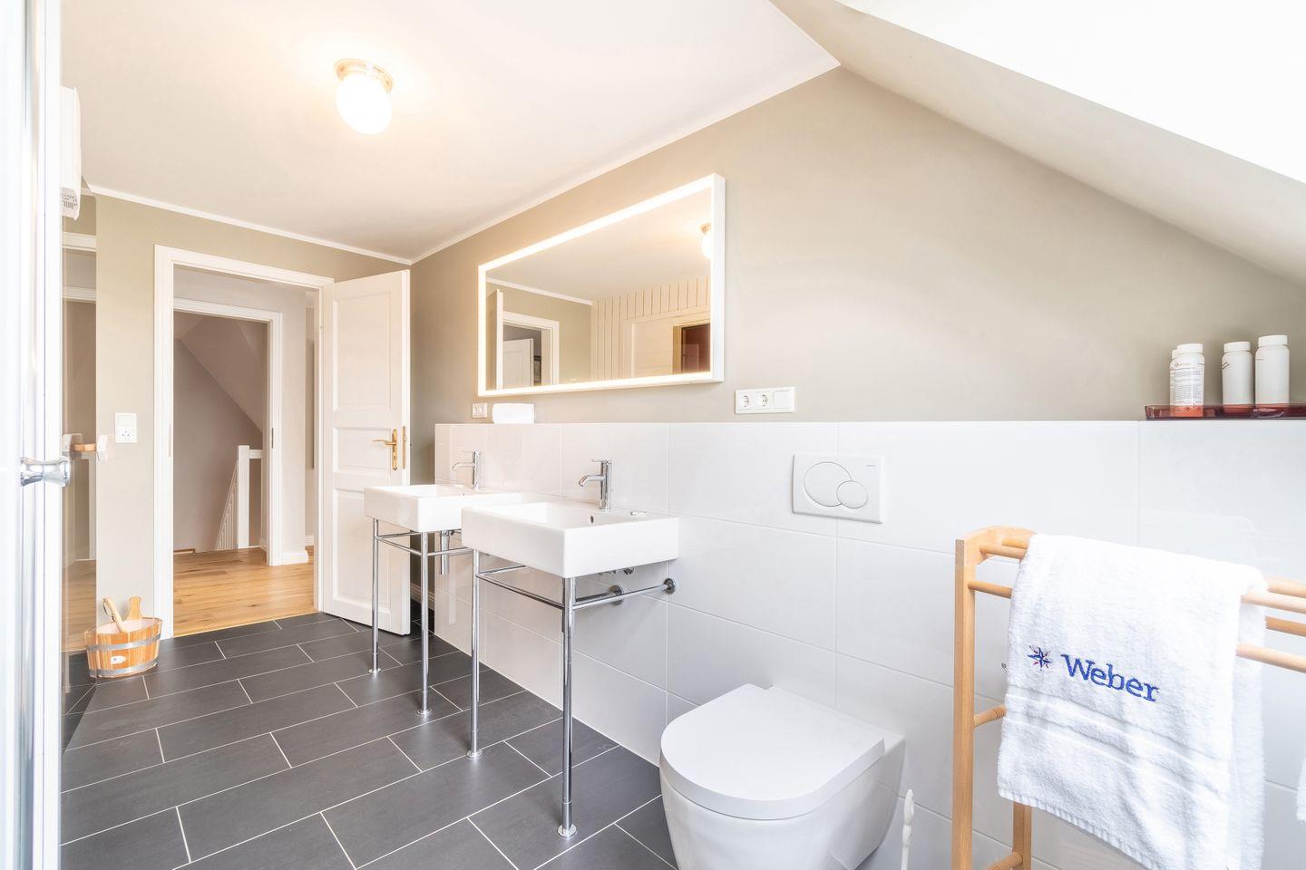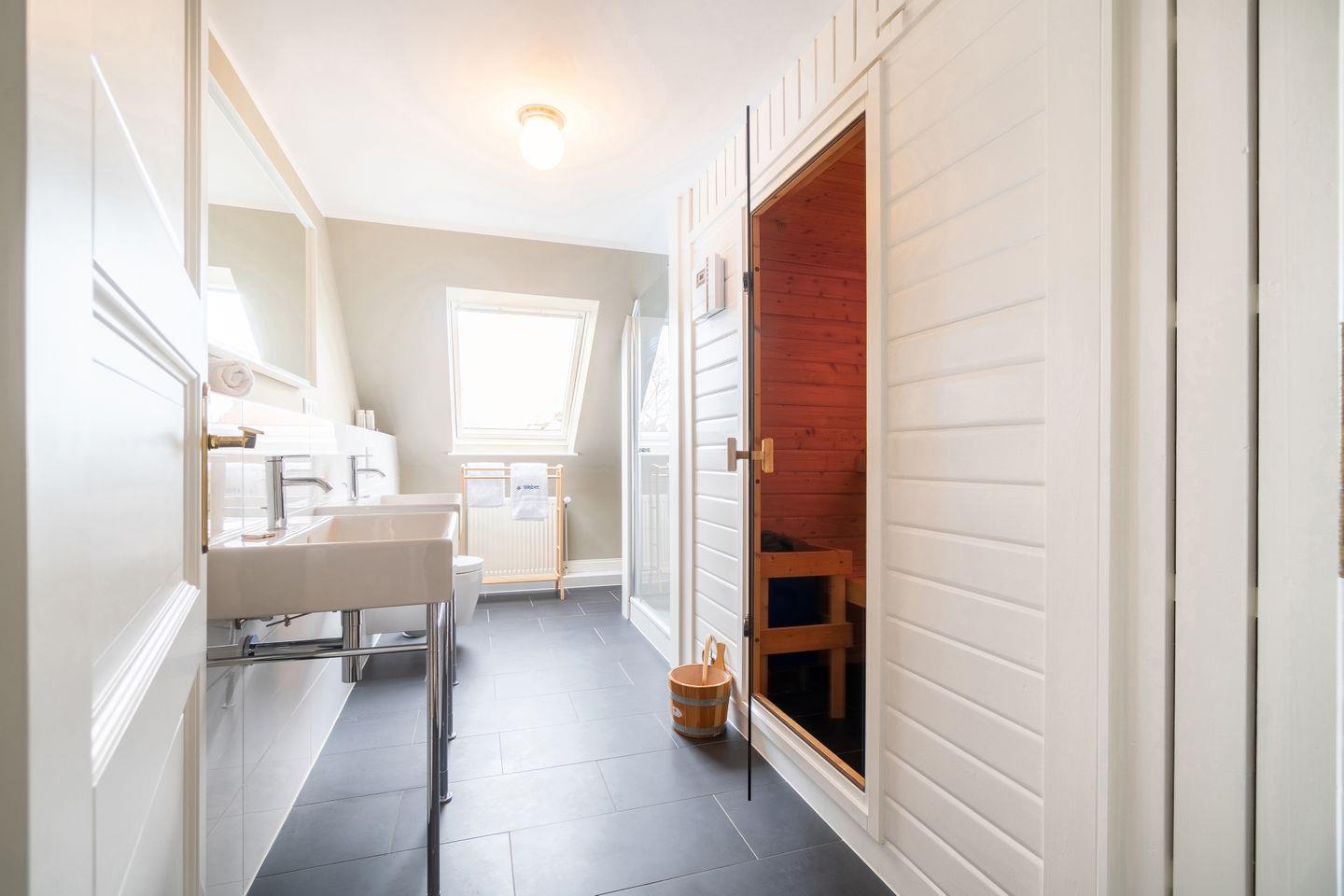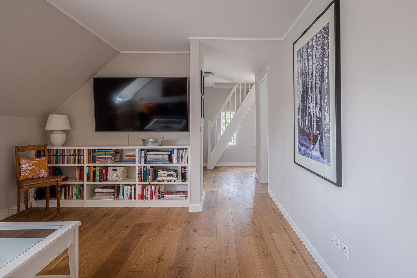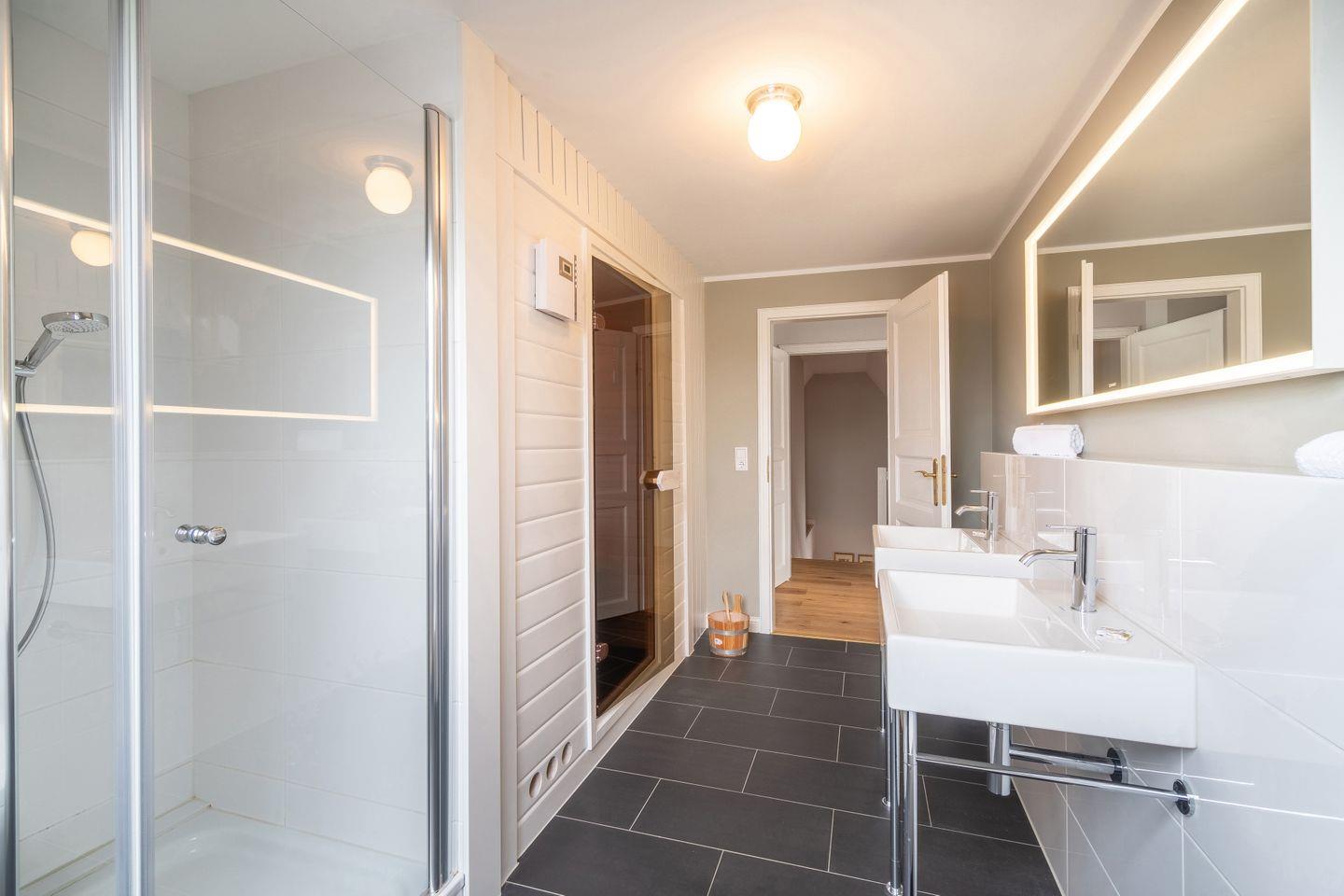 Im Obergeschoss befinden sich insgesamt drei weitere Schlafzimmer und zwei Bäder. Eines der Badezimmer enthält die hauseigene Sauna. Gegenüber des Bades befindet sich ein weiterer Wohnbereich, ausgestattet mit einem Sofa, einem Arbeitsplatz sowie modernem Smart-TV (Samsung Frame). Ein weiterer Fernseher befindet sich in einem der drei Schlafzimmer im OG. Eines der beiden Doppelbetten lässt sich in zwei Einzelbetten aufteilen.