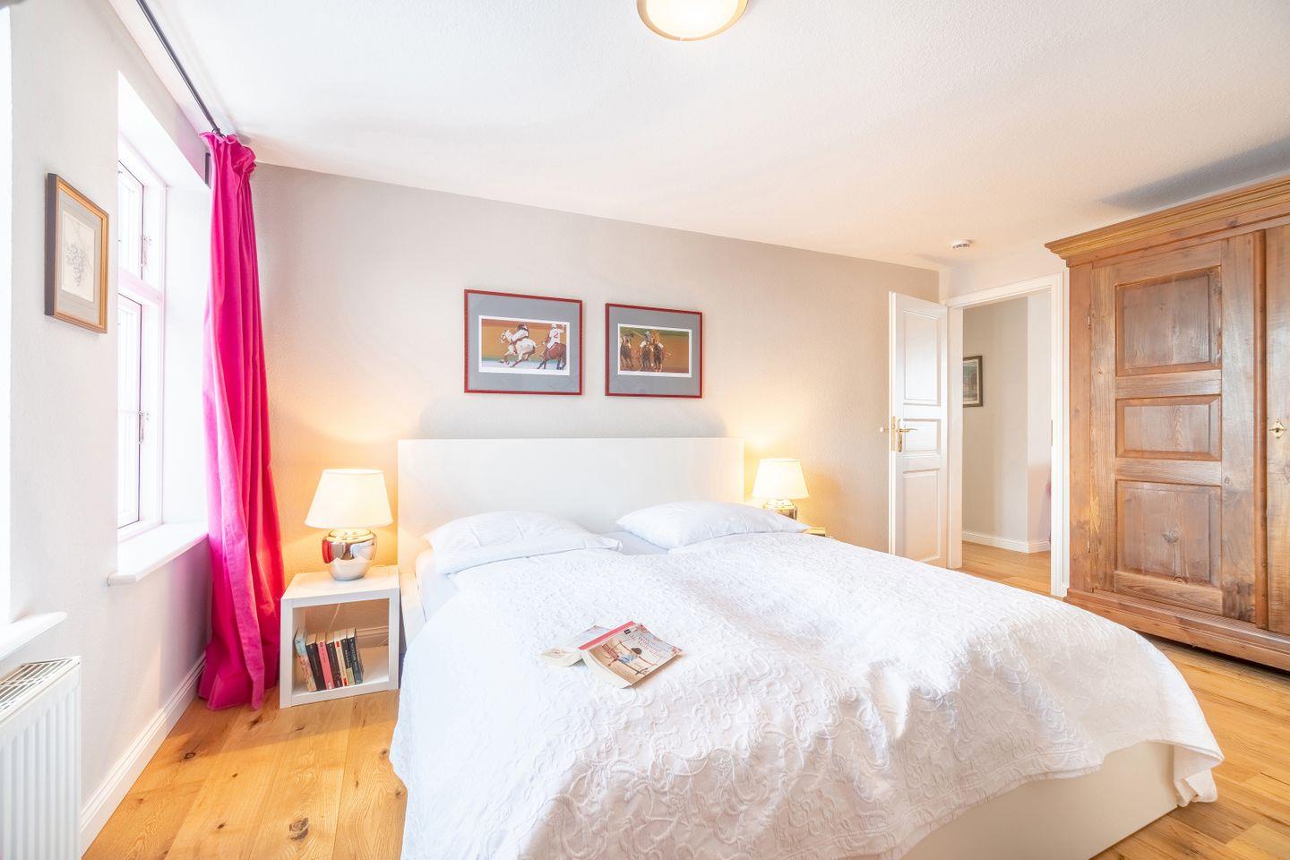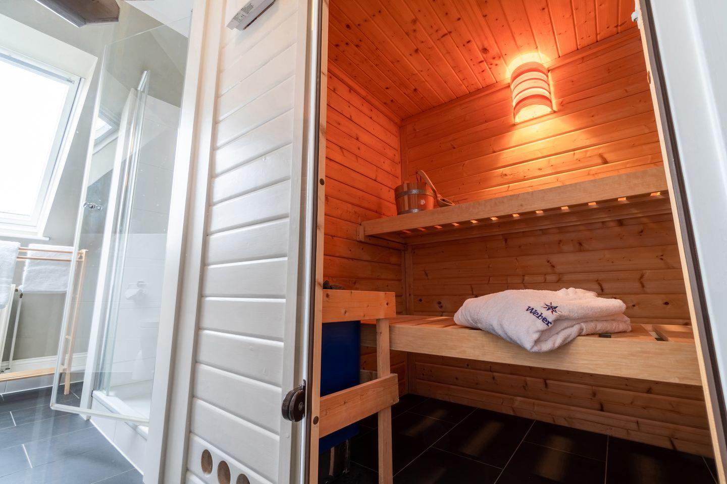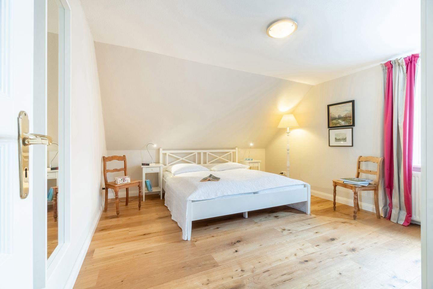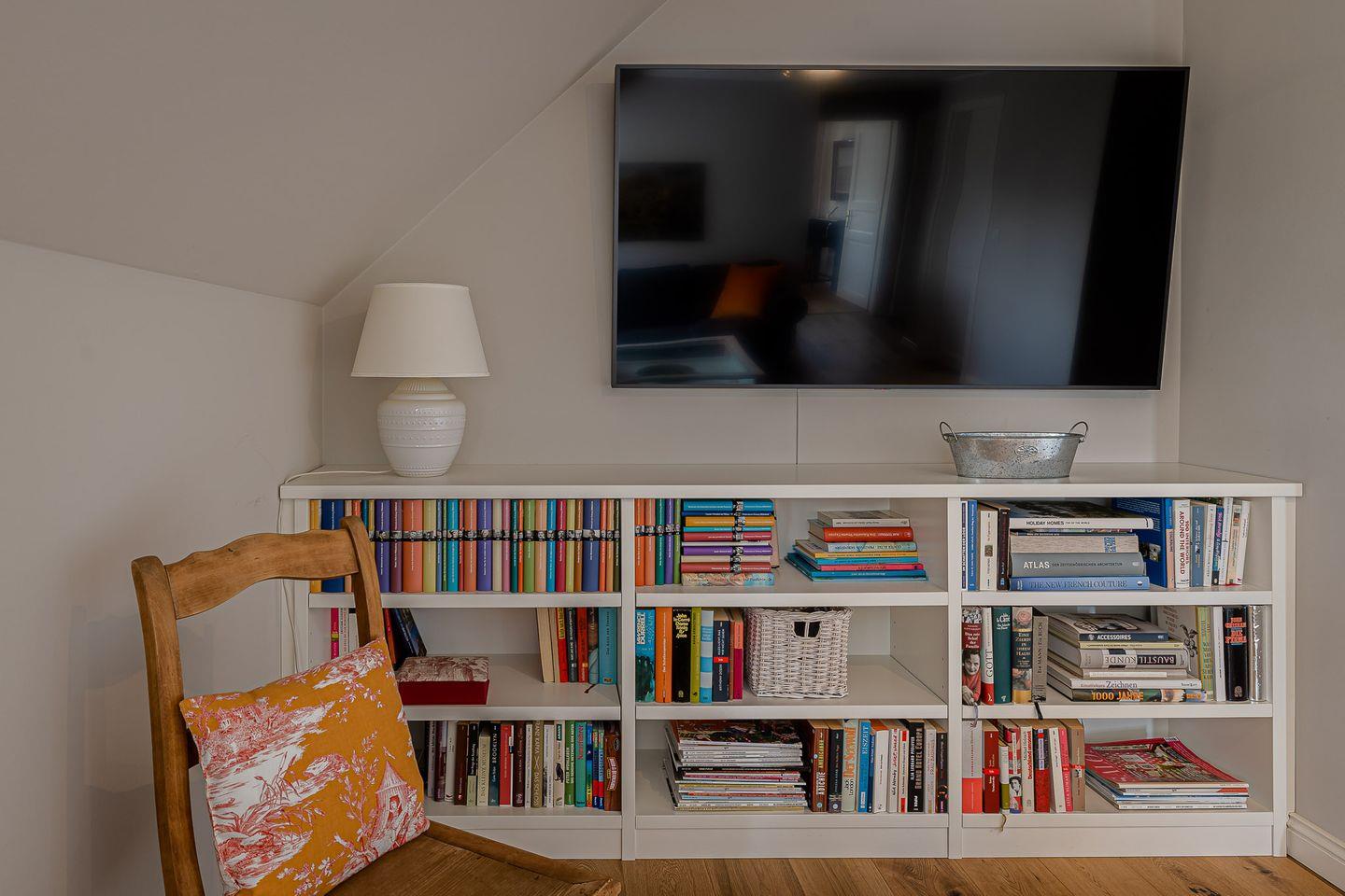 Im Obergeschoss befinden sich insgesamt drei weitere Schlafzimmer und zwei Bäder. Eines der Badezimmer enthält die hauseigene Sauna. Gegenüber des Bades befindet sich ein weiterer Wohnbereich, ausgestattet mit einem Sofa, einem Arbeitsplatz sowie modernem Smart-TV (Samsung Frame). Ein weiterer Fernseher befindet sich in einem der drei Schlafzimmer im OG. Eines der beiden Doppelbetten lässt sich in zwei Einzelbetten aufteilen.