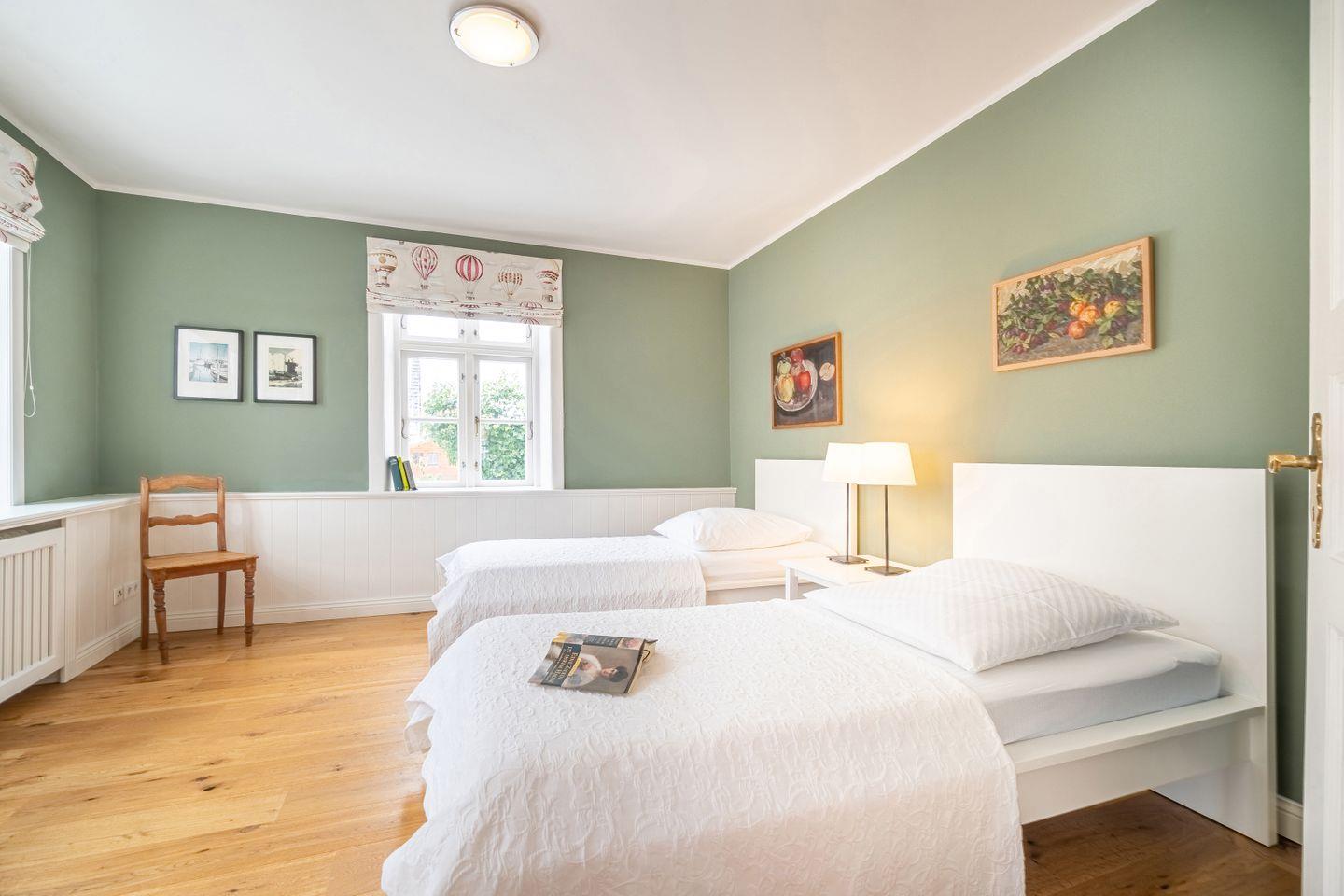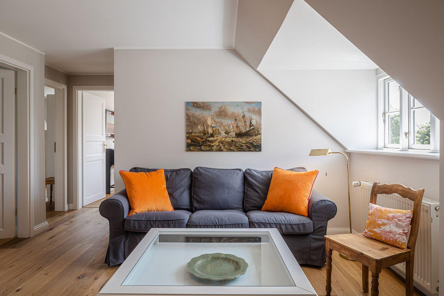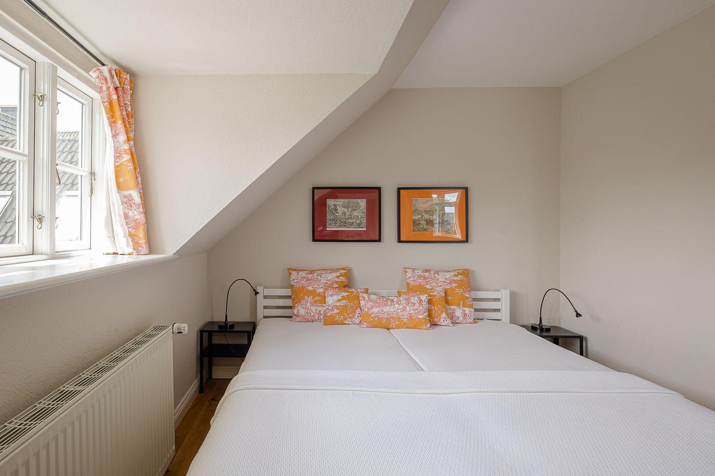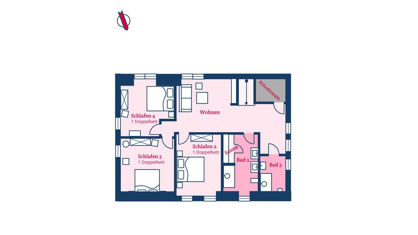 Im Obergeschoss befinden sich insgesamt drei weitere Schlafzimmer und zwei Bäder. Eines der Badezimmer enthält die hauseigene Sauna. Gegenüber des Bades befindet sich ein weiterer Wohnbereich, ausgestattet mit einem Sofa, einem Arbeitsplatz sowie modernem Smart-TV (Samsung Frame). Ein weiterer Fernseher befindet sich in einem der drei Schlafzimmer im OG. Eines der beiden Doppelbetten lässt sich in zwei Einzelbetten aufteilen.