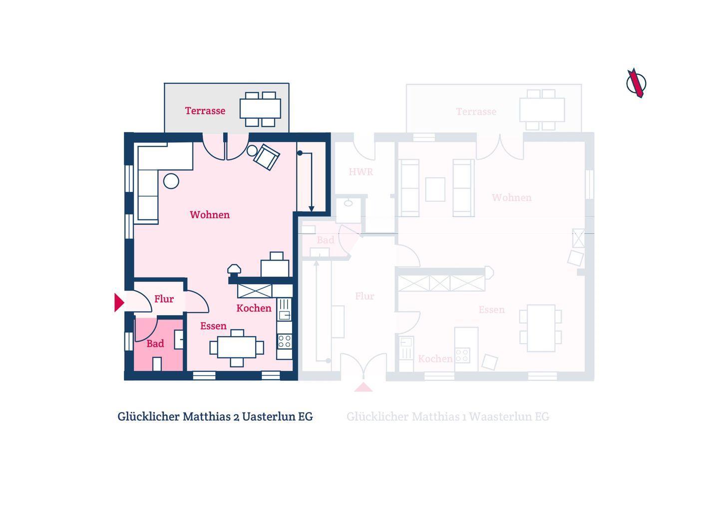 Unser Reethus verfügt über zwei Wohnungen mit separaten Eingängen. Jede Wohnung verfügt über einen Gartenanteil inklusive einer Terrasse und einem Strandkorb.
