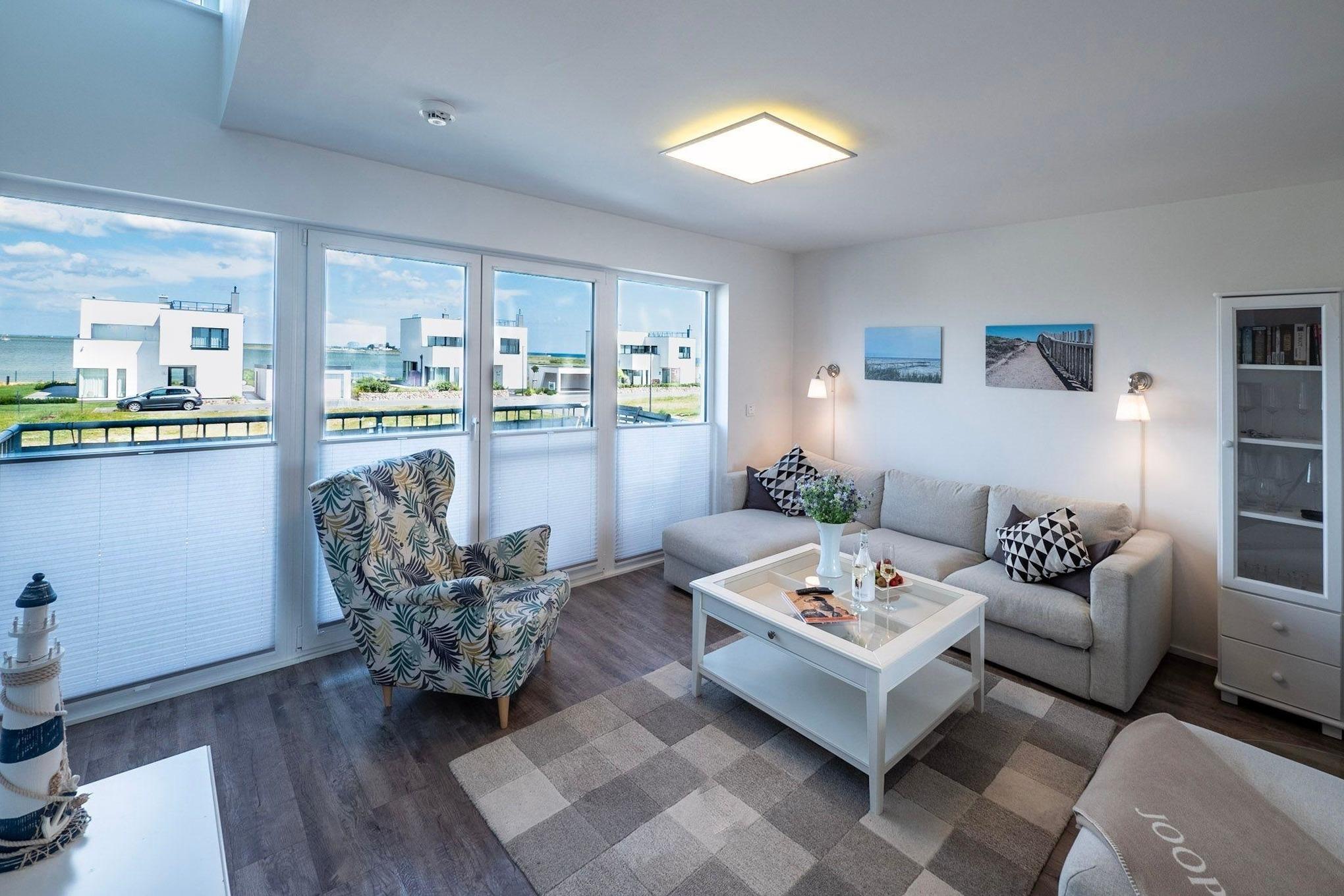 Im Fokus steht aber der perfekt umgesetzte lichtdurchflutete Wohn- und Essbereich mit Holz befeuertem Kaminofen, bodentiefen Panoramafenstern, welcher Loftartig gestaltet ist, sodass alle Räume fließend ineinander übergehen und sich der Wohnbereich mit der Natur verbindet. Die Integration der offenen Küche mit hervorragender Ausstattung und funktionalem Design, steht dem gemütlichen Beisammensein auch beim Zubereiten von allerlei Köstlichkeiten nichts im Wege. Die Wasserkulisse vor dem Essbereich mit 180 Grad Panoramablick auf den gesamten Hafen und die Ostsee ist hierbei zum Greifen nah – das ist Ostseeflair. Den zweiten Nordbalkon (ca. 8m²) betritt man über den Wohnbereich, hier können es sich unsere Gäste auf einer zusätzlichen Bestuhlung gemütlich machen und bei einem Sundowner mit Abendsonne den Tag ausklingen lassen.