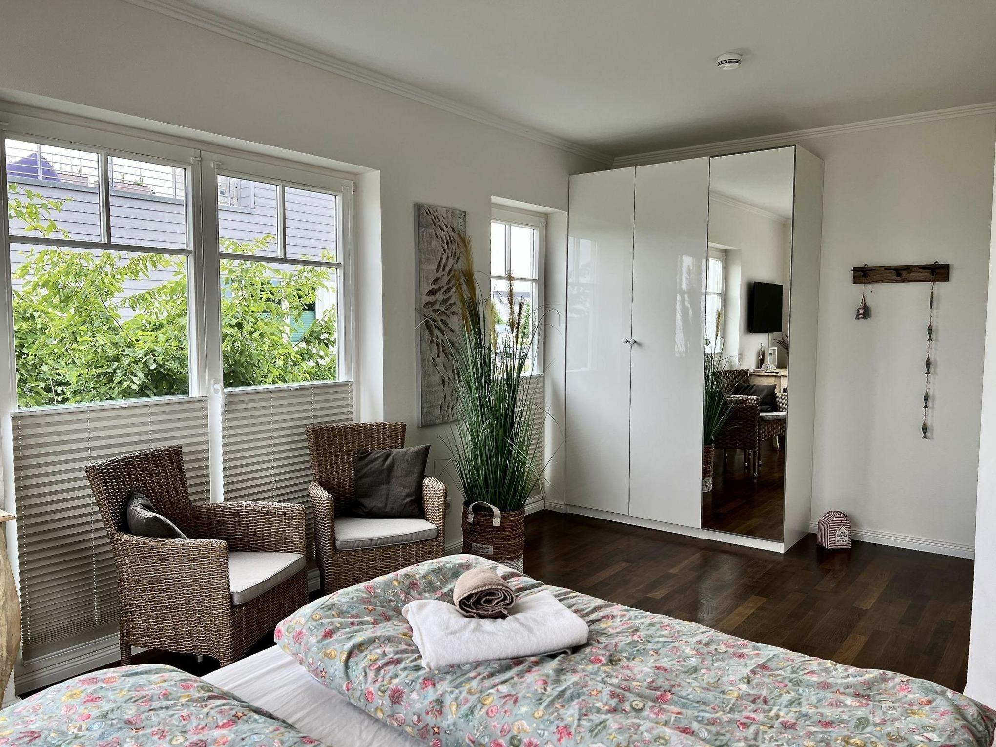 Über eine imposante Wendeltreppe gelangt man in das Obergeschoss. Zwei großzügige Schlafzimmer mit hochwertigen Boxspringbetten für vier Personen, garantieren einen wunderbar entspannten Schlaf und schöne Träume. Doch möchte man eigentlich bei diesem Ausblick schlafen...? Das Beruhigende ist: man wacht mit demselben traumhaften Ausblick wieder auf. Jedes Schlafzimmer punktet insbesondere mit dem direkten Zugang zum Balkon und dem traumhaften Ausblick auf die Schlei, sowie einen kleinen Schreibtisch für diejenigen, die im Urlaub ein wenig Arbeiten müssen. High Speed WLAN über Glasfaser und ein 43 Zoll Smart TV in jedem Schlafzimmer, ist in diesem Ferienobjekt selbstverständlich.