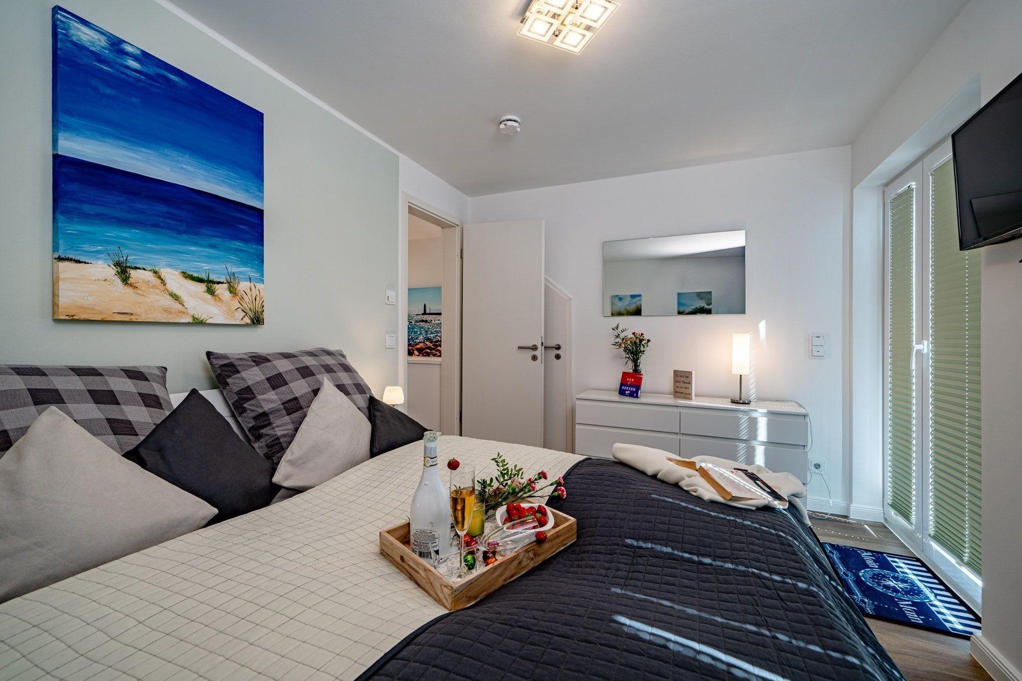 Im ersten Obergeschoss befinden sich zwei Schlafzimmer mit Wasserblick. Das Hauptschlafzimmer, zum Hafen hin ausgerichtet, ist mit einem Doppelbett ausgestattet und bietet Zugang zu einem Balkon sowie zur großen Dachterrasse. Das zweite Schlafzimmer bietet einen Blick auf den Ostseefjord Schlei und verfügt über zwei flexible Einzelbetten. Beide Schlafzimmer sind mit zusätzlichen Flatscreen-TVs und verdunkelbaren Plissees ausgestattet.