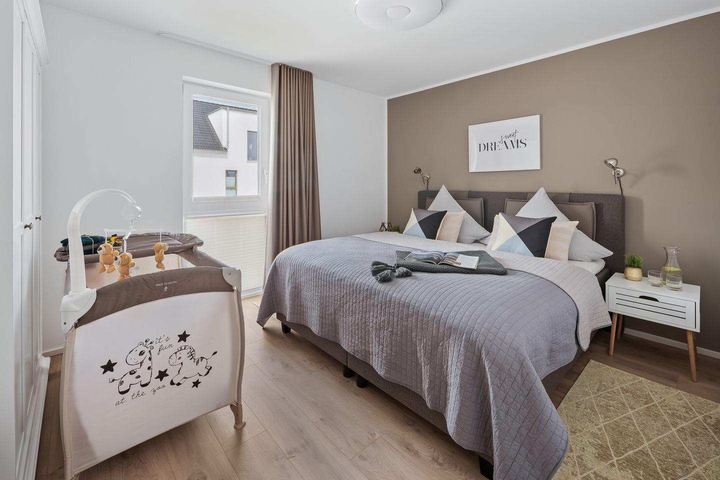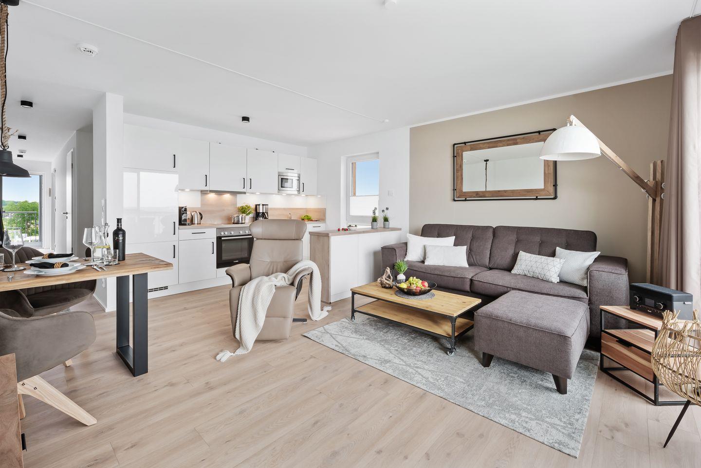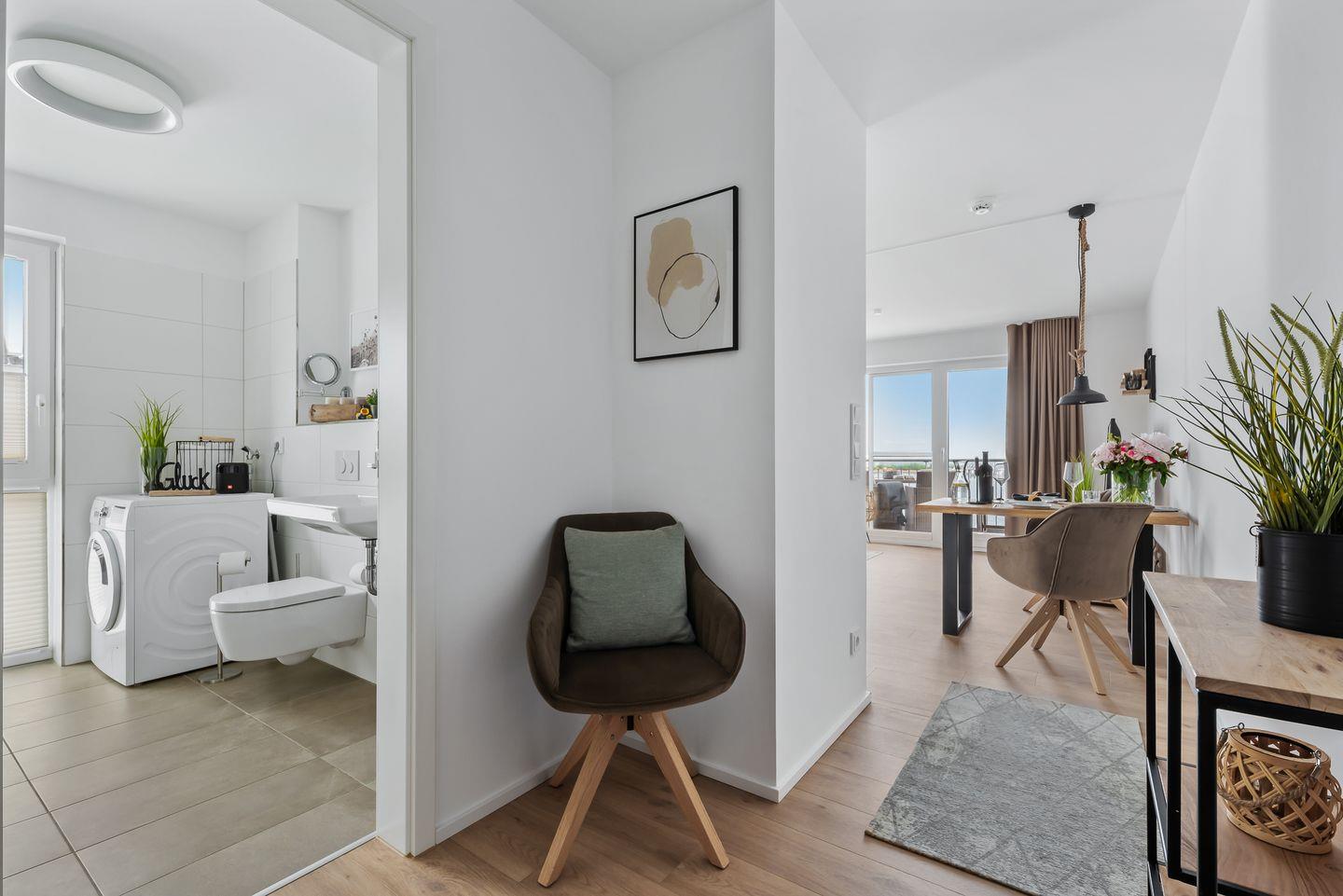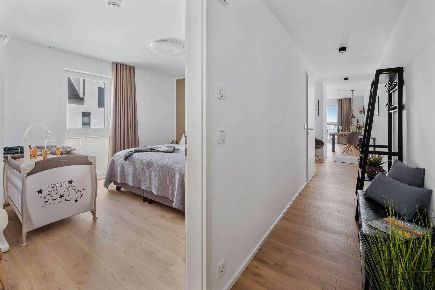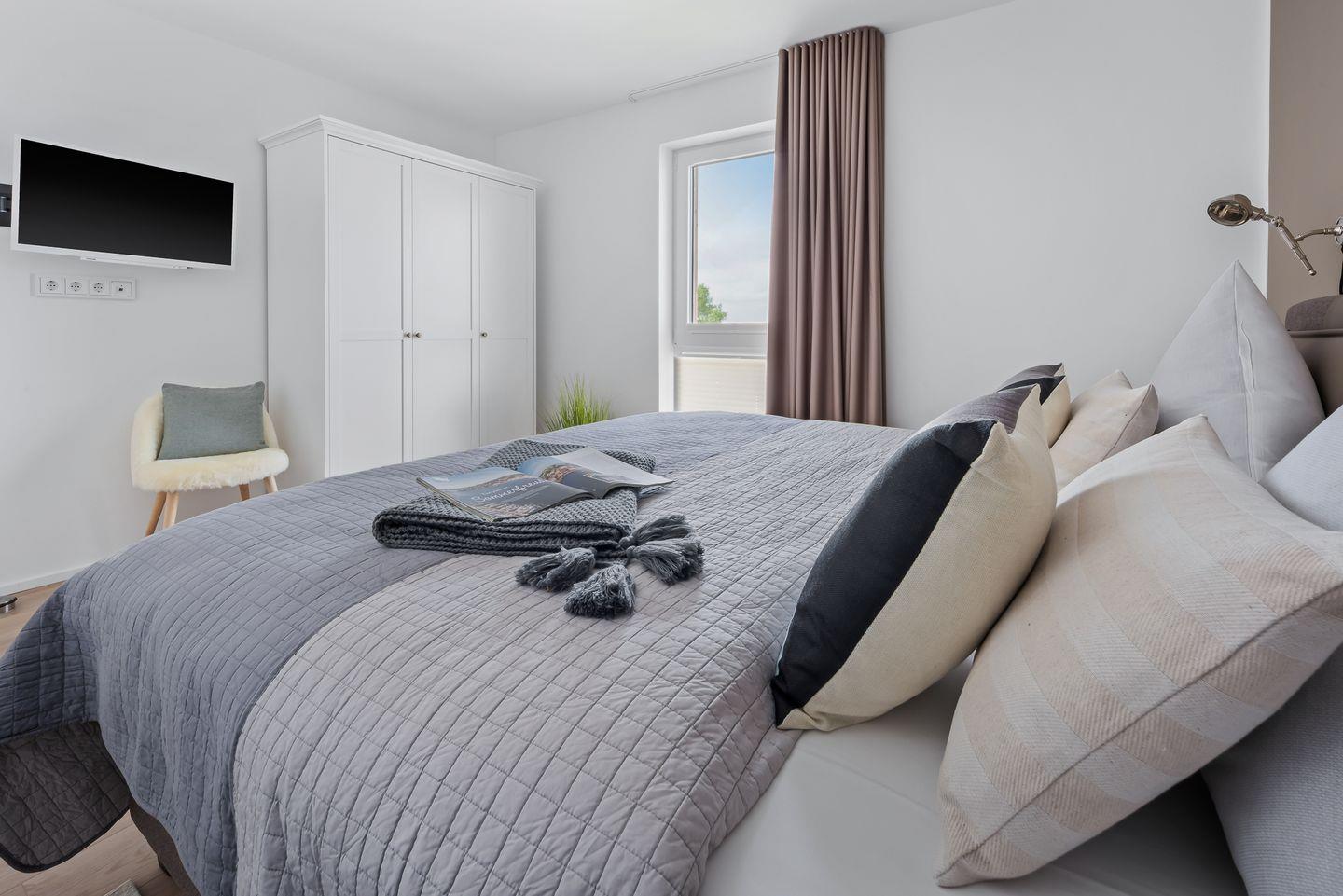 "HAFEN & MEER" - der Name hält, was er verspricht und noch ein wenig MEER. Diese Ferienwohnung "HAFEN & MEER" liegt zentral an der belebten Hafenpromenade, die mit Restaurants und Geschäften aufwartet, und bietet einen freien Blick auf den Segel- und Sportboothafen. Da es sich um eine Eckwohnung im 2. Obergeschoss handelt, können Sie die Weite über die schwimmenden Häuser und den Ostseefjord Schlei uneingeschränkt genießen. Für alle, die das Meer lieben, immer wieder ein faszinierendes Erlebnis! Ganz gleich, ob Sie Essen in der Küche zubereiten, am Tisch die Mahlzeit einnehmen oder auf dem bequemen Sofa entspannen – durch die bodentiefen Fenster haben Sie immer den traumhaften Blick auf HAFEN & MEER. Aufgrund der exklusiven Lage bietet die Wohnung ein Tageslichtbad, das nicht nur mit einer bodengleichen Dusche aufwarten kann, sondern auch mit Waschmaschine und Trockner. Ein JBL Radio sorgt für gute Laune beim Aufstehen. Im Schlafzimmer erwarten Sie ein komfortables Doppelbett (180x200cm) und zusätzlich ein TV. Das Doppelbett bietet Ihnen zwei Einzelmatratzen, die unterschiedliche Härtegrade für Sie bereithalten: 1xH2, 1xH3. Ebenso steht Ihnen eine Kissenauswahl für Ihre individuellen Bedürfnisse zur Verfügung. Einem erholsamen Schlaf steht also nichts im Wege! Außerdem bietet das Schlafzimmer ein Babybett mit Wickelmöglichkeit. Komfort ist natürlich auch in der perfekt ausgestatteten Küchenzeile anzutreffen, die sich im offenen Wohn-Essbereich befindet. Die Küche verfügt unter anderem über einen Handmixer, Kuchenformen und eine Teekanne. Das Interieur dieses Raumes orientiert sich am Industriedesign und strahlt mit seinen klaren Formen und Linien ein elegantes und ruhiges Flair aus. Der Fahrstuhl bringt Sie und Ihr Gepäck bequem in diese wunderschöne und familienfreundliche Ferienunterkunft. Was möchte man MEER? Unser Lieblingsplatz: bei Sonnenuntergang auf dem Balkon mit einem Kaltgetränk in der Hand dem Leben und der Natur zuschauen. Direkt am Gebäude steht ein PKW-Stellplatz mit einer Ladesäule für Elektroautos zur Verfügung.
