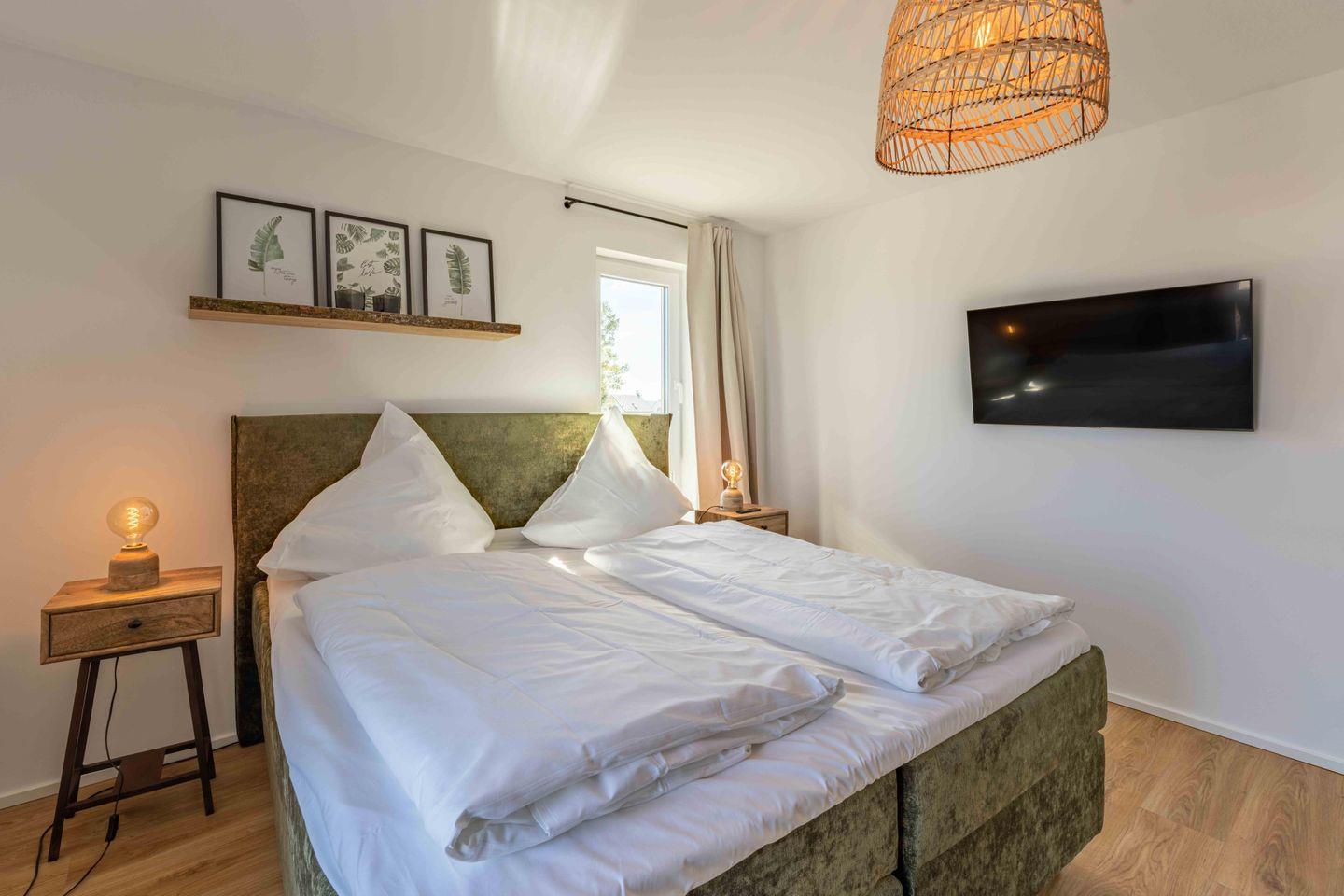 Die Ferienwohnung "Gode Tied" befindet sich im neuerbauten OstseeResort Olpenitz. Starten Sie Ihren wohlverdienten Urlaub in der exklusiven Ferienwohnung "Gode Tied" mit ca. 120m² auf zwei Ebenen für bis zu 6 Personen. Der Hafen Olpenitz auf der einen – die ruhige Ostsee auf der anderen Seite. Somit ist die "Gode Tied" der perfekte Ort zum Abschalten: alleine, zu zweit, mit Freunden oder mit der gesamten Familie. Das große, stilvolle Wohn-/Esszimmer verführt mit einem Kamin und einem gemütlichen Sofa & direktem Zugang zur großen Terrasse mit Ostseeblick. Ein moderner Esstisch mit 6 Stühlen und Kinderhochstuhl laden zu gemütlichen Abenden und Beisammensein ein. Die Wohnung ist exklusiv und geschmackvoll ausgestattet und doch alltagstauglich für die ganze Familie. Der Kamin lädt Sie an kalten Tagen ein, es sich gemeinsam gemütlich zu machen und den atemberaubenden Wasserblick zu bestaunen. Auf den beiden Balkonen (einer davon teilüberdacht), können Sie den tollen Ausblick, die frische Ostseeluft und Sonnenuntergänge genießen. Beide Balkone sind mit Außenmöbeln ausgestattet und ein Grill der Firma "Weber" lädt zu gemütlichen Grillabenden ein. Die offen und modern gehaltene Küche ist hochwertig und voll ausgestattet und verfügt ebenso über einen tollen Ausblick direkt auf den Hafen. Das Appartment verfügt über 3 Schlafzimmer mit Boxspringbetten (180x200cm). Außerdem gibt es Smart-TV's in allen Schlafzimmern, ebenso im Wohnzimmer. Die Ferienwohnung verfügt über zwei moderne und helle Badezimmer. Das eine Badezimmer verfügt über eine Infrarot-Sauna, hier können Sie dem Alltagsstress entfliehen und sich entspannen. Zudem gibt es eine ebenerdige Dusche. Das andere Badezimmer verfügt über eine Badewanne und ebenso über eine Waschmaschine. Ein PKW-Stellplatz ist neben dem Haus vorhanden.