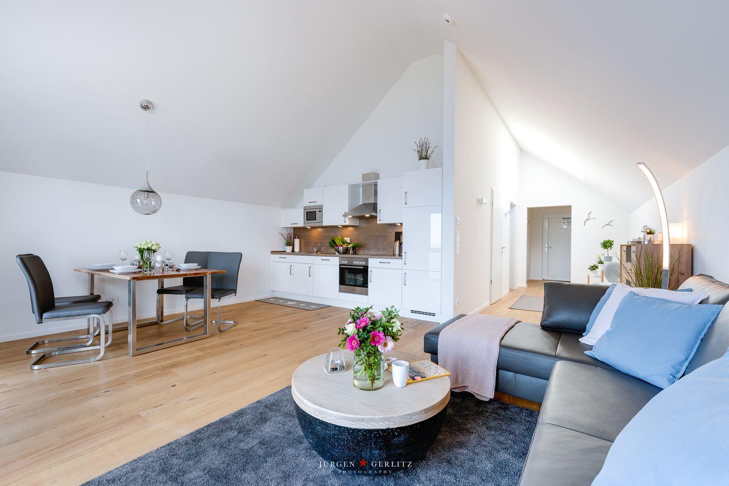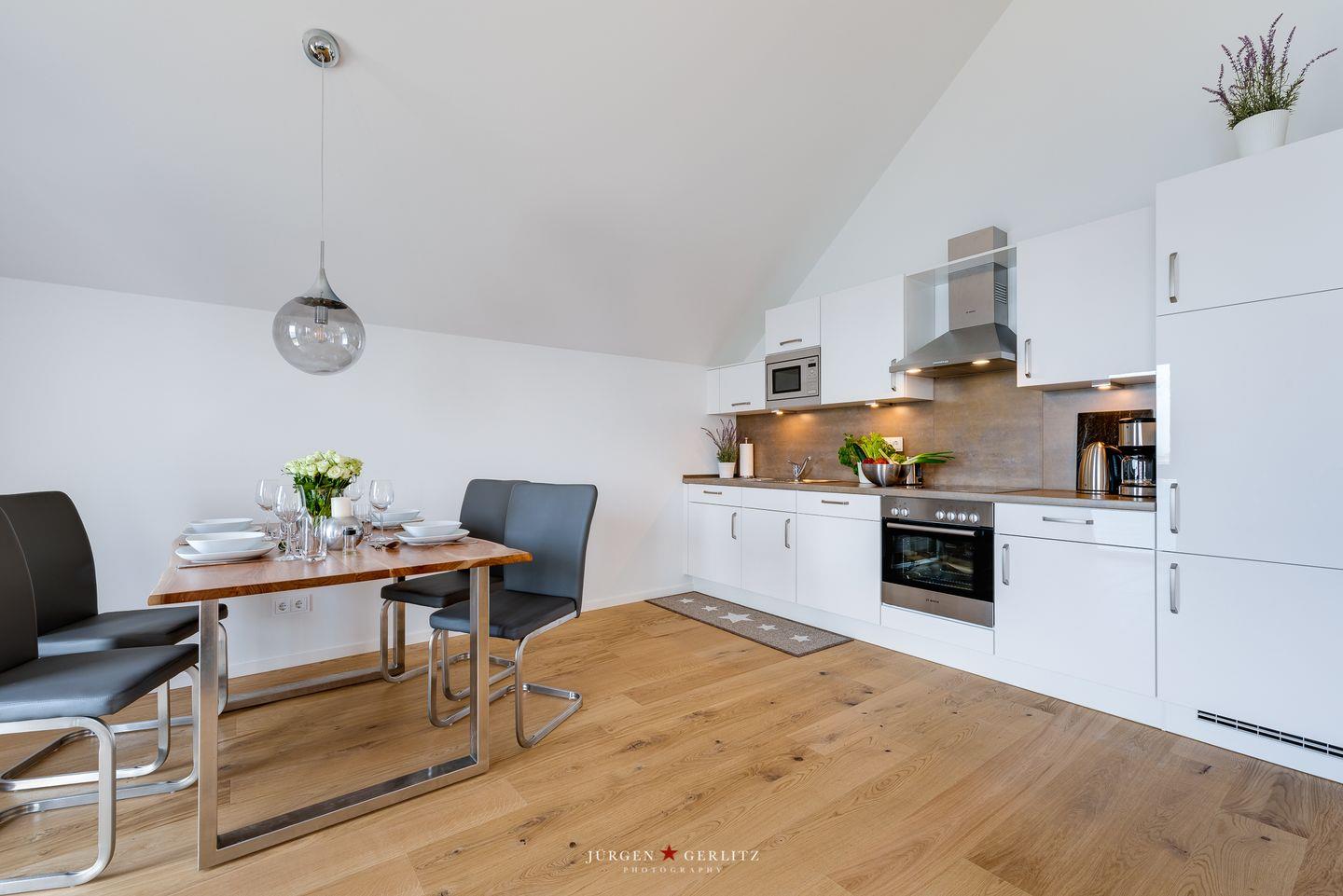 Tauchen Sie ein in die exklusive Welt der Ferienwohnung "Sailors View" – eine atemberaubende Oase nur einen Katzensprung vom Wasser entfernt. Auf großzügigen 66m² erwartet Sie ein Wohntraum mit einem faszinierenden Ausblick auf den Hafen und die malerische Schlei. Der loftähnlich gestaltete Wohn- und Essbereich beeindruckt durch seine anteilig bodentiefen Fenster, die das Tageslicht in jede Ecke fluten lassen und die Atmosphäre zu jeder Tageszeit einladend gestalten. Die offene Küche ist voll ausgestattet, sodass Sie hier wunderbar gemeinsam kochen können. Das hochwertig eingerichtete Schlafzimmer verspricht erholsame Nächte in einem gemütlichen Doppelbett (180x200cm), während im Wohnzimmer ein komfortables Schlafsofa Platz für zwei weitere Personen bietet. Ein weiteres Highlight erwartet Sie im großzügigen Badezimmer mit einer geräumigen ebenerdigen Dusche – ein Ort des puren Wohlfühlens und der Entspannung. Erwähnenswert ist ebenfalls der Balkon, der Ihnen einen fantastischen Ausblick schenkt. Hier können Sie den Tag mit einem Glas Wein ausklingen lassen und dabei die maritime Atmosphäre in vollen Zügen genießen.