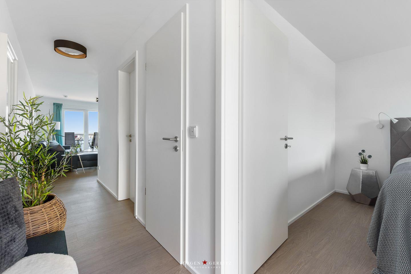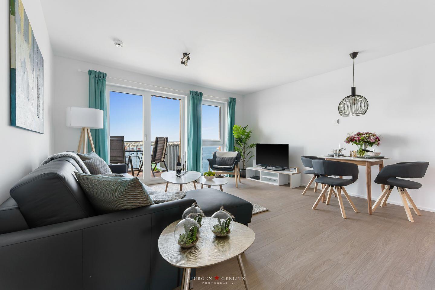 Herzlich willkommen in der bezaubernden Ferienoase "Sea Haven", wo auf ca. 55m² ein traumhafter Blick auf den Hafen und die malerische Schlei auf Sie wartet. Der Wohnbereich ist loftartig gestaltet und verfügt neben einem gemütlichen Sofa über eine moderne Küche und einen stilvollen Essbereich. Die bodentiefen Fenster machen die Wohnung zu einem wahren Lichtblick. Die Küche ist komplett ausgestattet, sodass Sie nach Lust und Laune kochen können. Im Wohnzimmer bietet das Schlafsofa zusätzliche Schlafplätze. Im Schlafzimmer erwartet Sie ein großzügiges Doppelbett (180x200cm), und sowohl hier als auch im Wohnzimmer stehen Ihnen Verdunklungsmöglichkeiten zur Verfügung – für erholsame Urlaubsnächte. Das geräumige und moderne Bad verfügt über eine bodengleiche Dusche. Das Highlight der Wohnung ist der Balkon, von dem Sie einen atemberaubenden Blick auf das Wasser genießen können. Hier lassen Sie den Tag bei einem Glas Wein ausklingen und erleben die Ruhe und Schönheit des Hafens hautnah.