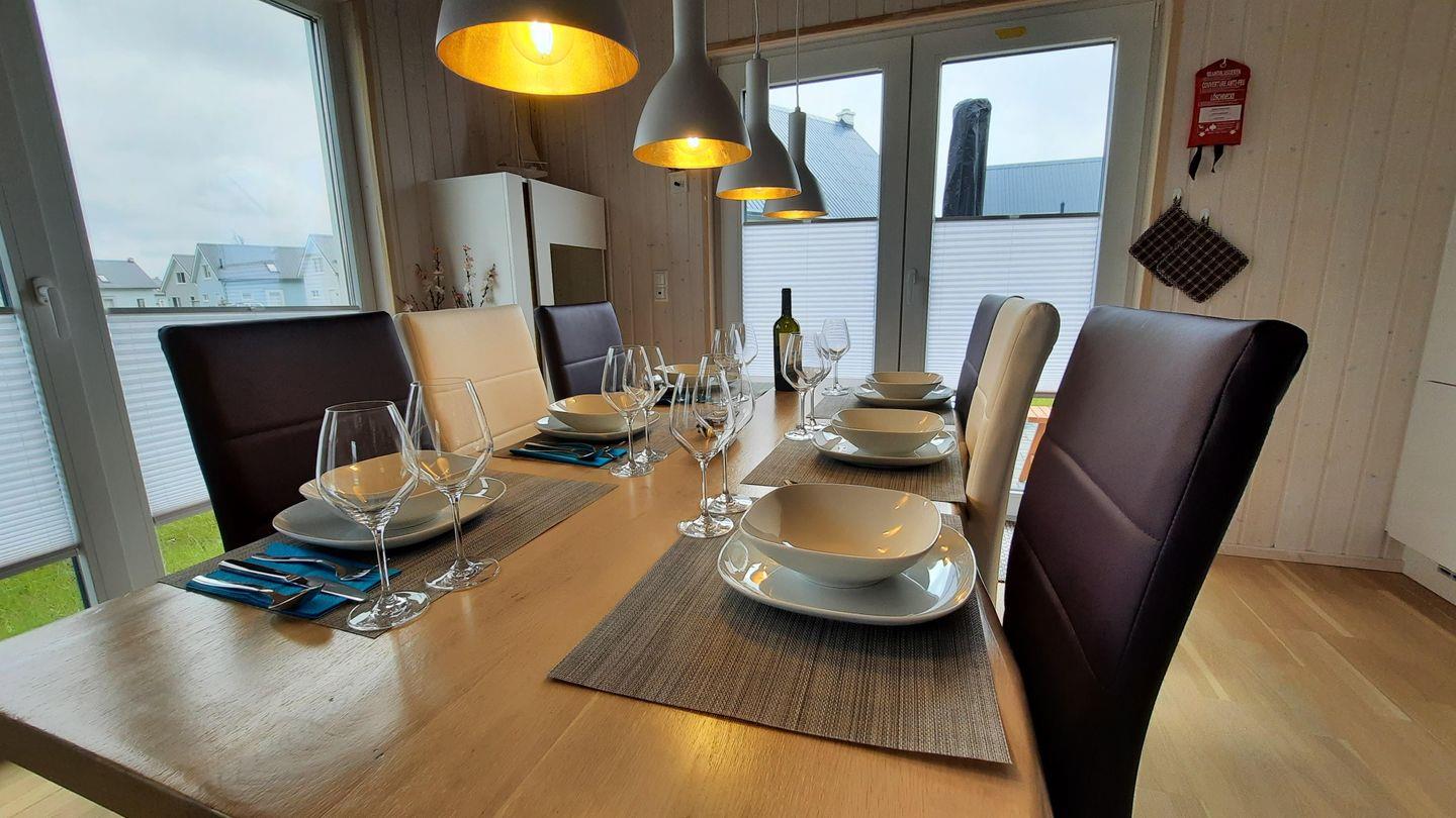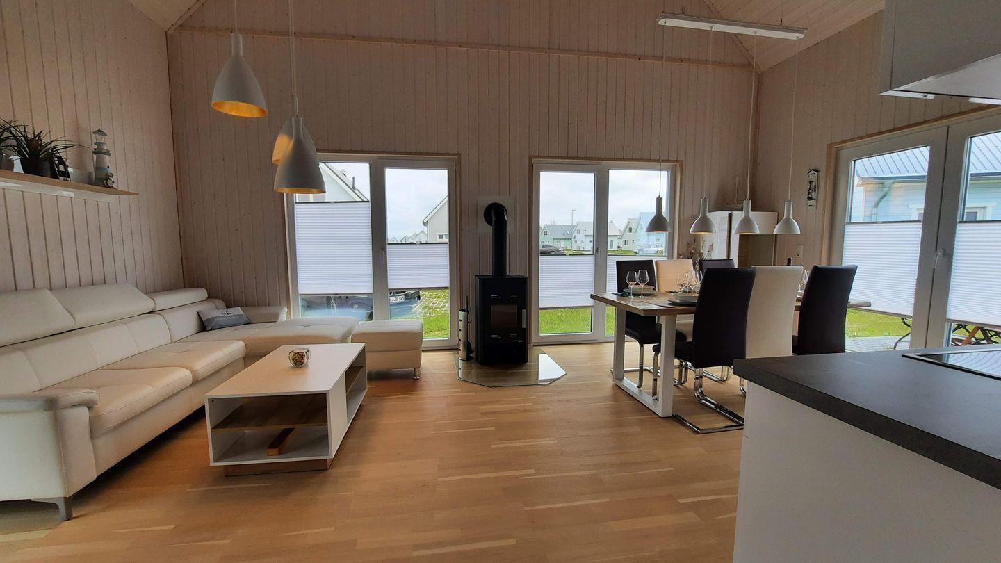 Das Haus verfügt über einen offenen Wohn- und Essbereich mit Kaminofen, eine Küche, drei Schlafzimmer und zwei Bäder. Die Küche ist voll ausgestattet. Auf der möblierten Terrasse können Sie gemütliche Grillabende verbringen. Zwei Schlafzimmer verfügen über je ein Doppelbett und das dritte Schlafzimmer über 2 Einzelbetten. Ein Bad ist mit einer Dusche ausgestattet, das Zweite mit einer Badewanne. Für Ihren PKW steht ein Stellplatz vor dem Haus zur Verfügung.