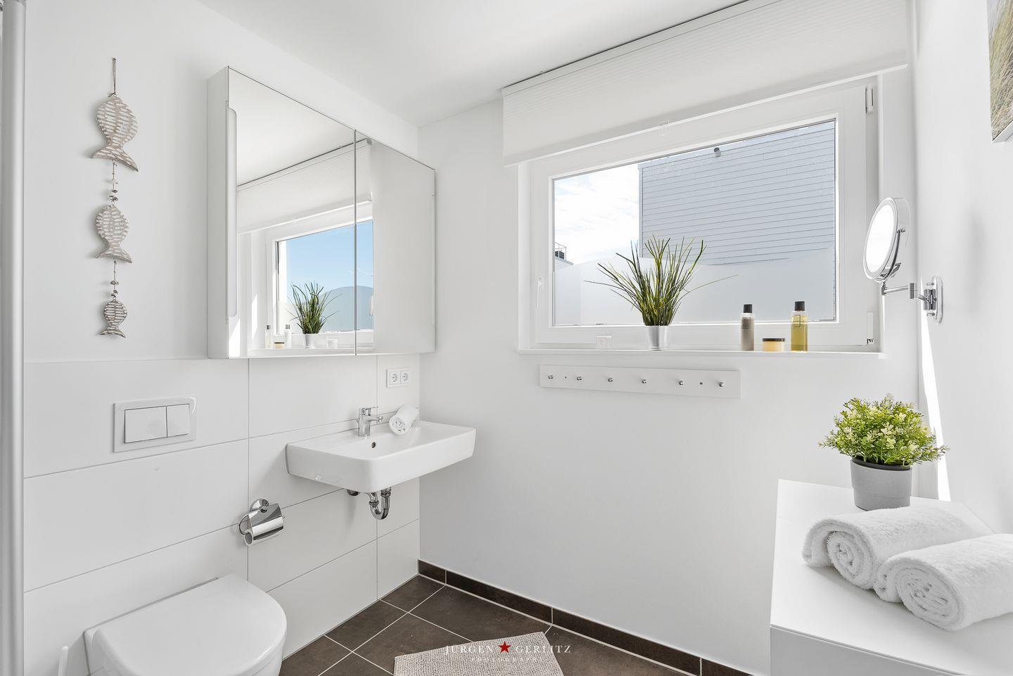 Das Badezimmer ist mit einer bodengleichen Dusche ausgestattet. Zu den Annehmlichkeiten des Ferienhauses zählt außerdem eine eigene finnische Sauna. Ob nach einem längeren Ausflug oder einfach zur inneren Ruhe – hier können Sie sich entspannen und wohlfühlen.