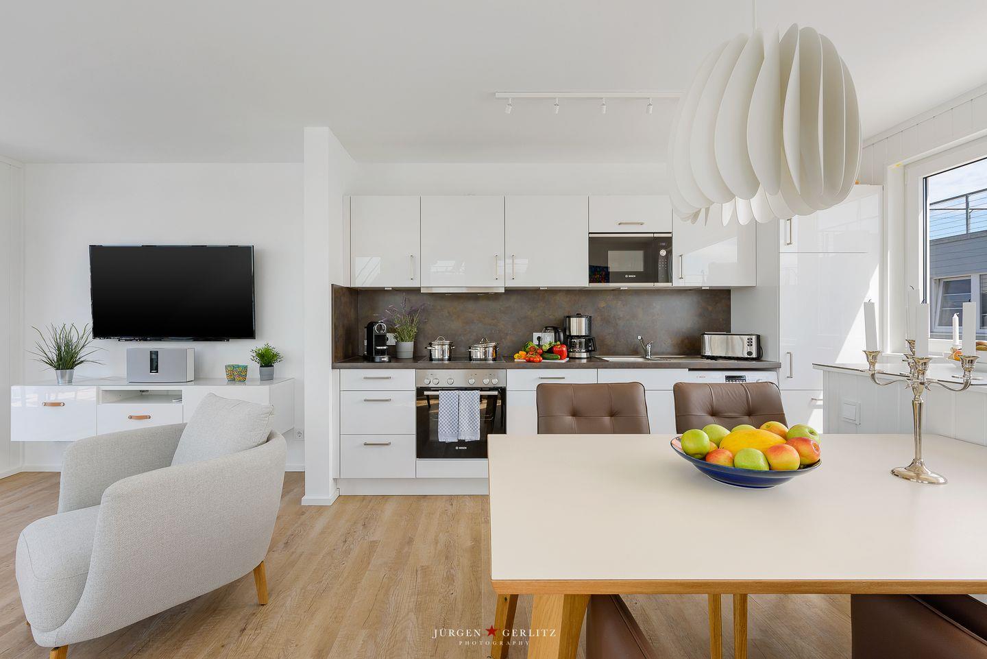 Die Unterkunft erstreckt sich über zwei Etagen, mit zwei komfortablen Schlafzimmern im Erdgeschoss, in denen Sie nach einem ereignisreichen Tag entspannen können. Der großzügige Wohnbereich ist offen gestaltet und bietet eine moderne Küche, die mit hochwertigen Geräten ausgestattet ist. Hier finden Sie alles, was Sie für Ihre kulinarischen Kreationen benötigen, einschließlich eines Herds, Backofens, Kühlschranks mit Gefrierfach, Geschirrspüler und einer Nespresso-Espressomaschine. Der Essbereich lädt zu gemeinsamen Mahlzeiten ein und schafft eine einladende Atmosphäre.