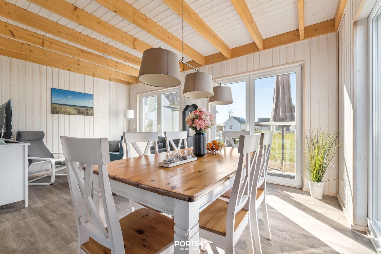 Willkommen im "Strandläufer" in Olpenitz! Das freistehende Haus verfügt über einen offenen Wohn- und Essbereich, eine Küche, zwei Schlafzimmer und zwei Bäder. Nach langen Strandspaziergängen können Sie auf dem gemütlichen Sofa vor dem Kamin entspannen und Ihre Lieblingsserie auf dem Flachbild-TV schauen. Das Sofa kann zu einer Schlafcouch (160x200cm) ausgezogen werden und bietet Platz für zwei Personen. Die Küche bietet alles, was Sie für einen geselligen Kochabend mit der Familie benötigen. Im Obergeschoss befinden sich die zwei Schlafzimmer. Das eine ist mit einem Doppelbett (180x200cm), das andere verfügt über zwei Einzelbetten (je 90x200cm). Beide Schlafzimmer sind mit je einem Kleiderschrank, Insektenschutzgitter und Verdunkelungsmöglichkeiten ausgestattet. Für die Kleinen stehen Ihnen ein Kinderhochstuhl, ein Kinderreisebett, ein Kindertritthocker im Duschbad und eine Wickelkommode in dem Schlafzimmer mit dem Doppelbett zur Verfügung. Ein Badezimmer befindet sich im Erdgeschoss und ist mit einer Dusche, einem Fön, Insektenschutzgitter und dem Highlight: einer Infrarot-Sauna ausgestattet. Hier können Sie sich an kalten Tagen aufwärmen und entspannen! Das andere Badezimmer im ersten Obergeschoss bietet eine Badewanne. An sonnigen Tagen können Sie es sich auf der möblierten Terrasse unter dem Sonnenschirm gemütlich machen! An lauen Sommerabenden können Sie mit der Familie die Tage auf der Terrasse ausklingen lassen. Dank des Holzkohlegrills steht auch einem Grillabend nichts im Weg. Ihre Fellnasen sind nicht nur geduldet, sondern herzlich Willkommen. Für Ihren PKW steht ein Stellplatz vor dem Haus zur Verfügung.