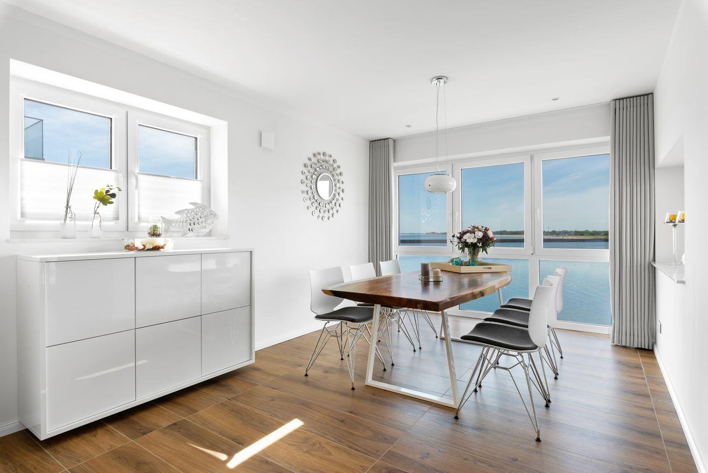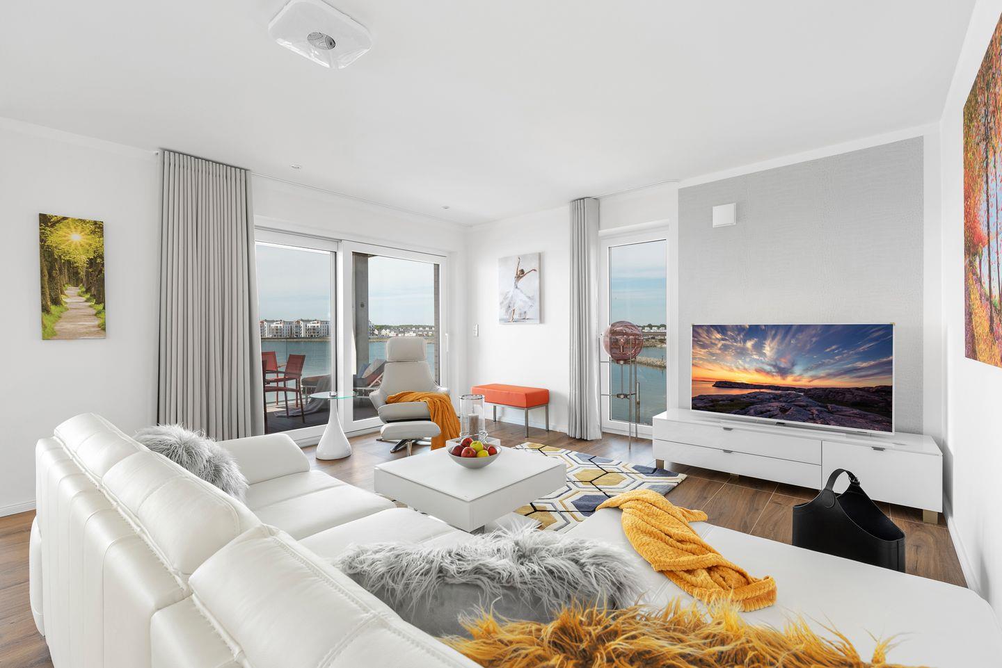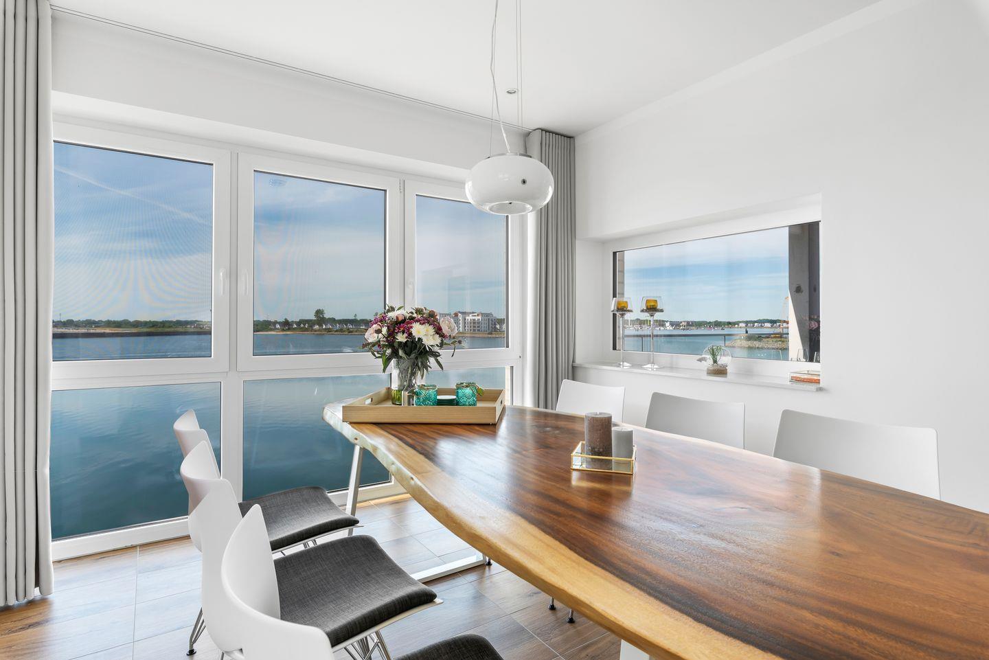 Das Apartment Brise bietet auf 113 qm genügend Platz für 5 Personen. Der große Wohn-Essbereich mit Südausrichtung, bodentiefen Fenstern und Blick auf die einlaufenden Segelyachten in die Marina Olpenitz bieten das perfekte Panorama, um einen erholsamen Urlaub zu genießen. Die bequeme Couch mit Schlaffunktion, der Smart-TV und der bequeme Lesesessel runden die stilvolle Einrichtung dieses besonderen Apartments ab.