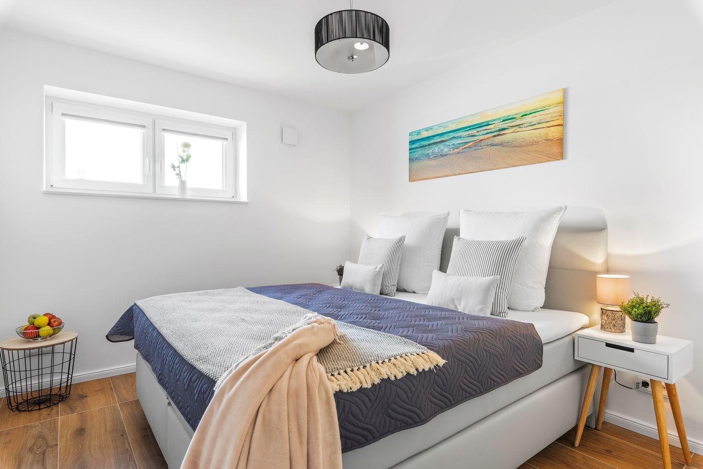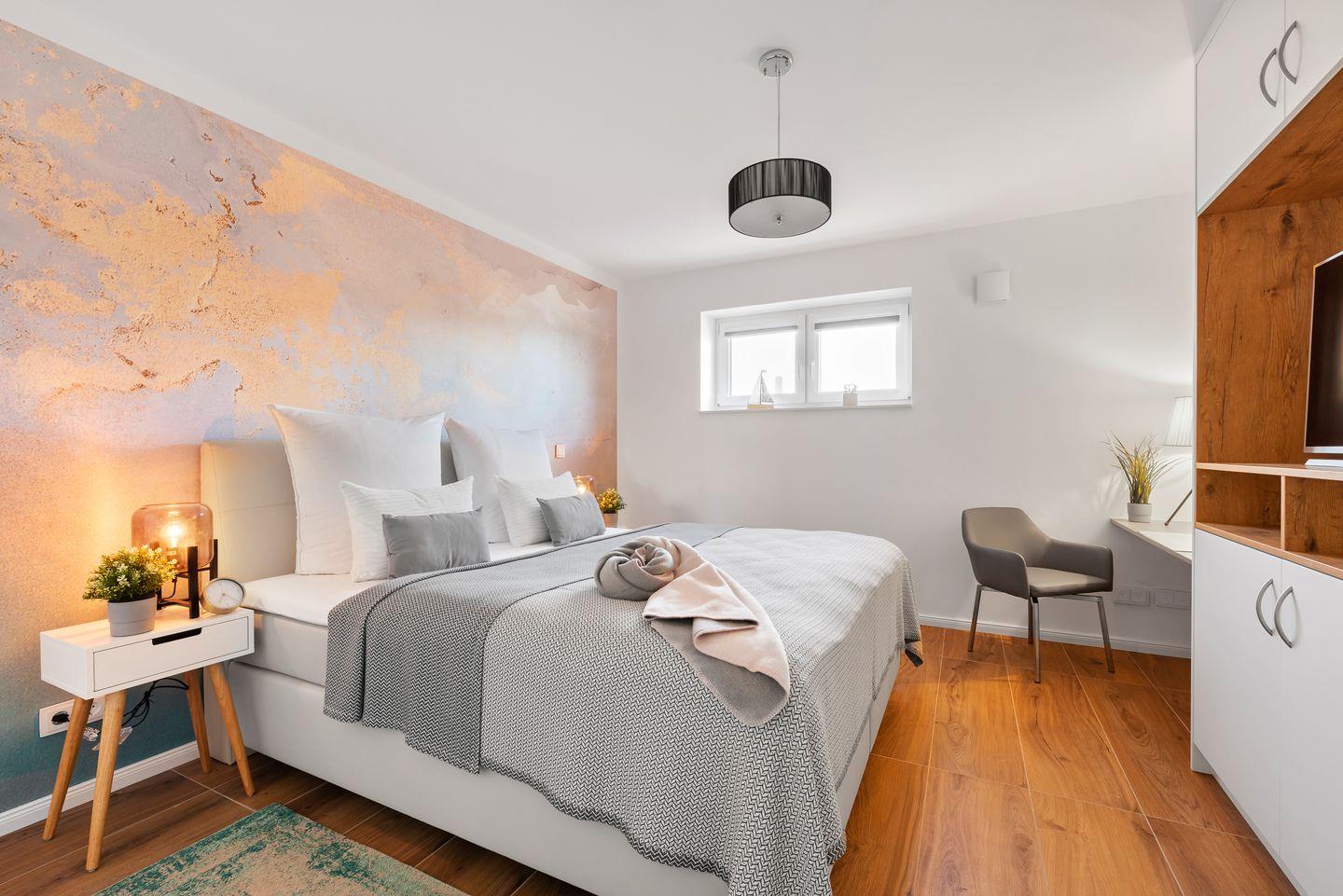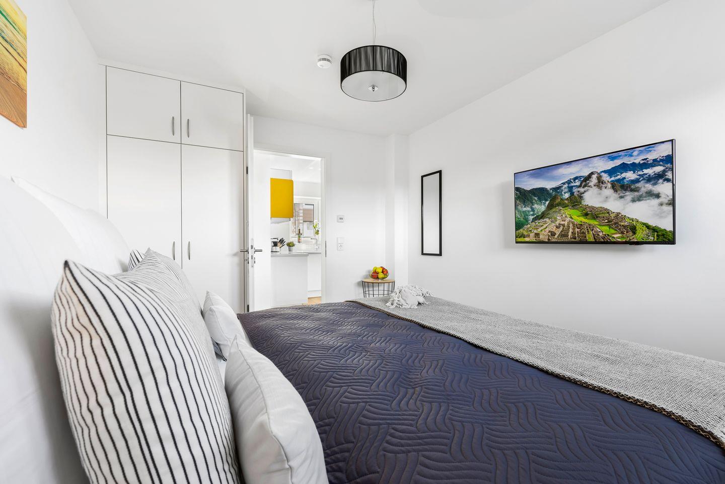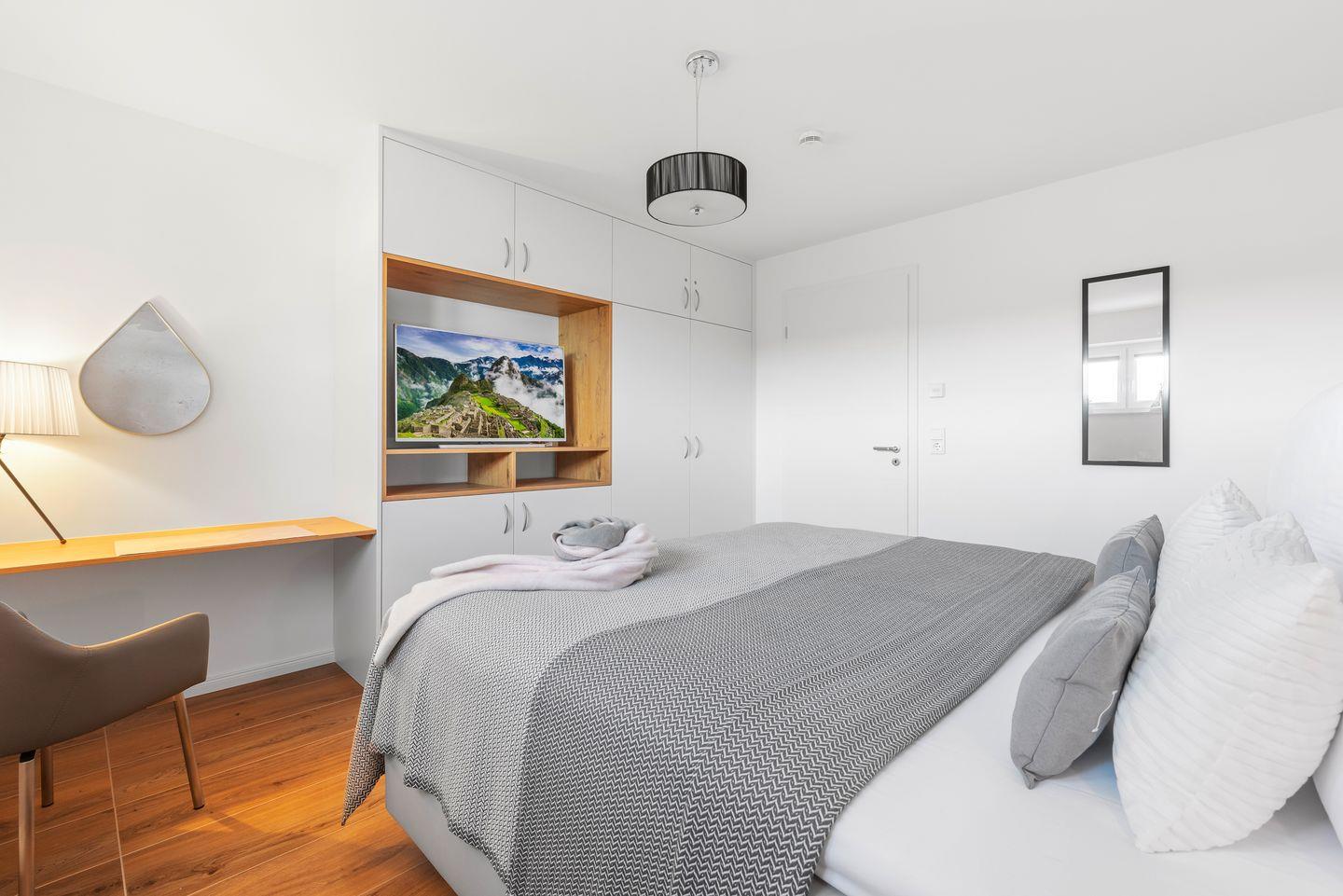 Zwei große Schlafzimmer mit integrierten Kleiderschränken, hochwertigen Boxspringbetten, Schreibtisch und Smart-TV bieten die perfekte Erholung in der Nacht. Das liebevoll eingerichtete Einzelzimmer ist mit Kinderspielzeug, einem Kleiderschrank und kindgerechten Bildern ausgestattet.