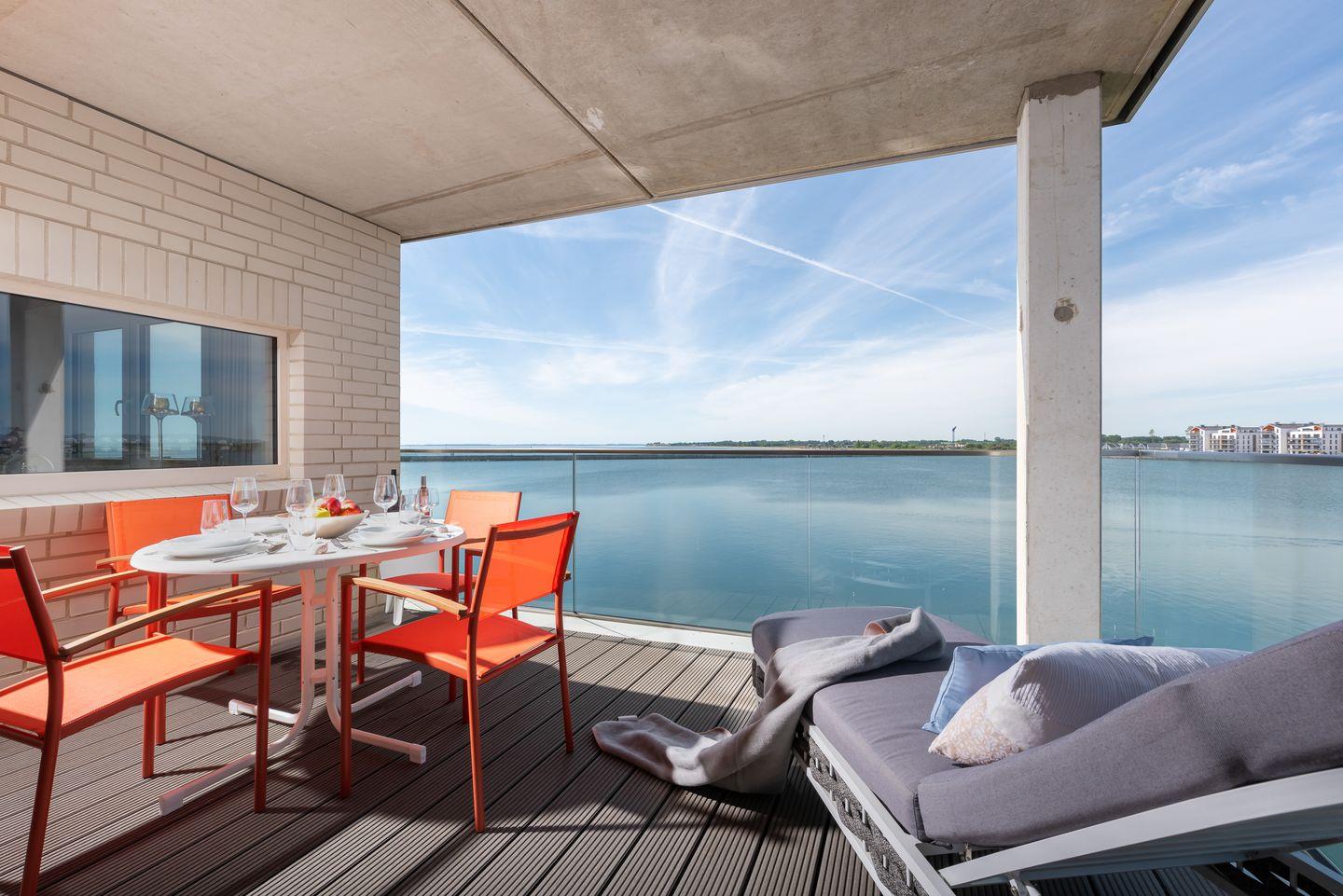 Auf dem großen Südbalkon warten bequeme Bestuhlung und zwei hochwertige gepolsterte Sonnenliegen auf unsere Gäste.
