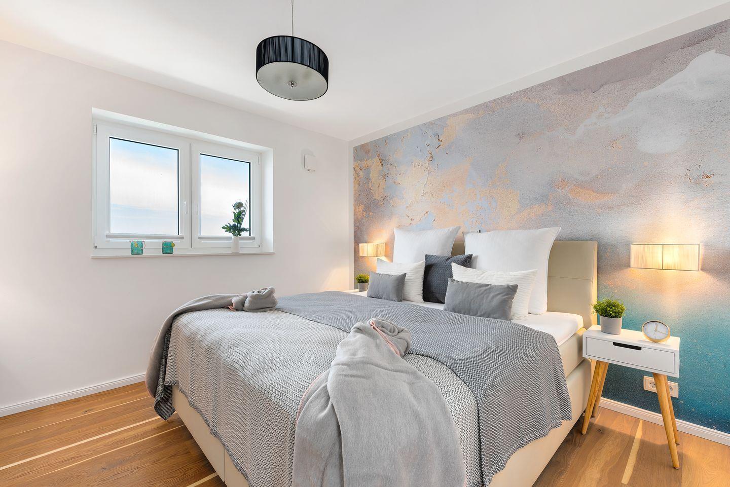 Das großzügige Schlafzimmer mit einem luxuriösen Boxspringbett verspricht erholsame Nächte. Ein weiteres Einzelzimmer, liebevoll eingerichtet und ideal für Kinder, rundet das Wohnangebot ab. Jedes Zimmer gewährt Zugang zur umlaufenden Sonnenterrasse, die zum Verweilen und Sonnenbaden einlädt.