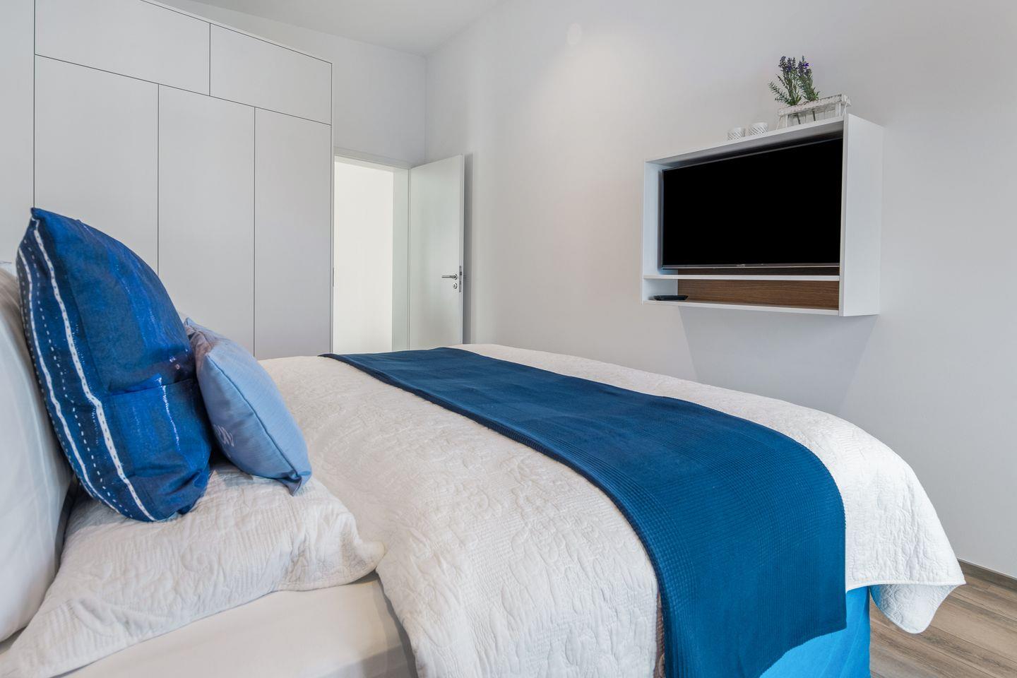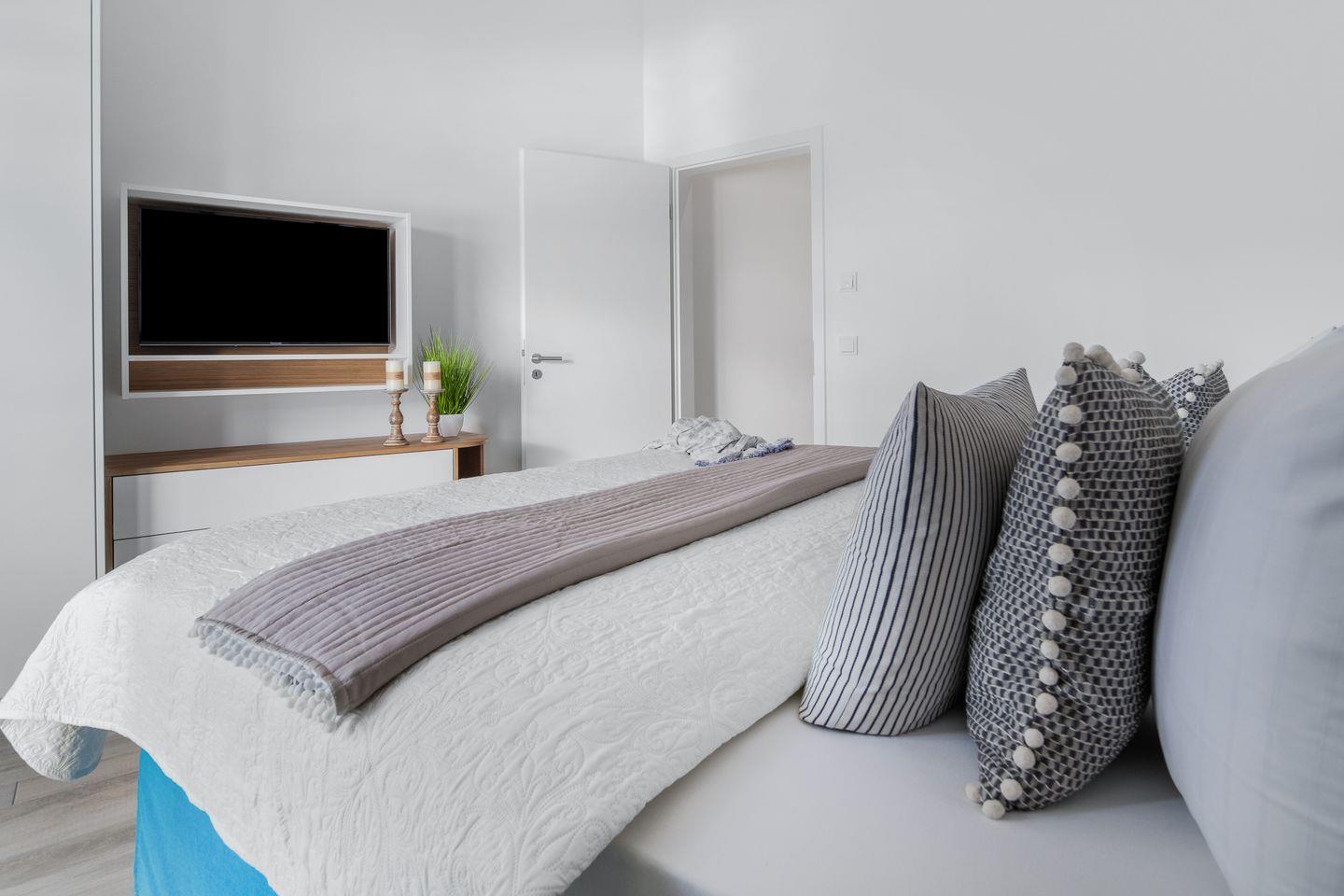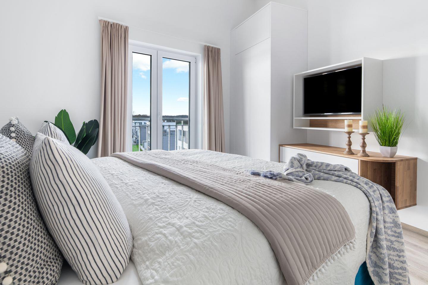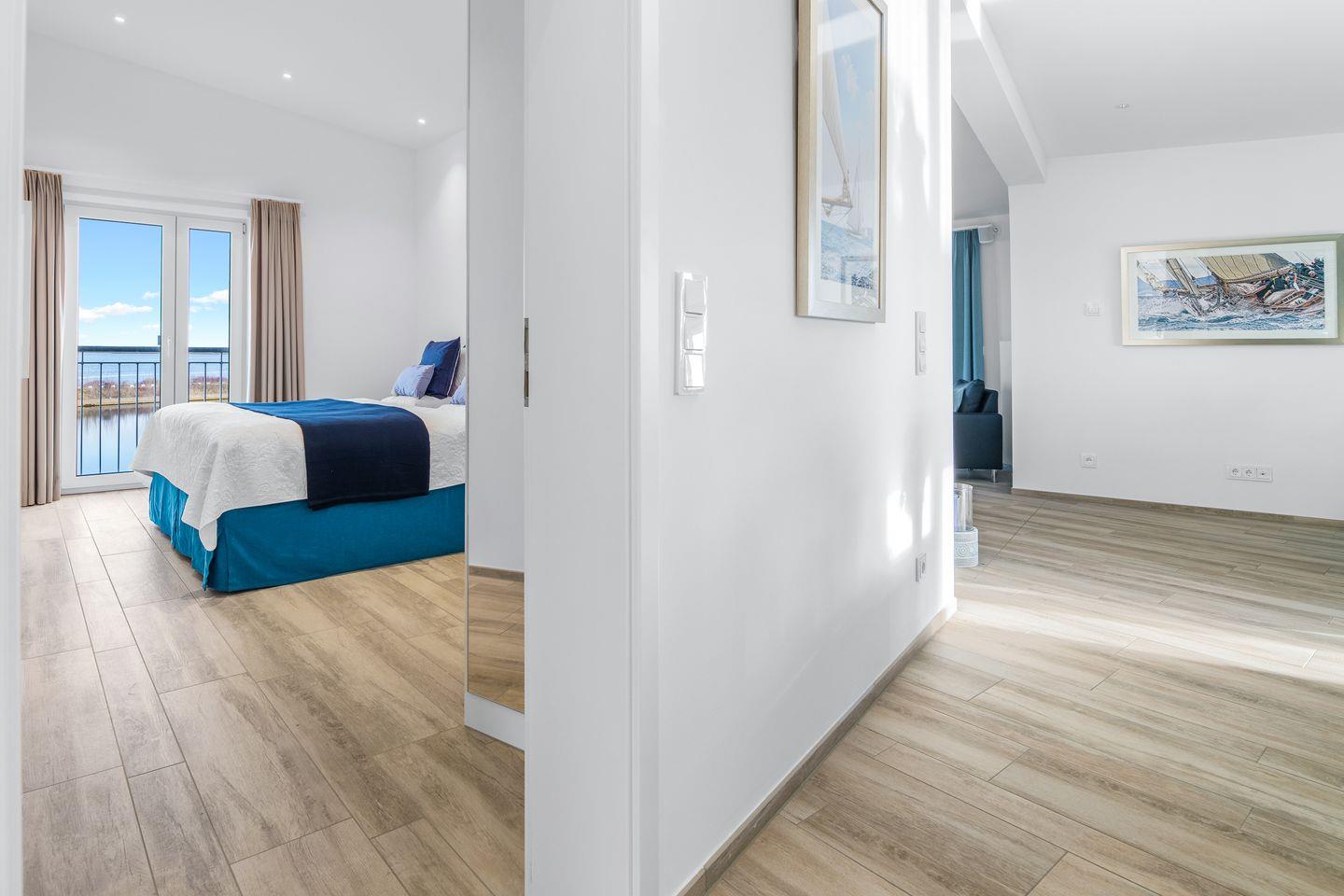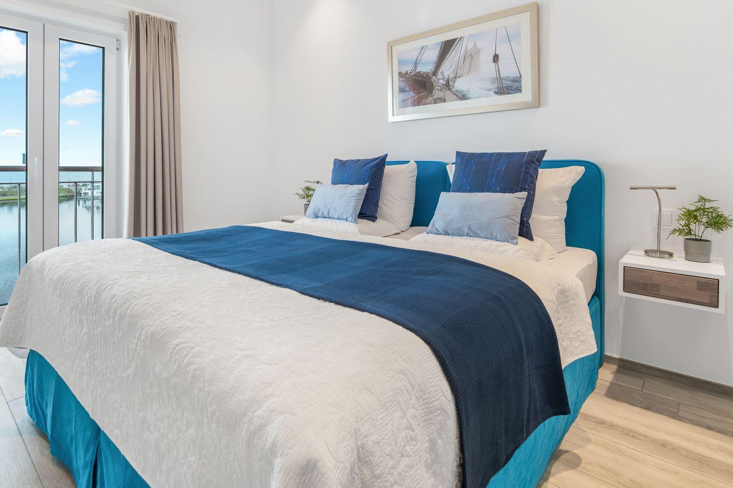 Die Schlafzimmer punkten allesamt mit dem wunderschönen Blick auf das Wasser. Zwei von den insgesamt vier Schlafzimmern haben direkten Zugang zu den beiden Dachterrassen (22 m² und 44 m²). Beim morgendlichen Kaffee lässt sich der Sonnenaufgang und der Schiffverkehr beobachten. Für die perfekte Entspannung stehen dort zwei gemütliche Lounge Möbel. Drei Schlafzimmer verfügen über 1,80m große Boxspringbetten. Das vierte Schlafzimmer ist mit einer Schlafcouch für bis zu zwei Personen ausgestattet.