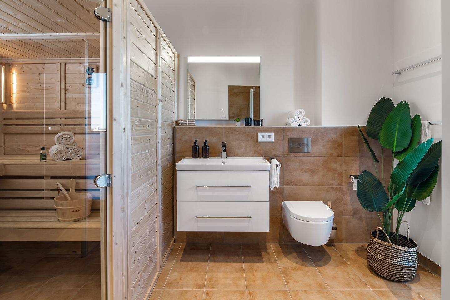 Das Penthouse ist komplett mit Fußbodenheizung ausgestattet. Eine finnische Sauna, Regendusche und Kaminofen versprechen Komfort zu jeder Jahreszeit. Für zusätzliche Unterhaltung an Schlechtwettertagen sorgt die über W-Lan/Bluetooth ansteuerbare Sonos Anlage oder der Smart TV.