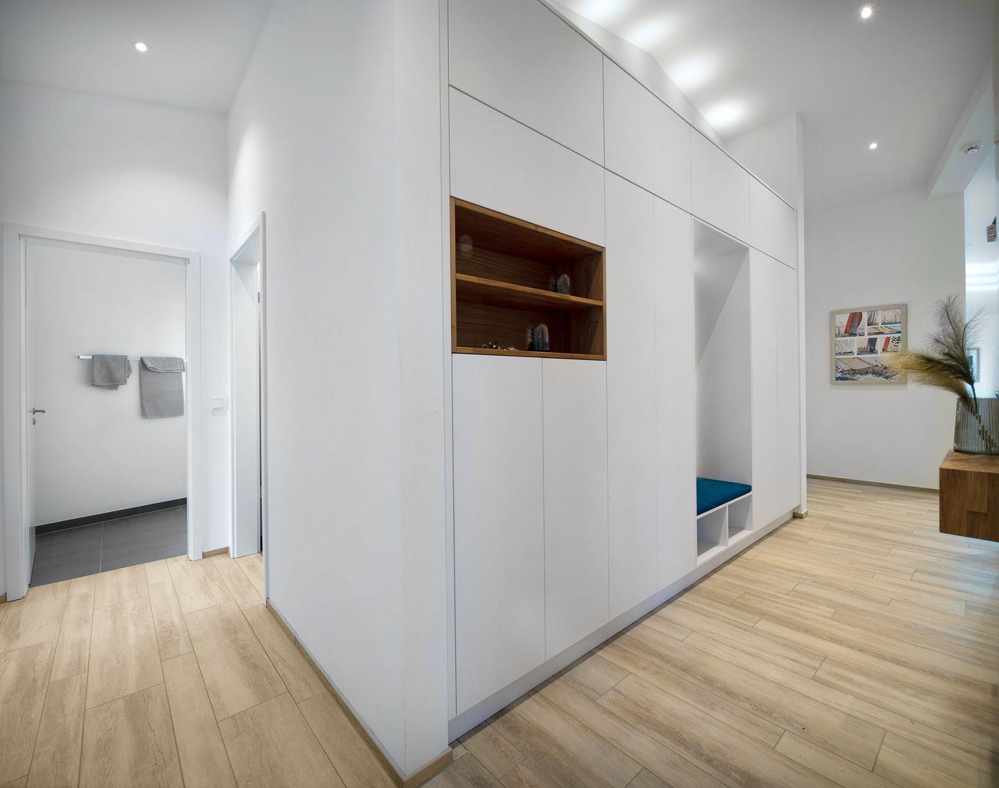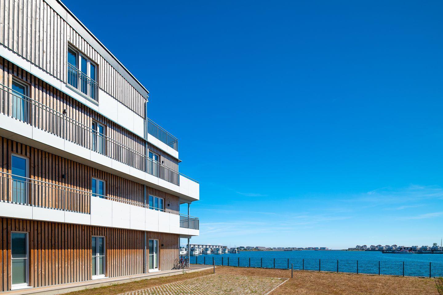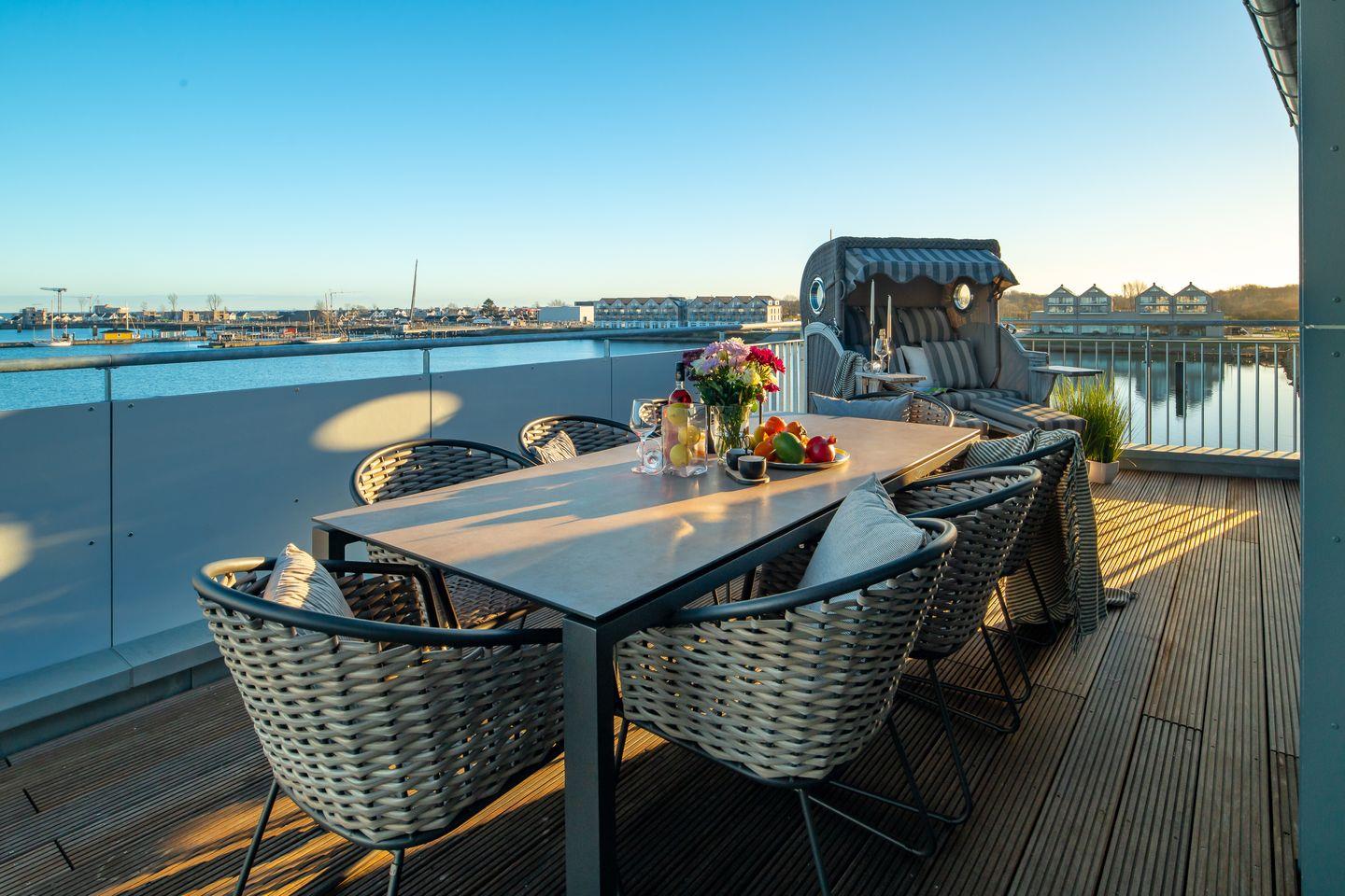 Der offen gestaltete, lichtdurchflutete Wohn- und Essbereich lädt zu kulinarischen und geselligen Abenden ein. Am großen Esstisch finden 8 Personen bequem Platz. So können Sie beim Dinner den Blick über das Wasser durch die riesigen Panoramafenster genießen. Die Küche lässt keine Wünsche offen, sie ist rundum ausgestattet und bietet Hobbyköchen Komfort in Ausstattung und Design. Vom Frühstücken in der Morgensonne bis hin zum gemeinsamen Sundowner auf der fast 44 m² großen Dachterrasse mit Blick auf den Hafen, die Schlei und die Ostsee ist alles möglich.