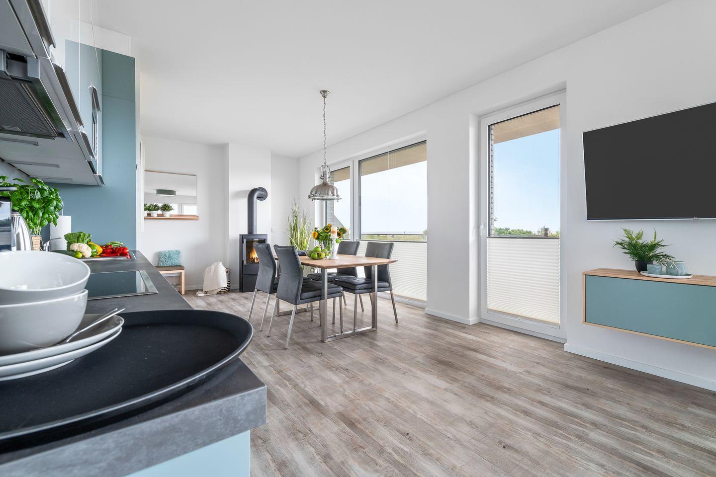 Ostseeurlaub in moderner Ferienwohnung mit Meerblick Terrasse direkt am Weidefelder Strand - Genießen Sie exklusives Wohnen im Apartment "BeachTerraceOne", gelegen im Erdgeschoss eines modernen Hauses mit Aufzug - Im Treppenhaus befinden sich 9 Stufen vom Eingang bis zur Wohnung. Die lichtdurchfluteten Räume mit bodentiefen Fenstern bieten einen spektakulären Meerblick direkt auf die Ostsee und laden zum Verweilen und Entspannen ein.