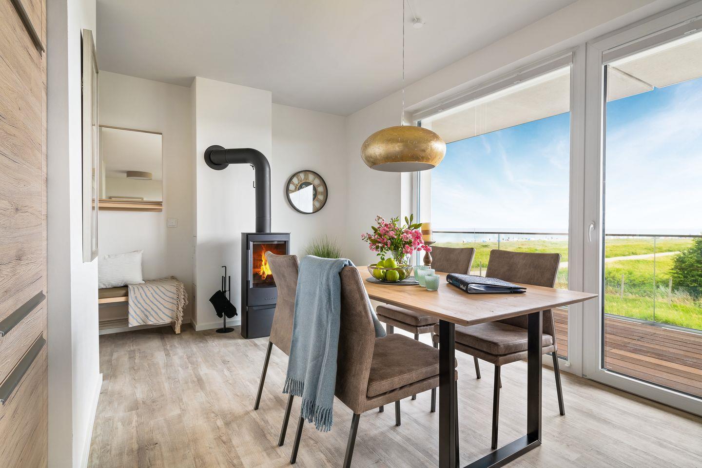 Der großzügige Wohn- und Essbereich ist der perfekte Ort für gesellige Stunden. Ausgestattet mit einer vollintegrierten Küche, können Sie hier leckere Mahlzeiten für Familie und Freunde zubereiten, während Sie den Blick auf die vorbeiziehenden Segelboote genießen. In der kühleren Jahreszeit sorgt der Kamin für gemütliche Atmosphäre.